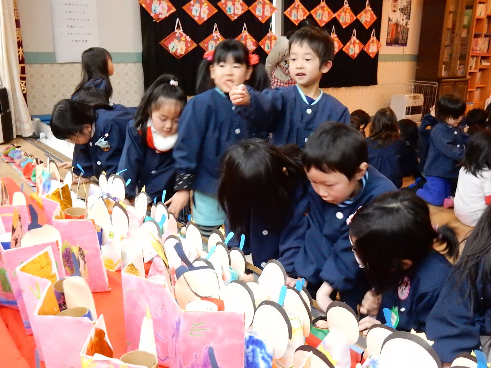 小さいクラス、大きいクラス、それぞれのお雛様を見てみると、『あっ!髪の毛もあるよ♪』、『かわいい顔してるね!』、『作り方、一緒やなぁ!』いろんな発見がありました。