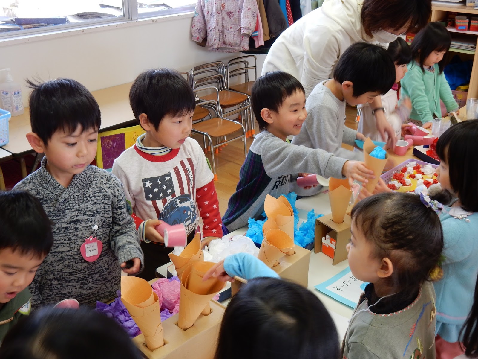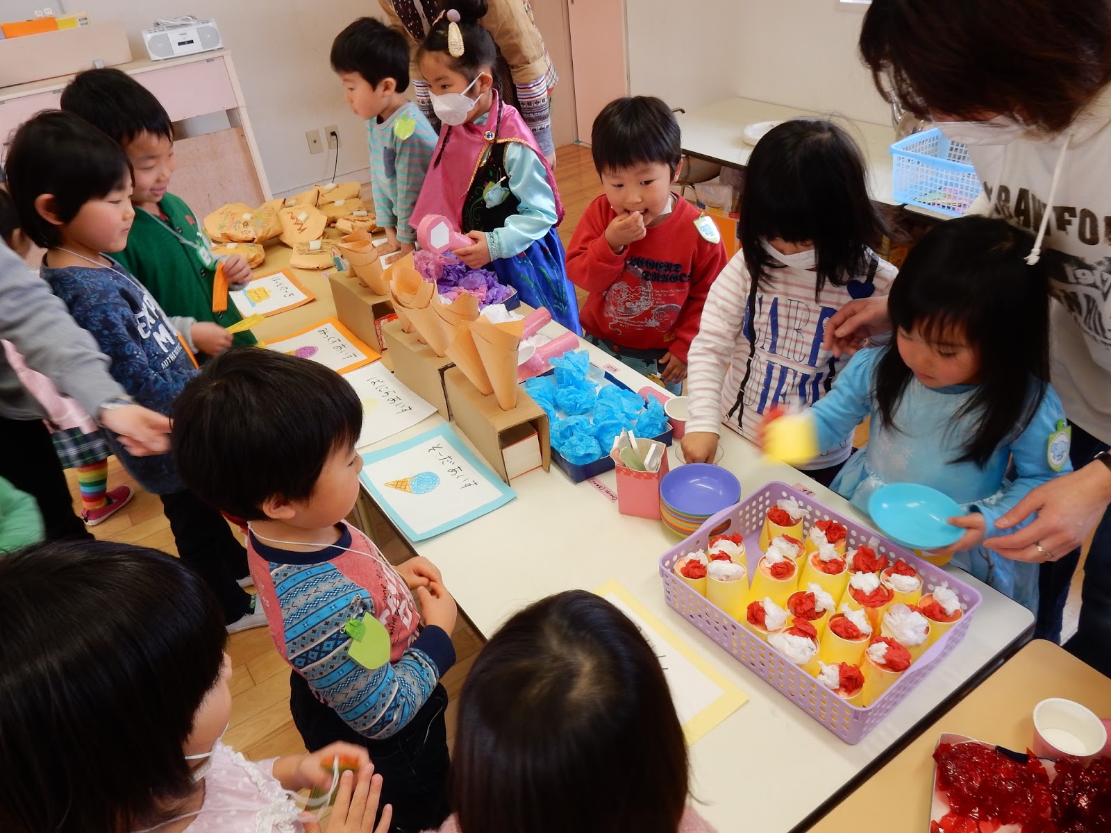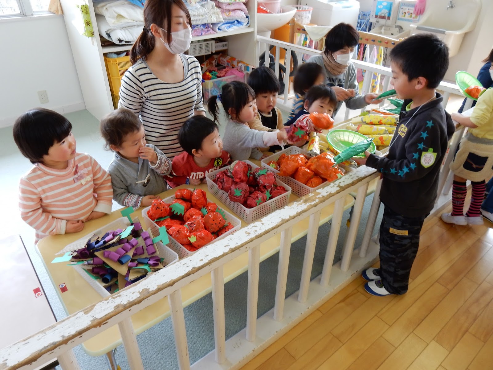 今日は、インフルエンザでお休みする子が多かったので、また来週、もう1回みんなでお店屋さんして遊びたいね!と話をしています!今日遊べなかったお友達も、元気になったら一緒に遊ぼうね♪