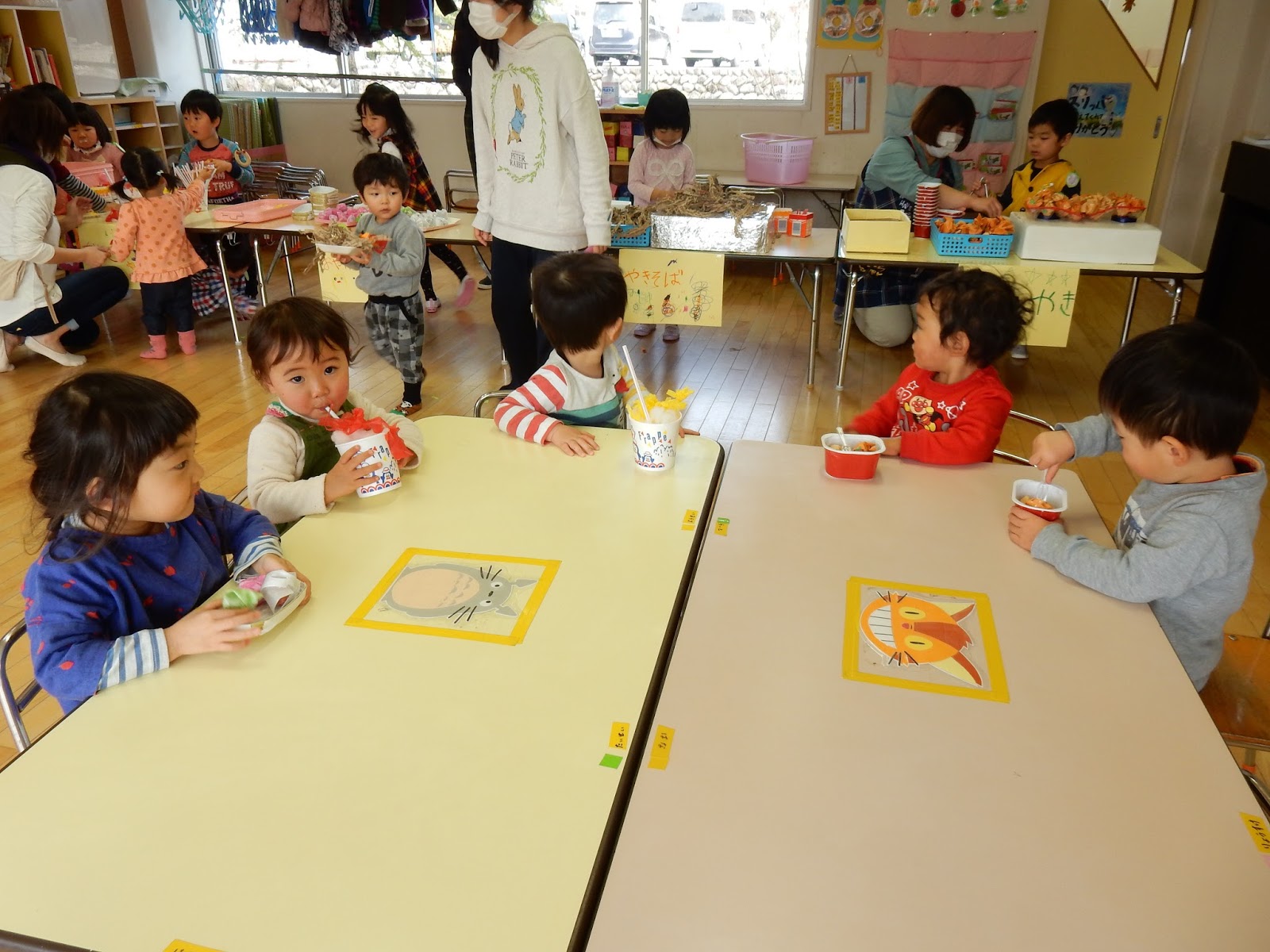 お店屋さんはもちろんですが、『おいしいね』、『なに食べてるの?』などと、違うクラスのお友達と会話しながら食べるマネっこをしている姿もとってもかわいらしかったです。