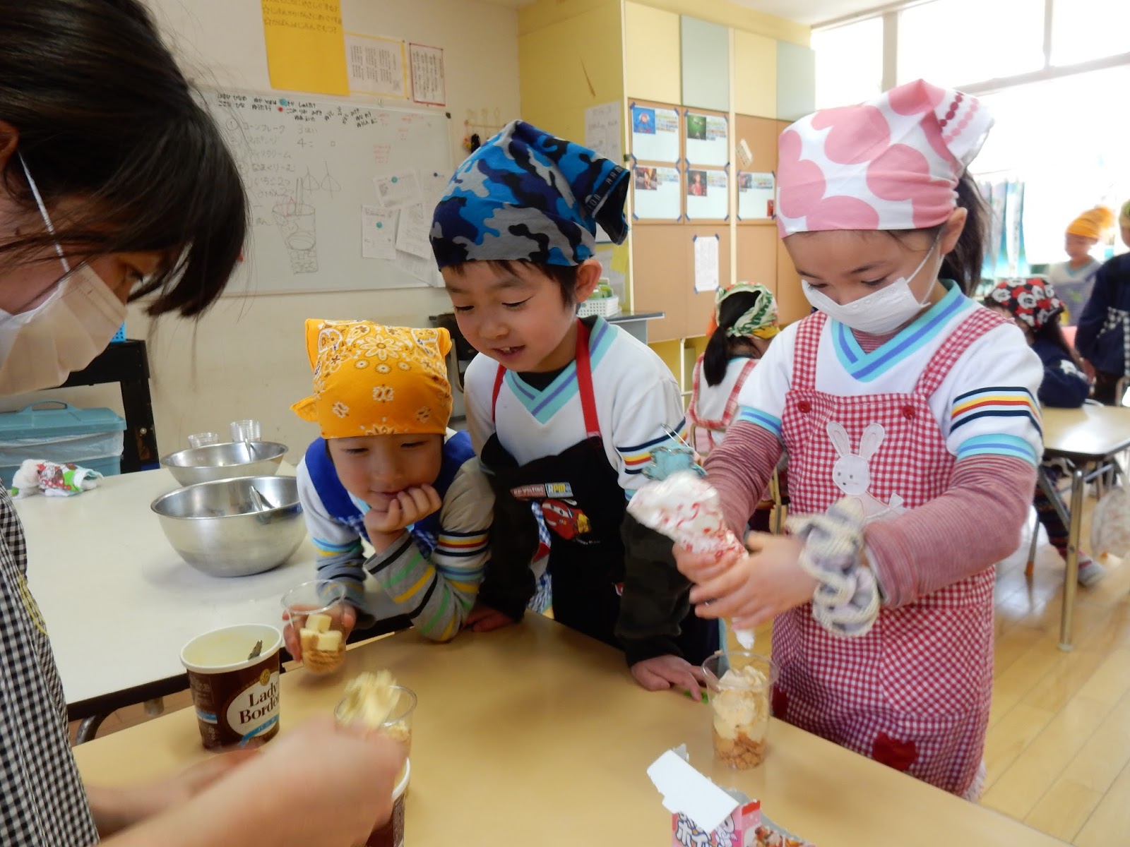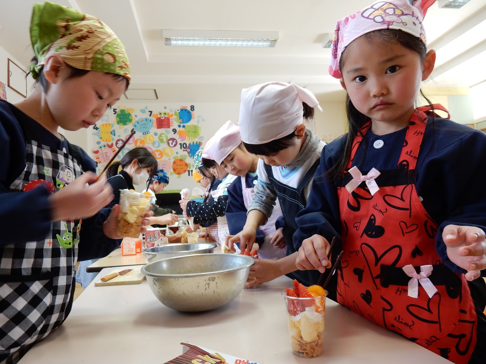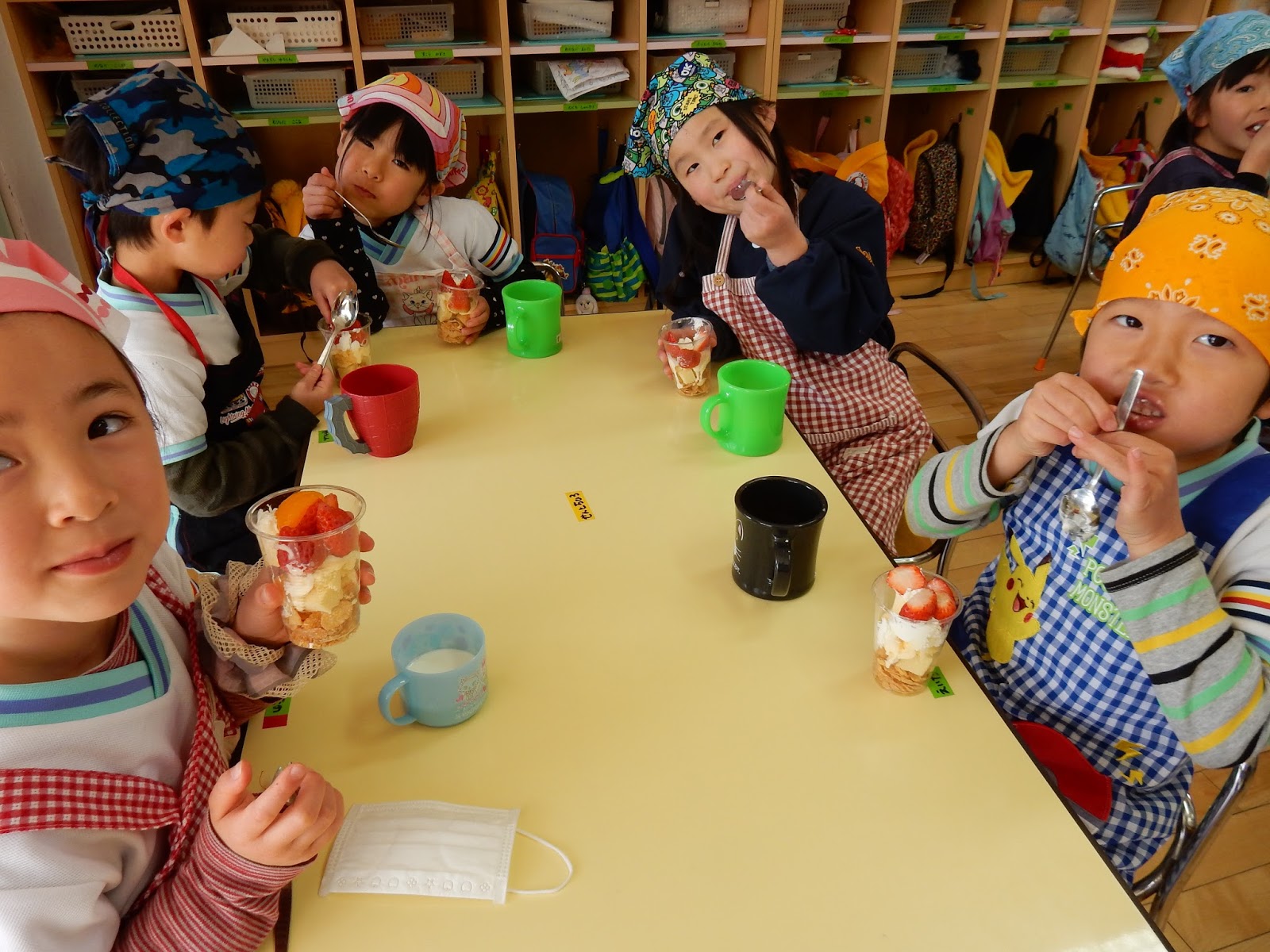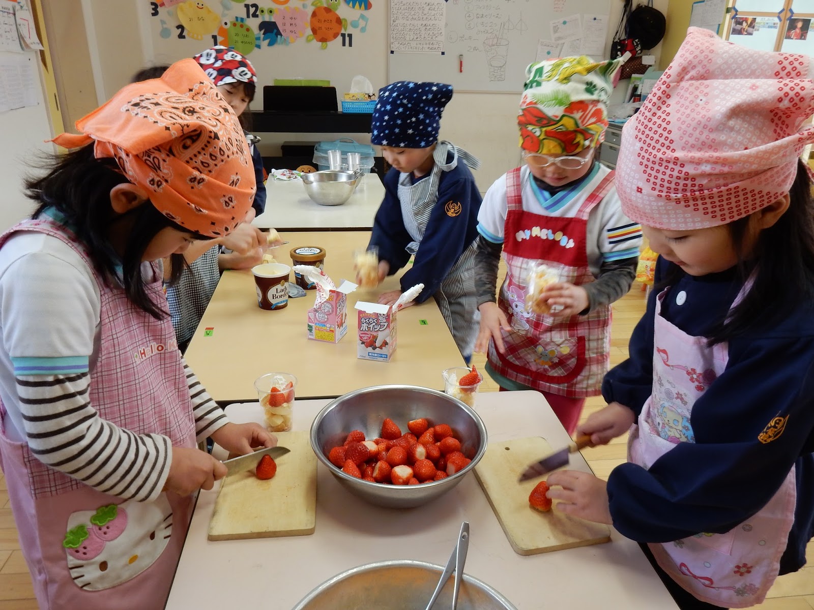 この時期、各クラスでは、みんなで一緒に楽しい活動をしよう!と色々な事を計画します。そのうちの1つ、クッキングです!今日は、ひまわりさんが、最後のクッキングをしました。