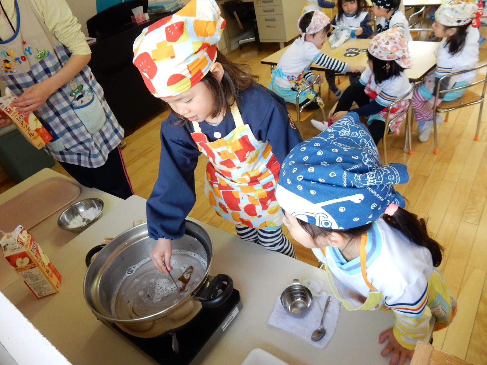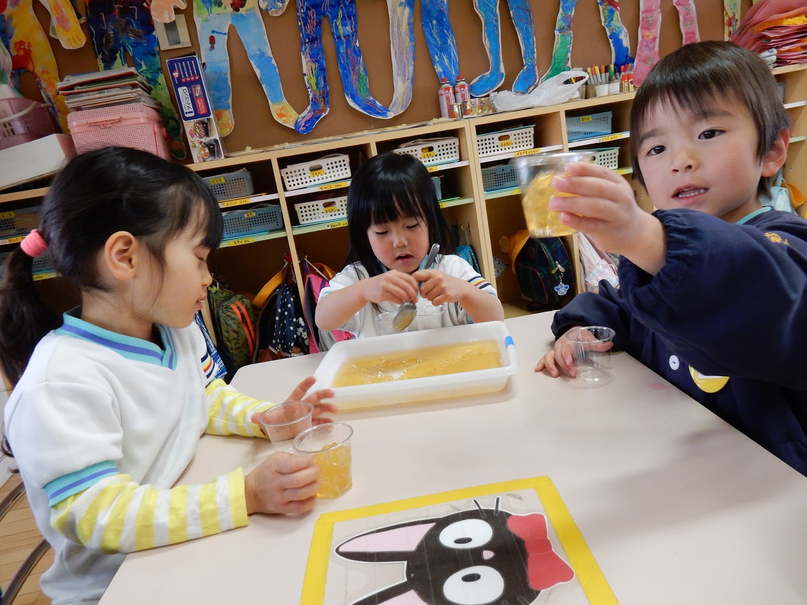 鍋に入っているのは、りんごジュースです。ここに、ゼラチンの粉を入れ火にかけ、溶かしていきます。まぜまぜ…りんごの他に、ぶどうジュースも使って、2色のぜりーをつくります。甘くてとってもいい匂いが廊下までただよってきました!