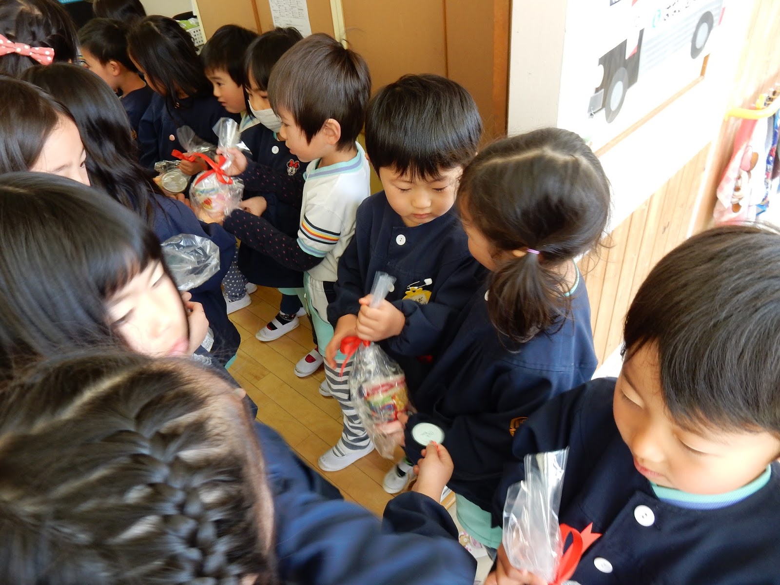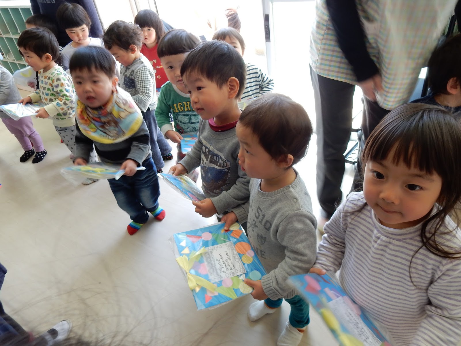 その後お部屋に戻ってから、ひまわりさんにプレゼントタイム。各クラス、子どもたちが手作りしたとっても素敵なプレゼントを持ってお部屋に来てくれました。