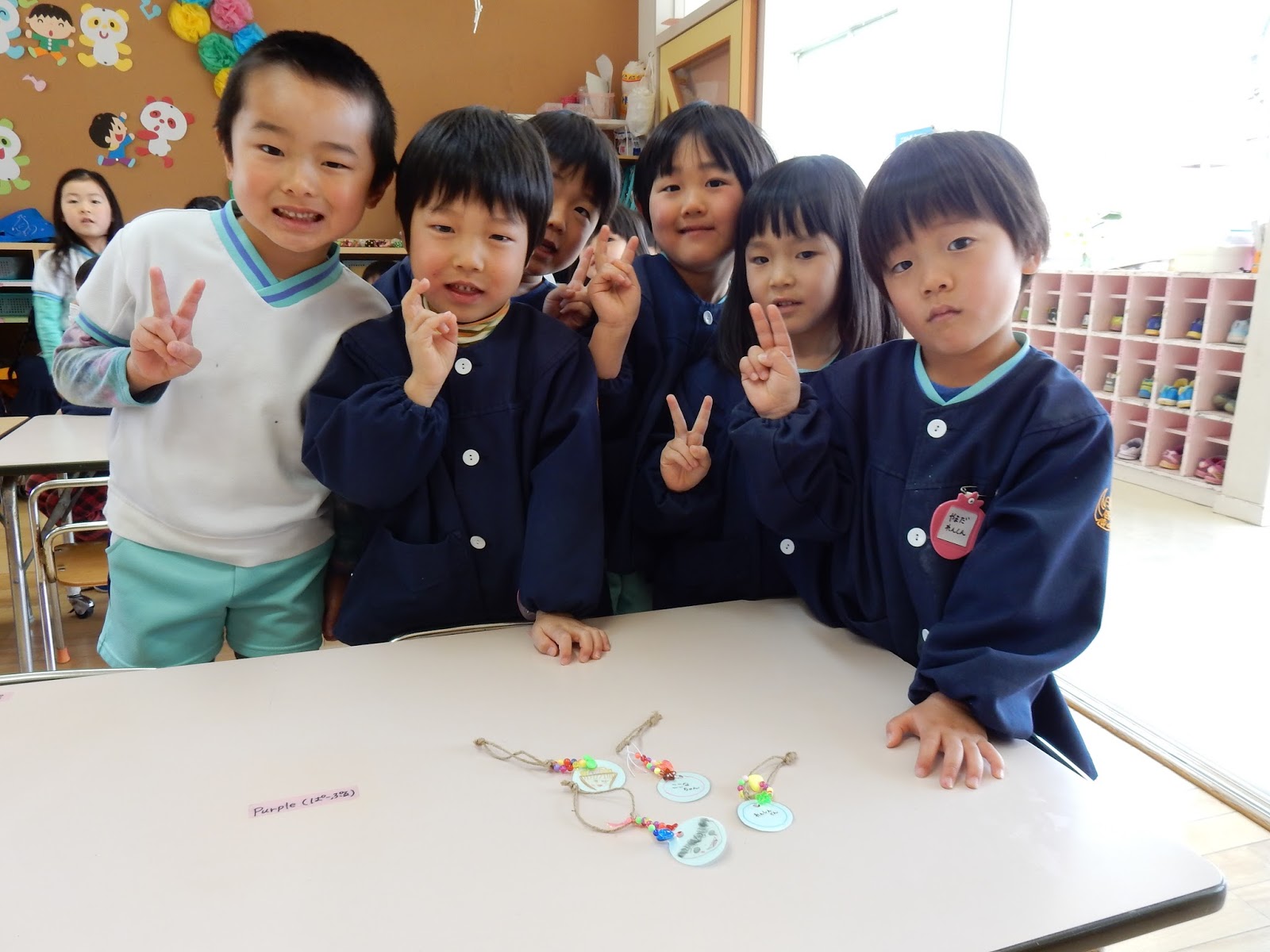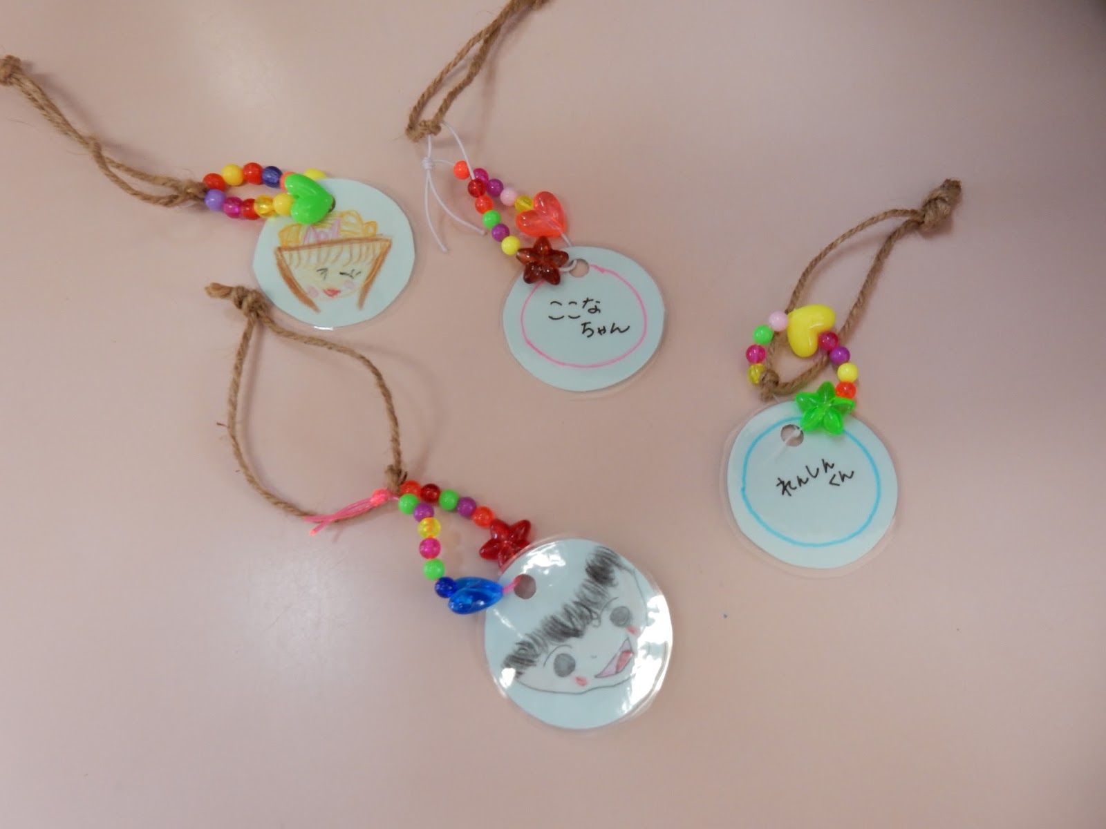 ひまわりさんからも…とってもかわいい贈り物。一人ひとりの名前と、似顔絵の入ったストラップです。こちらももちろん手作り!1つ1つ、お友達の顔を思い浮かべながら作ってくれました。