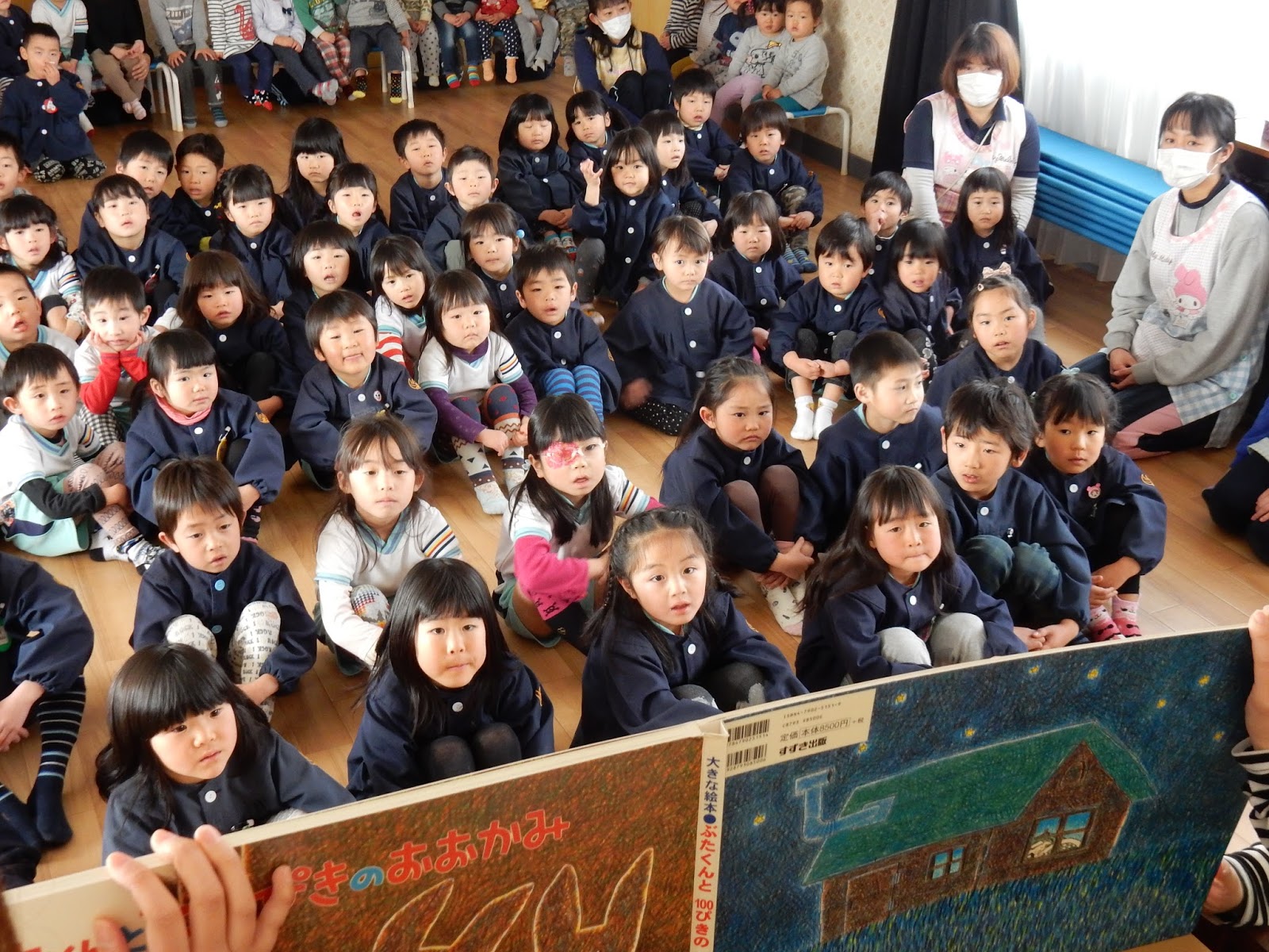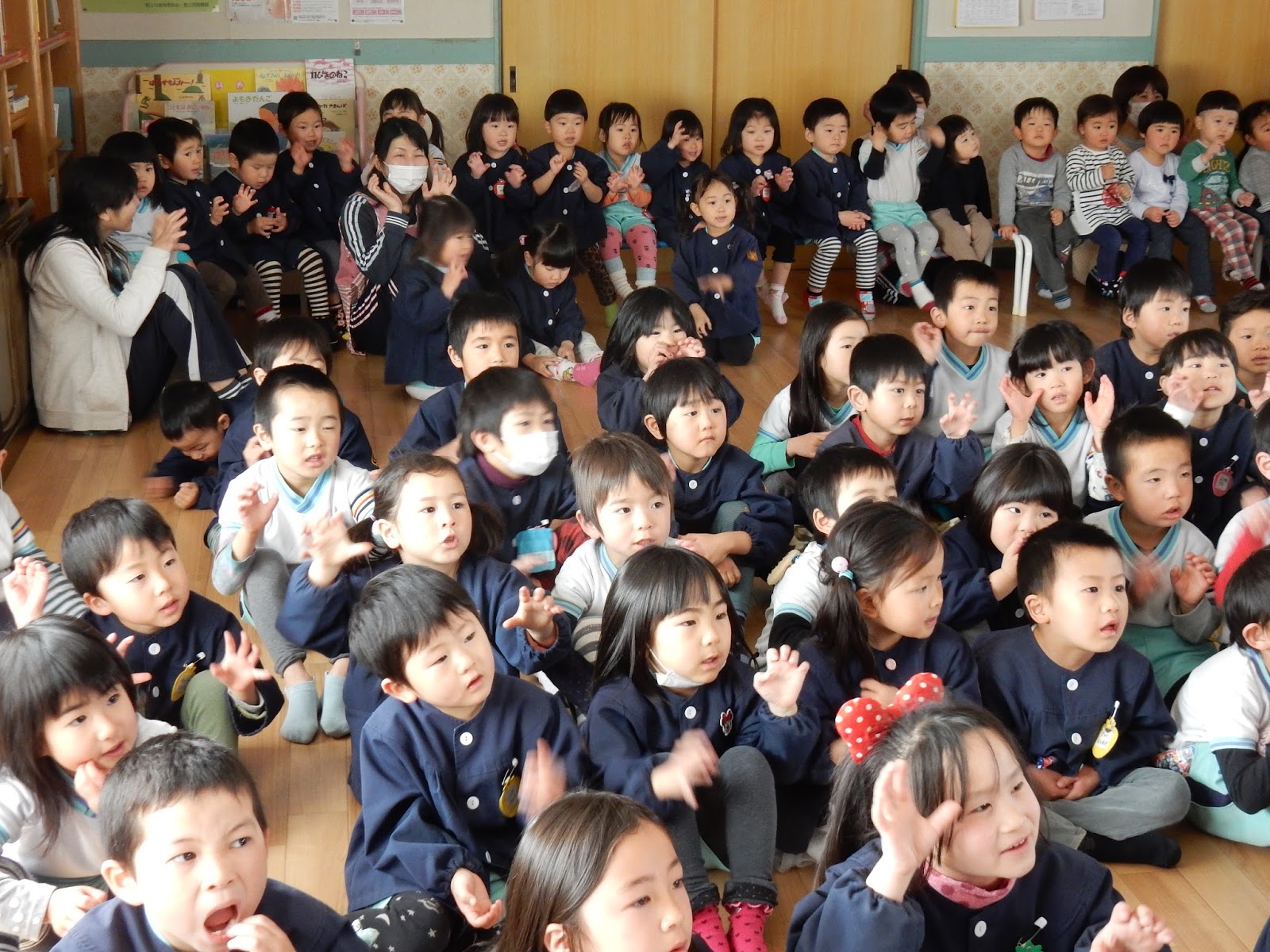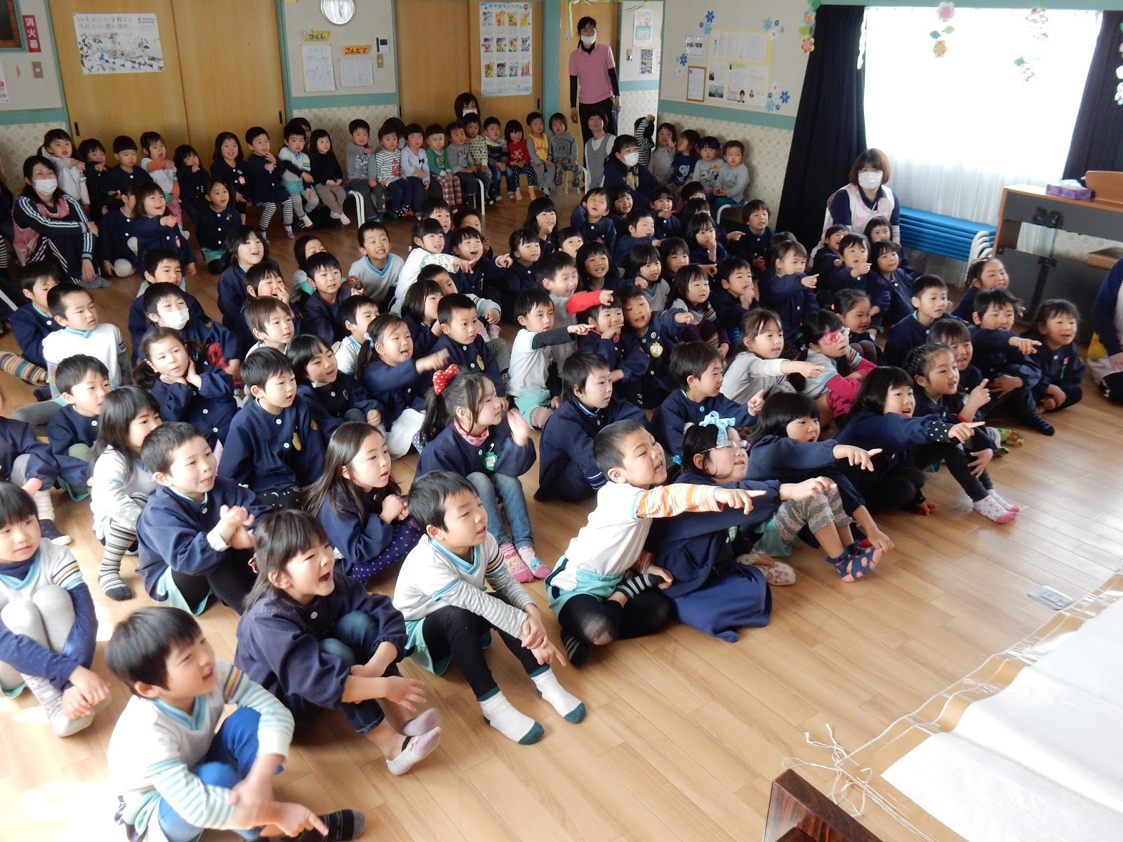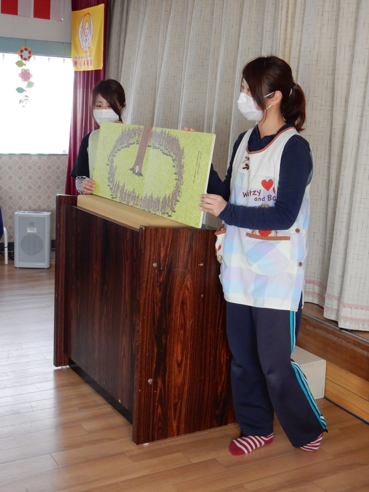 大きな絵本に、大きな紙芝居、大きなペープサートもありました!ひまわりさんはもちろん、他のクラスのお友達も大盛り上がりで見ていました!