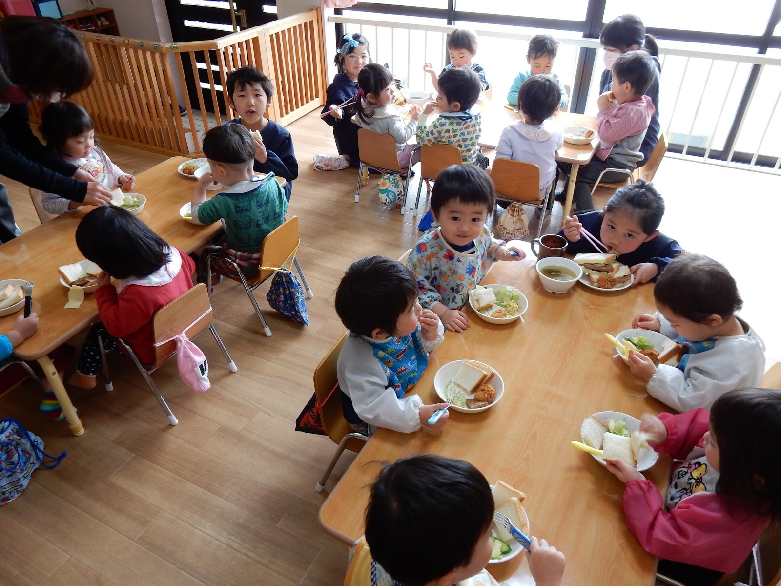 その後の給食も、ひまわりさんと一緒。わいわいデーのグループに加えて今日は、すみれさんや、ひよこさんのお部屋にも行ってきました。
