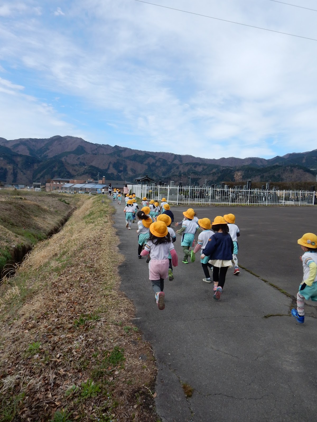園庭横の農道を走っていく子どもたち。クラスごとに距離が決まっていますが、なかなかたくさん走りますよ!(笑)先生たちに負けないように、よ~いどん!!これからどんどん速く走れるようになって行く事と思います!