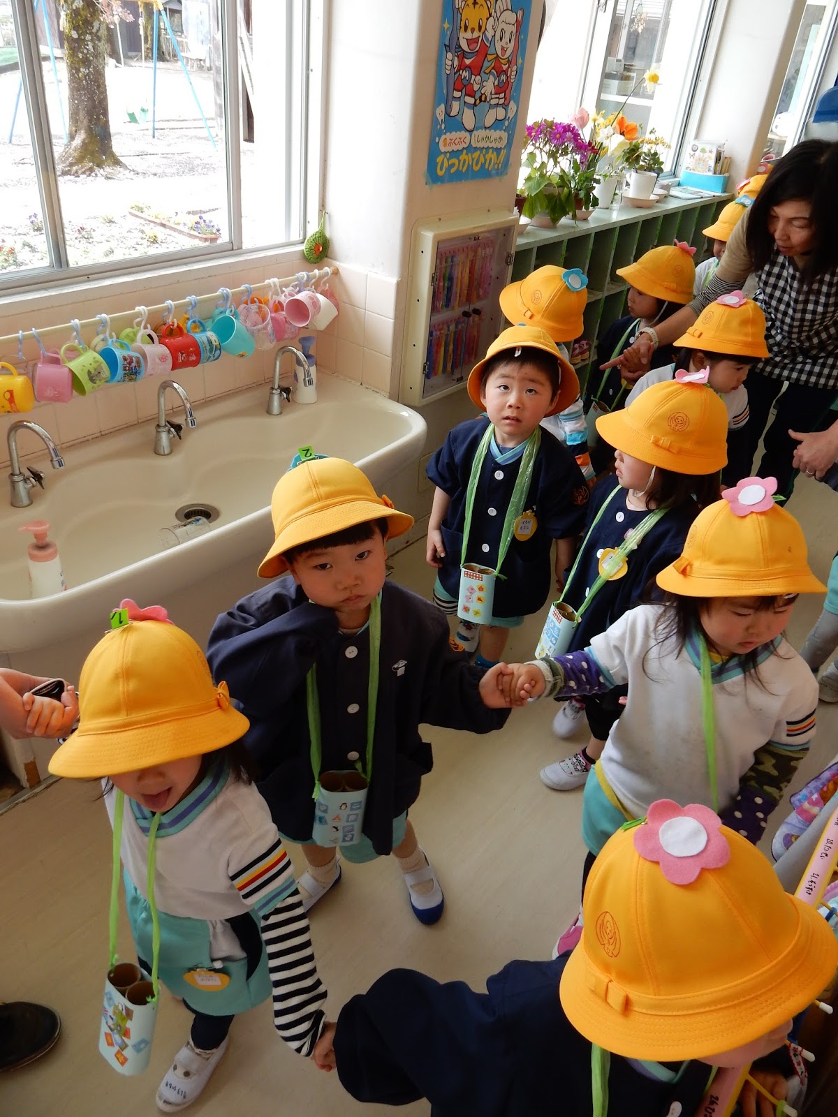 すみれさんとひよこさんは、給食までの時間、お散歩に出掛けました。交通量の少ない農道をテクテク歩いていきます。お花を摘んだり、昆虫を見つけたり、のんびりお出かけできる環境が素敵ですよね!お散歩から帰ってきたひよこさんの手には、牛乳パックの小さなカバン。中には、たんぽぽの花や、ムスカリがたくさん!今日のお土産ですって♡
