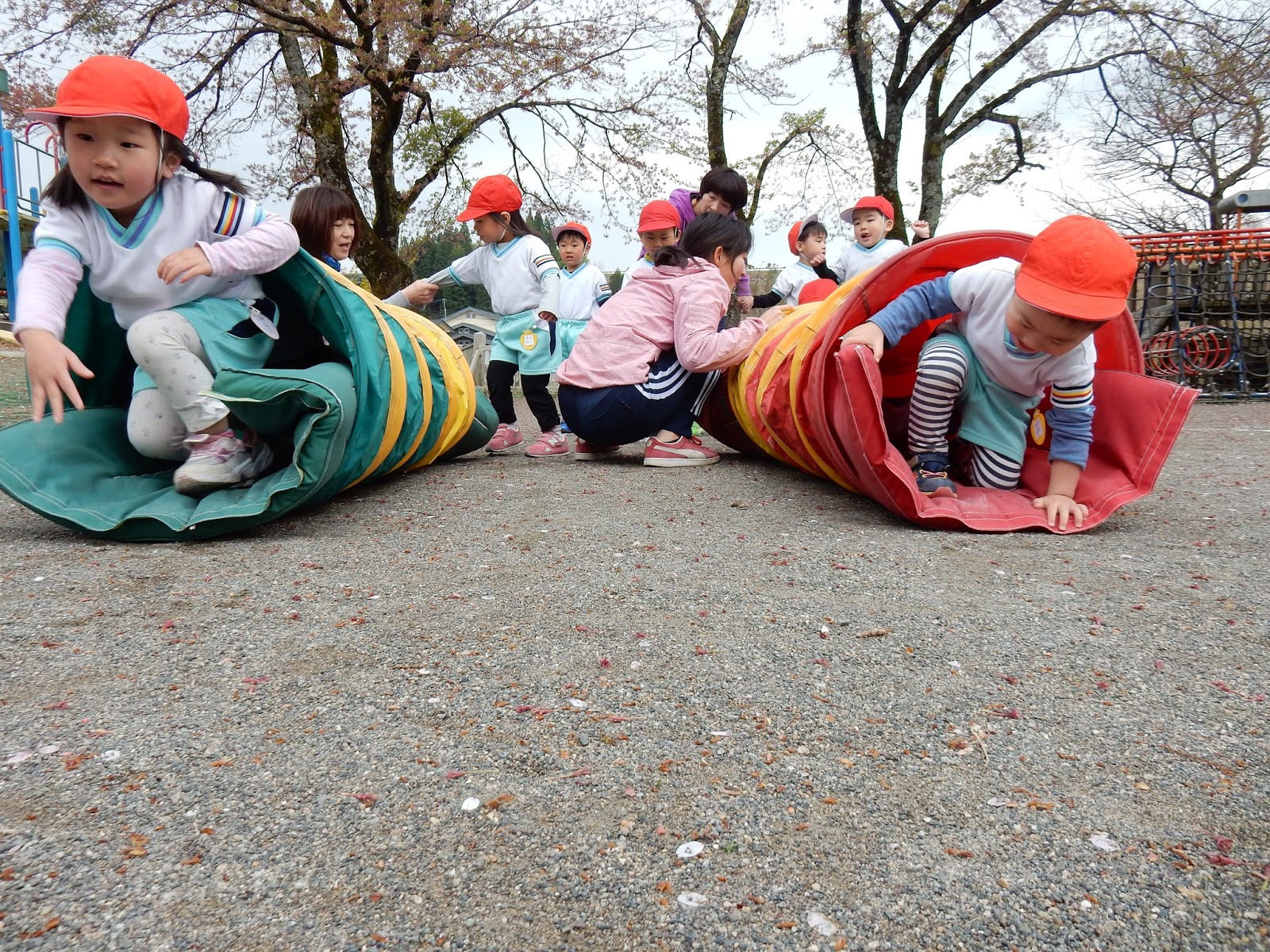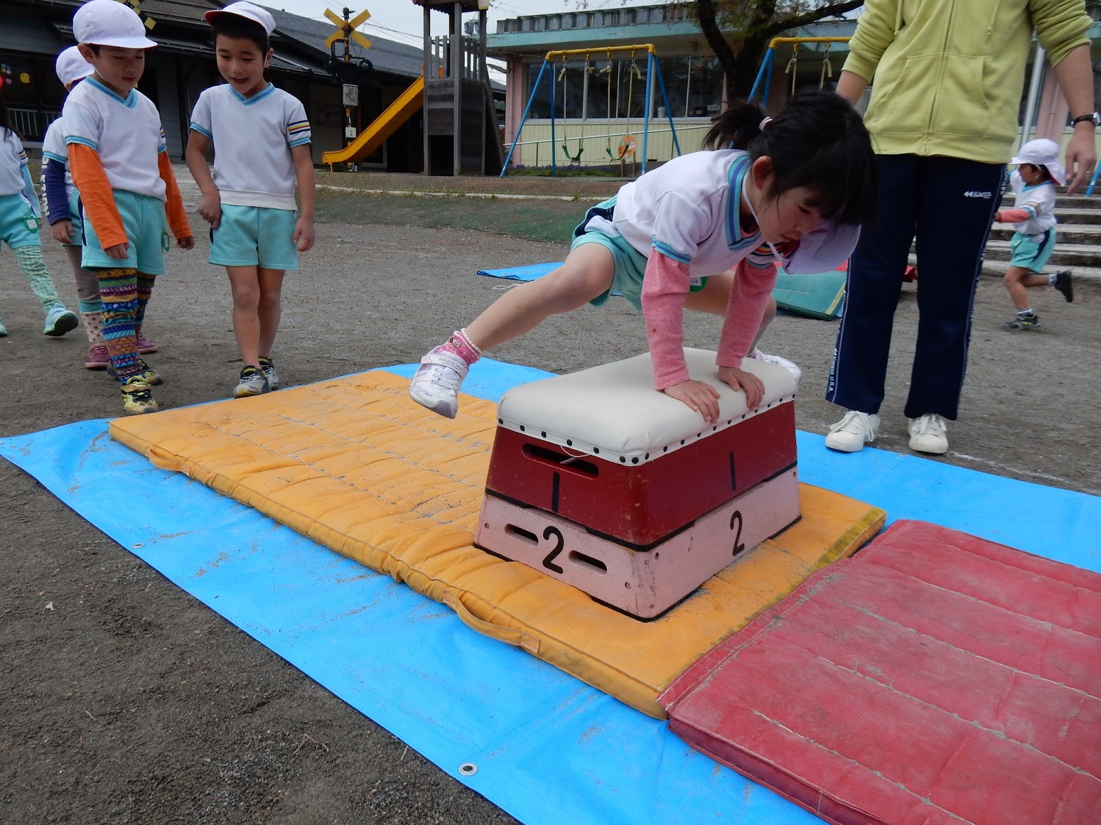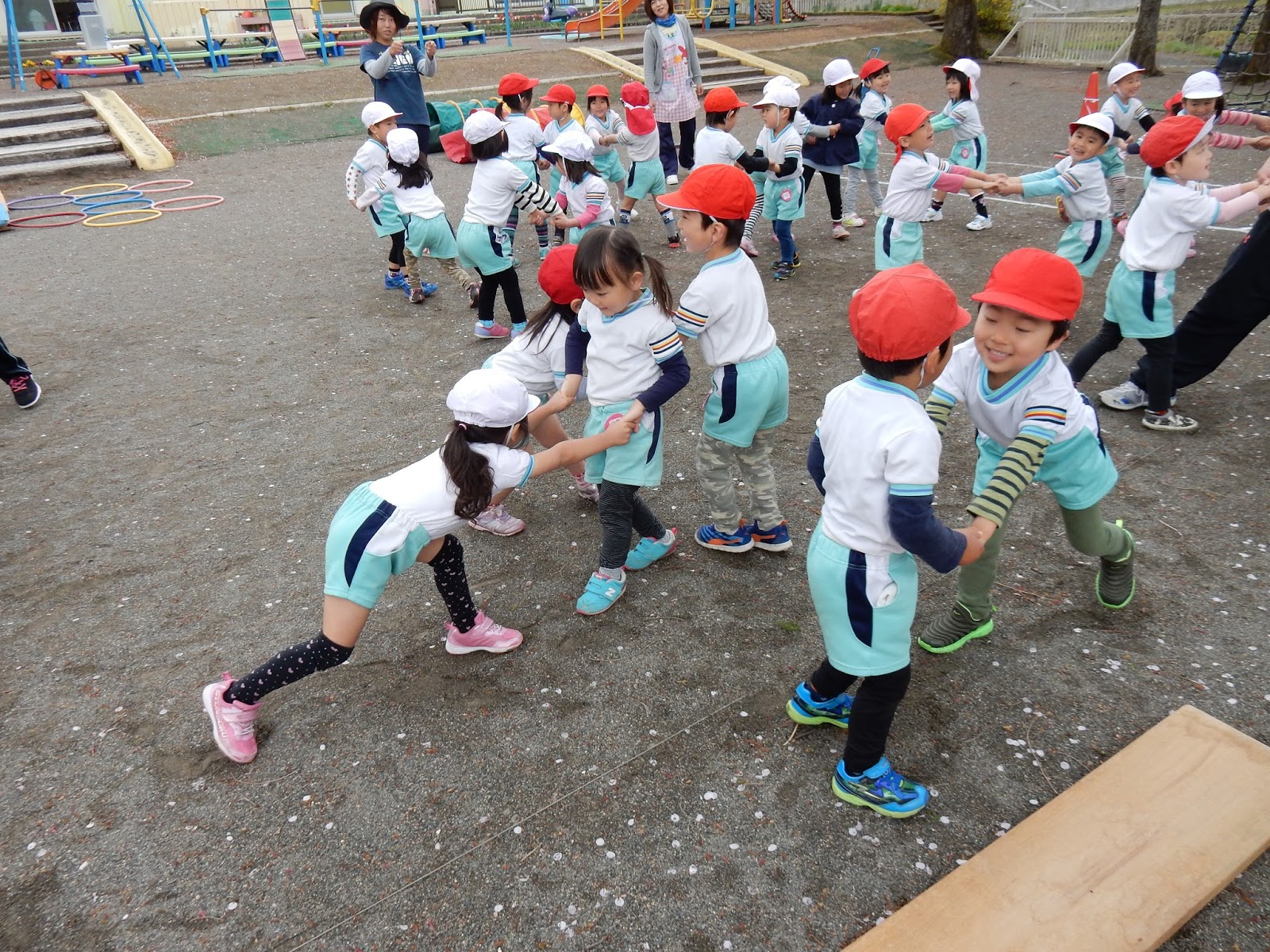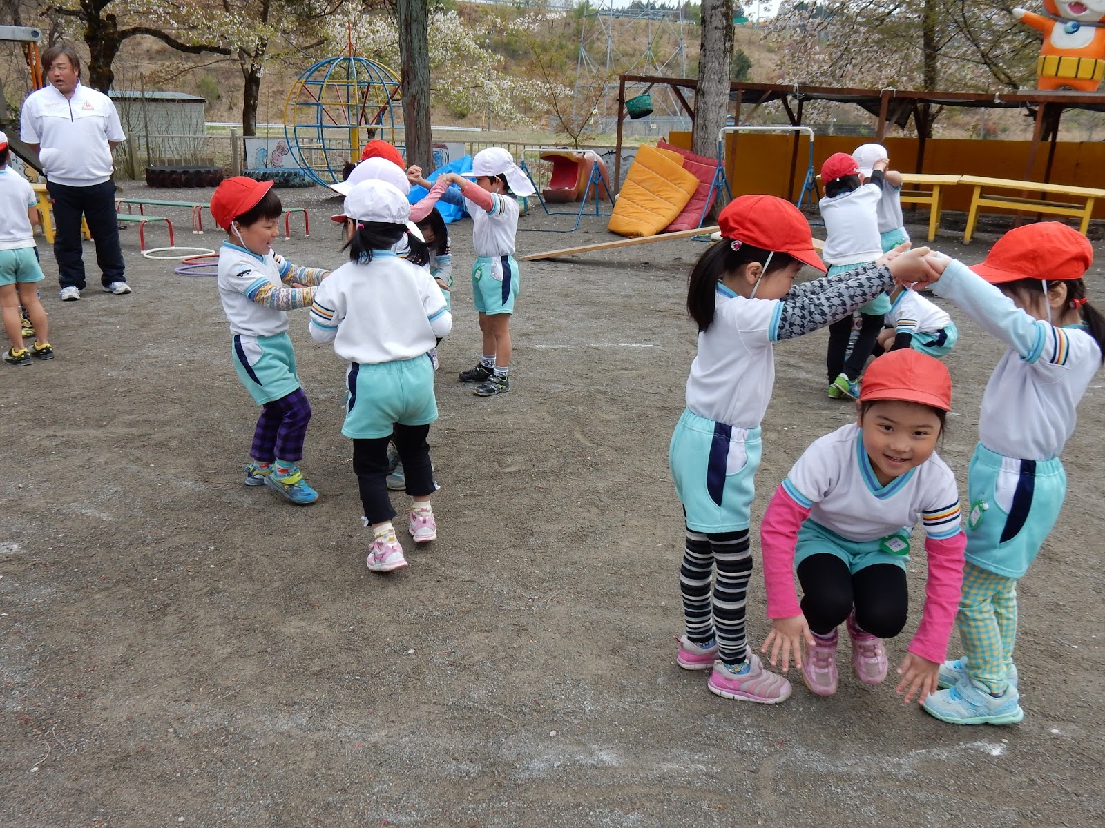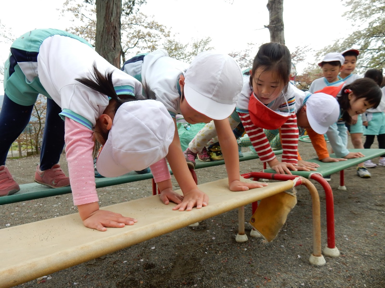 ゆりさんは、二人組で触れ合い遊び。おしりのたたき合い、足の踏みあい、手押し相撲…先生の指示をしっかり聞いて運動です。2人でやることで、お互いの力加減を調節したり、相手のことを思いやりながら体を動かします。手と足をしっかり伸ばして進む“熊歩き”は、いろいろな運動の基本。手足、腰などの筋力もアップ!クマ牧場の熊さんに変身して、飼育員さんの所までエサをもらいに行きました(笑)遊びの中に取り入れることで、子どもたちもキャーキャー言いながら頑張ります!こういった運動が、跳び箱などにもつながっていくんです。