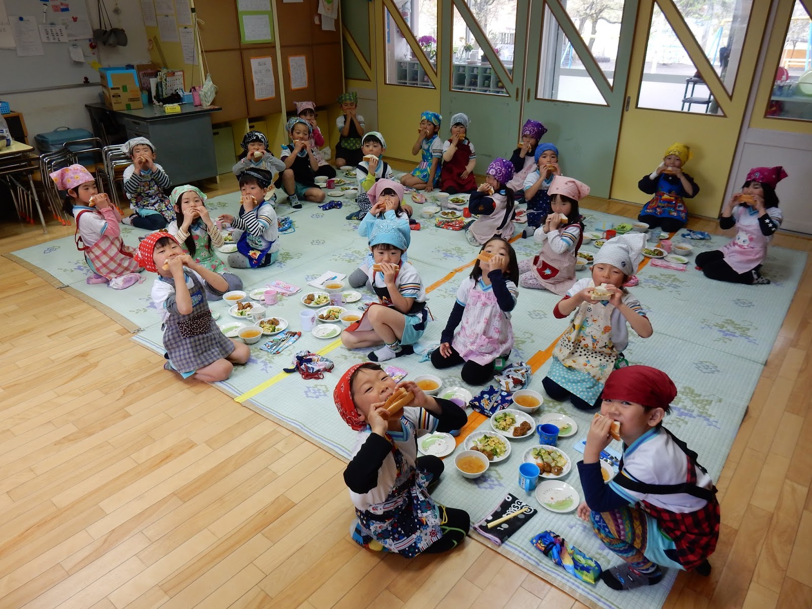 大きなお口でパクリ!ふわふわのパンに、卵。『おいしい~』とぺろりと食べてしまい、おかわりもして食べたんですって!今日は、いつもと雰囲気を変えて、ゴザの上でピクニック気分を味わいながら食べました。