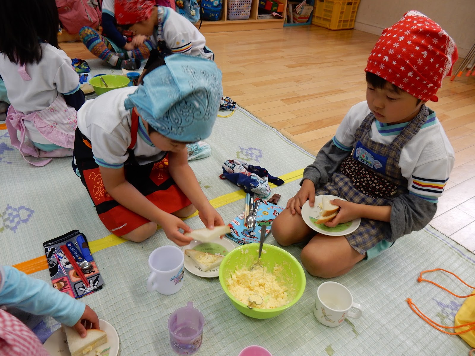 ここからがクッキング本番です。エプロン、三角巾の準備を整えて、卵の殻をむき、スプーンを使って卵をつぶしていきます。順番に、つぶす人、ボウルを支える人と上手に仕事を分けて自分たちで取り組めるのもひまわりさんらしいですね!