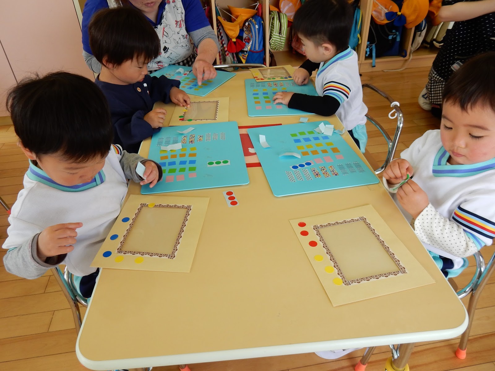 すみれさんは、シールをたくさん貼っています。いつも、机の上に貼ってあるお名前の書いたシールをはがしてしまうすみれさん(笑)そんな姿を見て、“シールはがしを遊びにしちゃおう!”って事で、この日は好きなだけ、シールはがしを楽しみました!