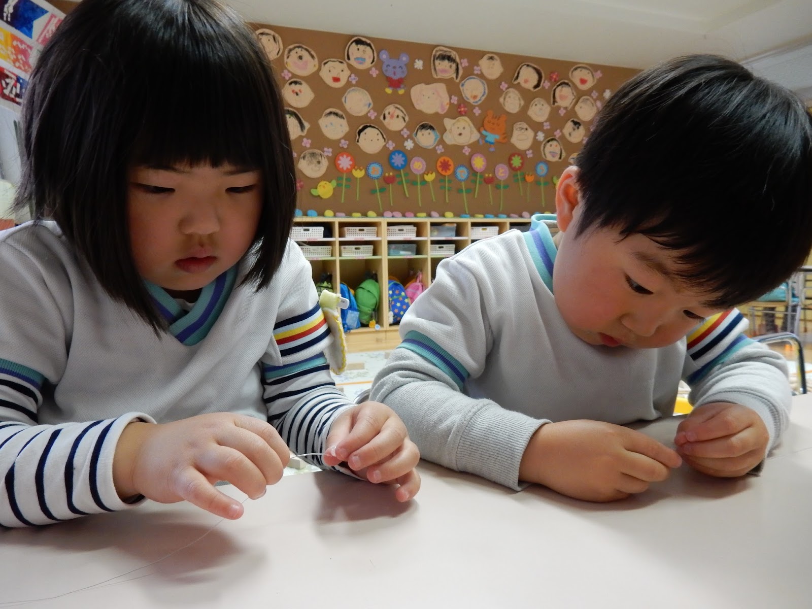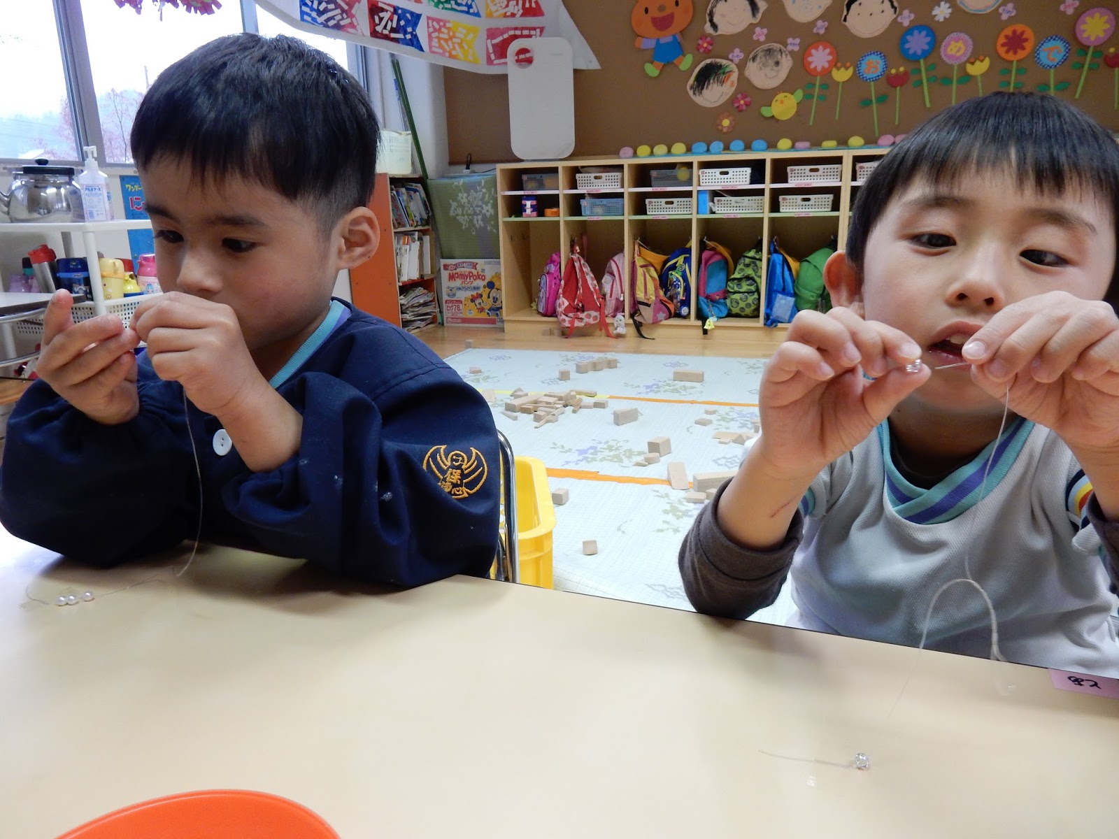 ゆりさんは、コネコネ紙粘土を柔らかくして絵の具で色を付けました。『お母さんが好きな色!』と、ピンクを選ぶ男の子がいたり、みんなちゃんと考えてます!下の写真は、とっても真剣な表情でビーズを通している所です。一生懸命さが伝わってくるでしょうか!
