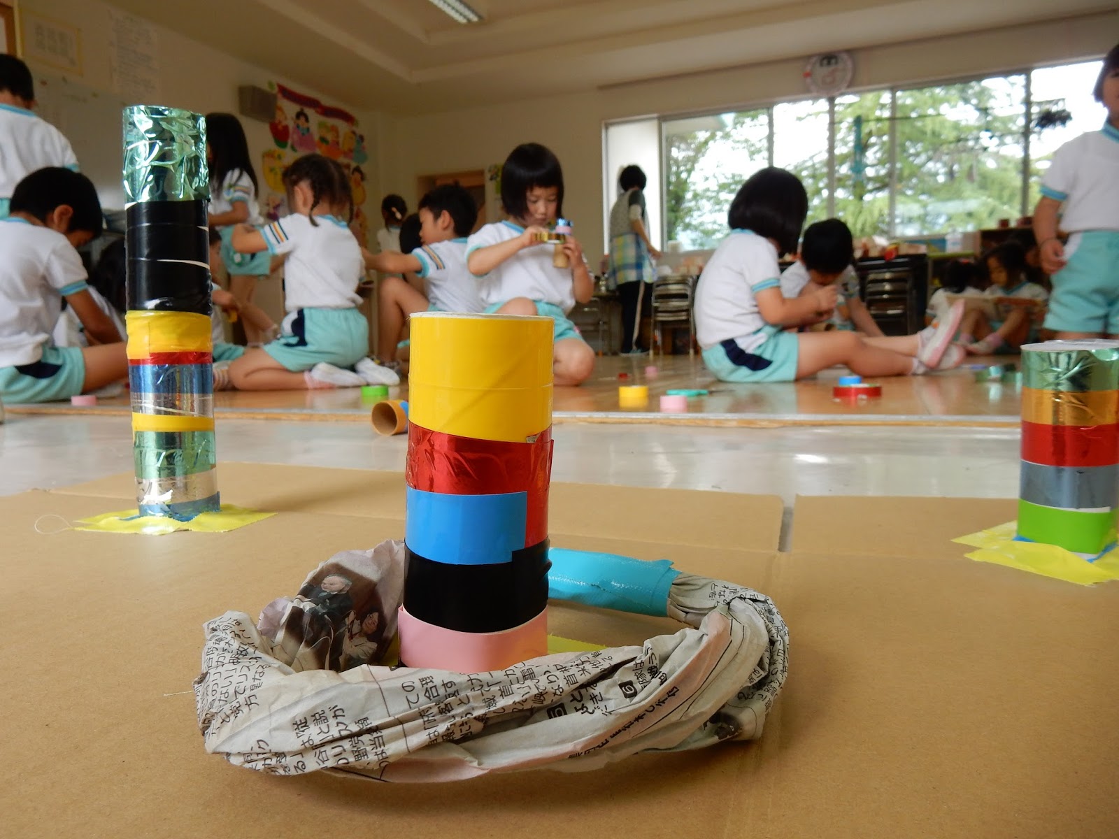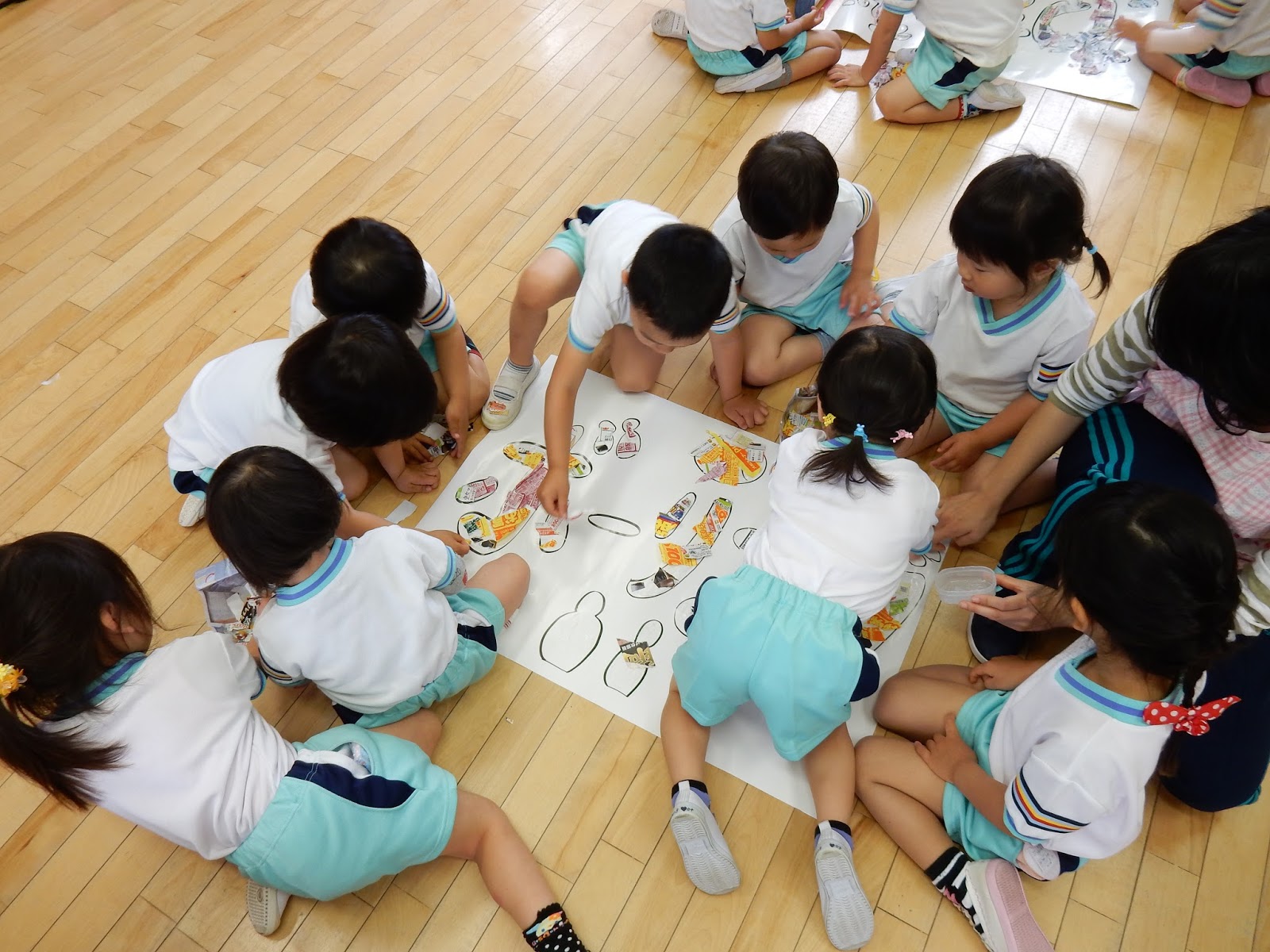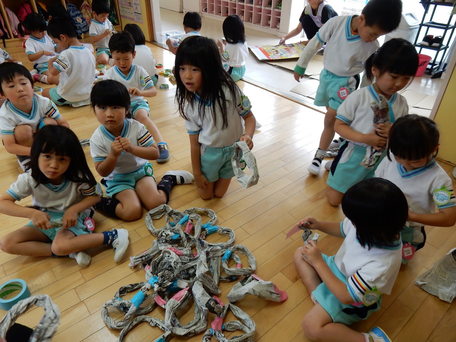 来月は、『おまつりごっこ』なんです。こどもたちが、おまつりでよく見かける出店をつくって、お店屋さんと、お客さんになってごっこ遊びをするんです。それだけではありません!クラスごとに、おみこしも作って担ぐんですよ!