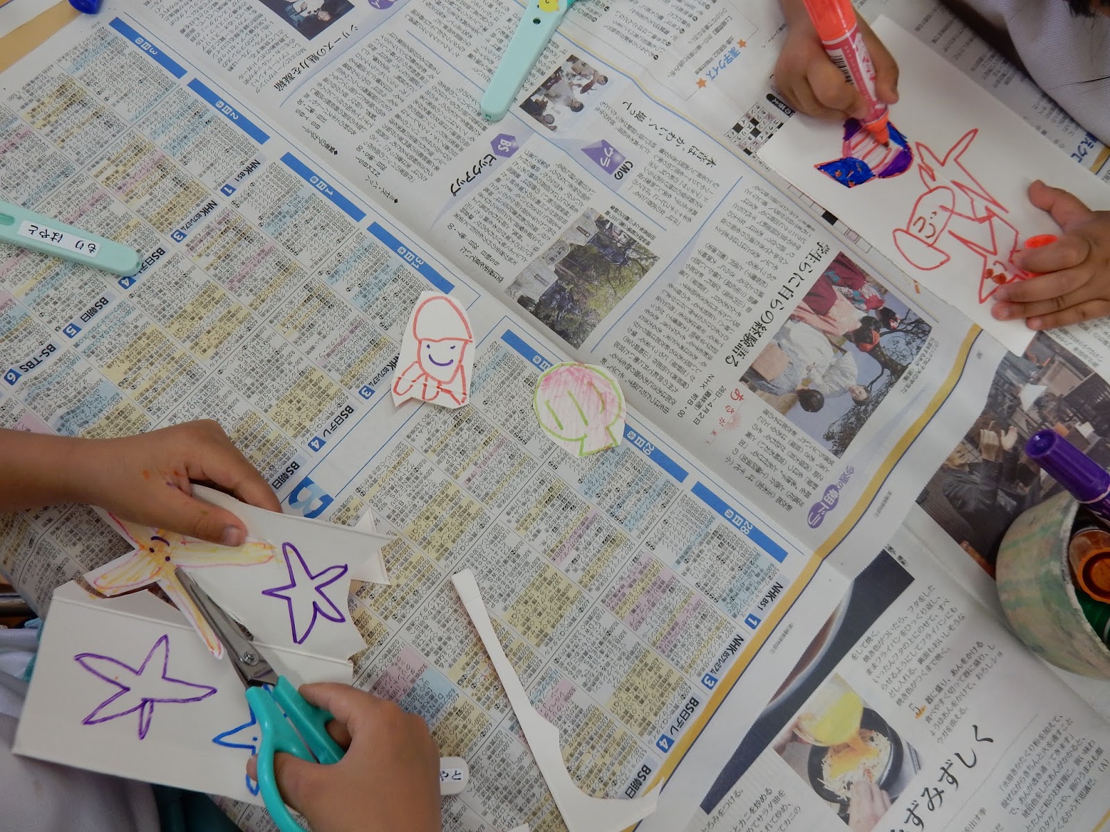 魚釣り屋さんの準備は、牛乳パックを使って。魚の他にもいろんな生き物がたくさんいるみたいですね!こちらもとっても可愛らしいです!