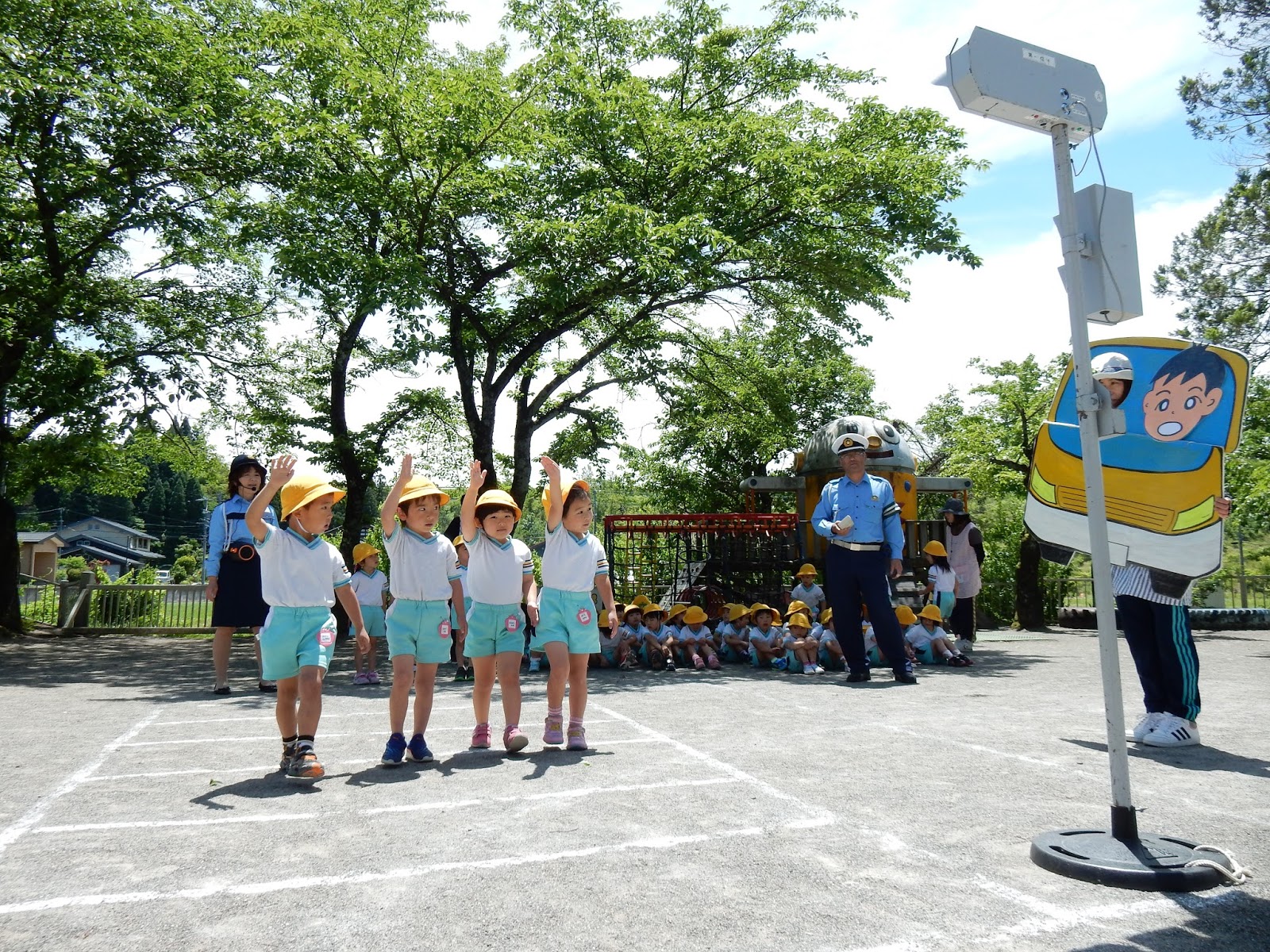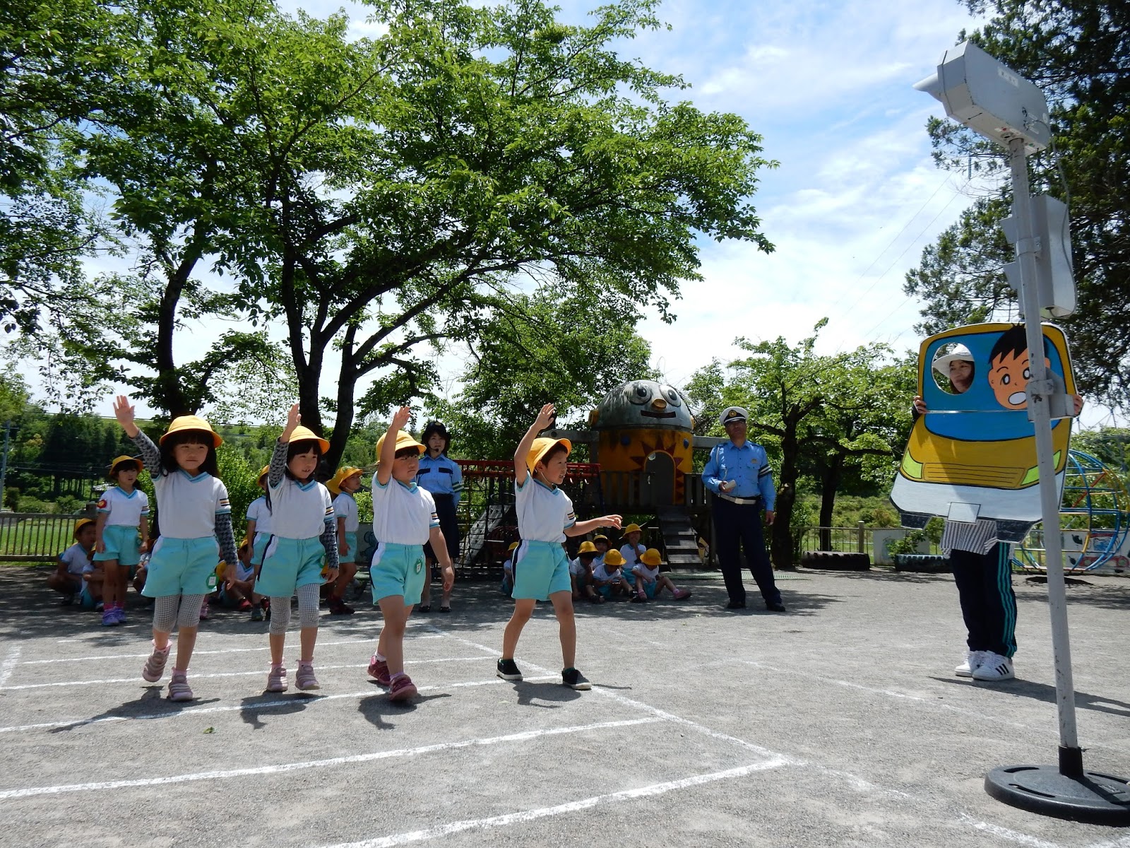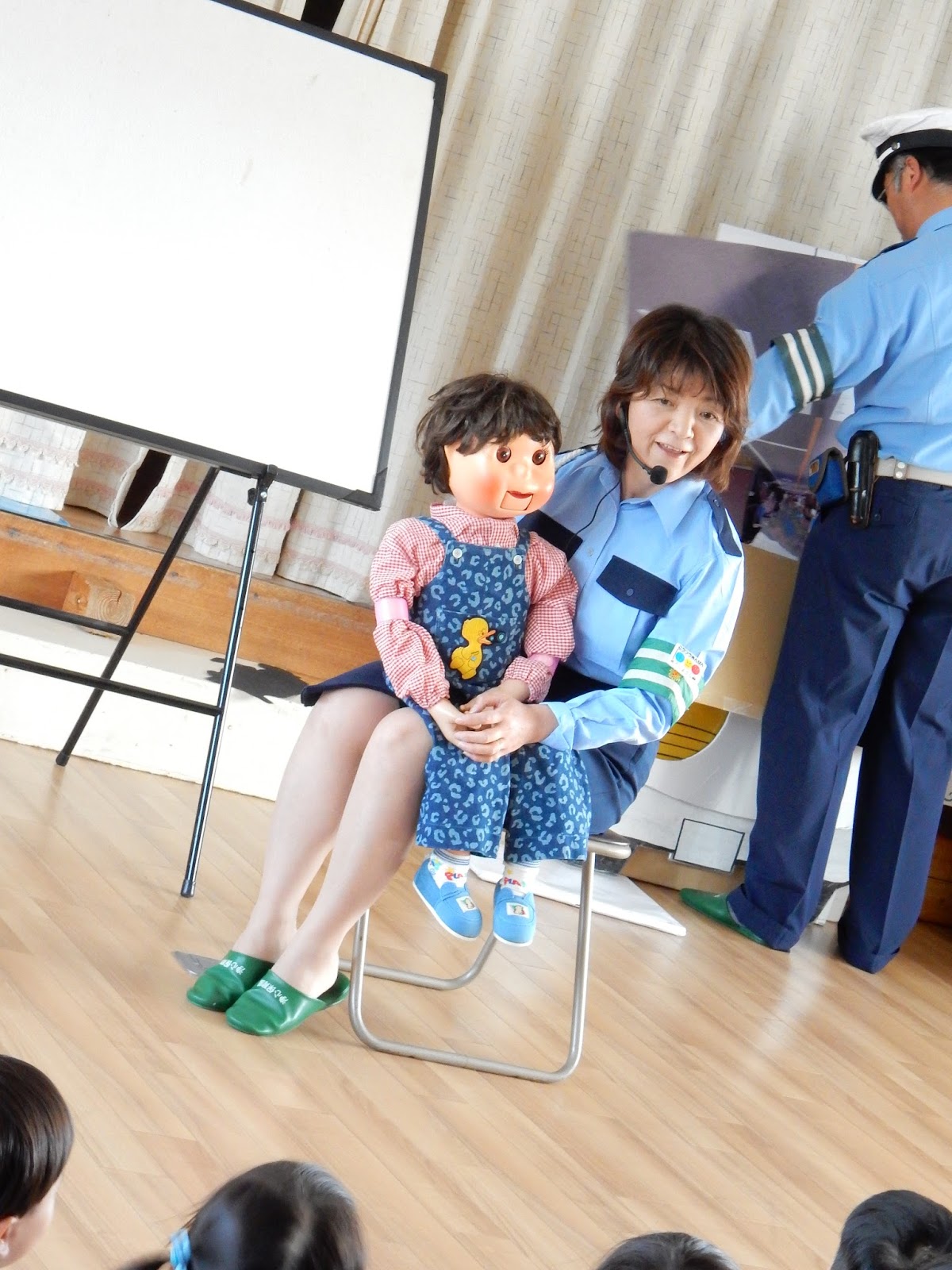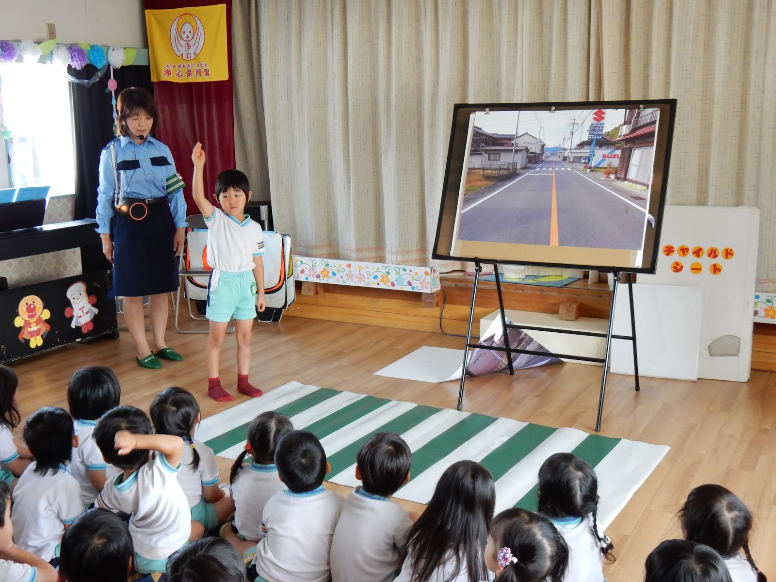 いつものように、真剣な表情で話を聞くみんなの前には、今日はいつもと違ってお客さんが。郡上警察署のおまわりさんと、交通指導員さんが来て下さいました。年に2回、来園して下さり、子どもたちや、私たち職員も、道路でのお約束を確認します。今日は、チャイルドシートの重要性、信号機の見方、横断歩道の渡りかたをお勉強しました。