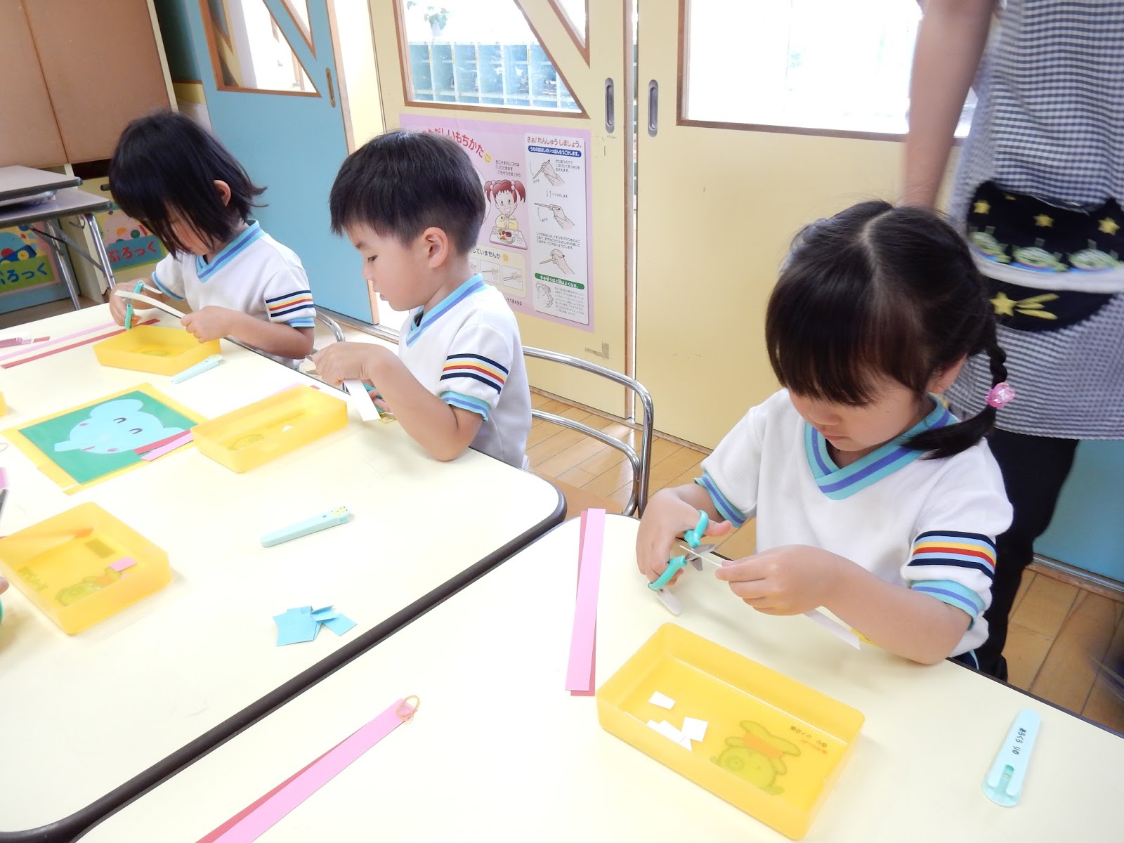 初めての“はさみ”に挑戦中のたんぽぽさん。みんな真剣な表情です。お家で使ったことのあるお友達も、もう一度、持ち方、切り方を確認します。クラスのみんなで一緒に使う時は、危険のないよう、先生とお約束をして、上手に使えるように簡単なもので練習。みんなが今日切った細長い画用紙は、どんな作品に変身するのでしょうね!