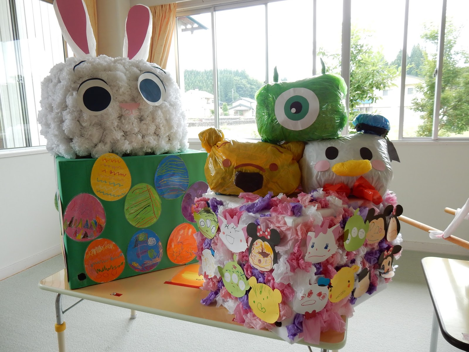 各クラスのおみこしが並びました!どのクラスも力作です。獅子舞が、ひよこさん、重機がすみれさん、ツムツムはたんぽぽさん、イースタエッグがたくさんついたゆりさんのおみこし、忍者神輿がひまわりさん。出店の時間は、お部屋に展示してあったので、他のクラスのお友達も、『かわいい!』 『かっこいいなぁ!』と見学していました。