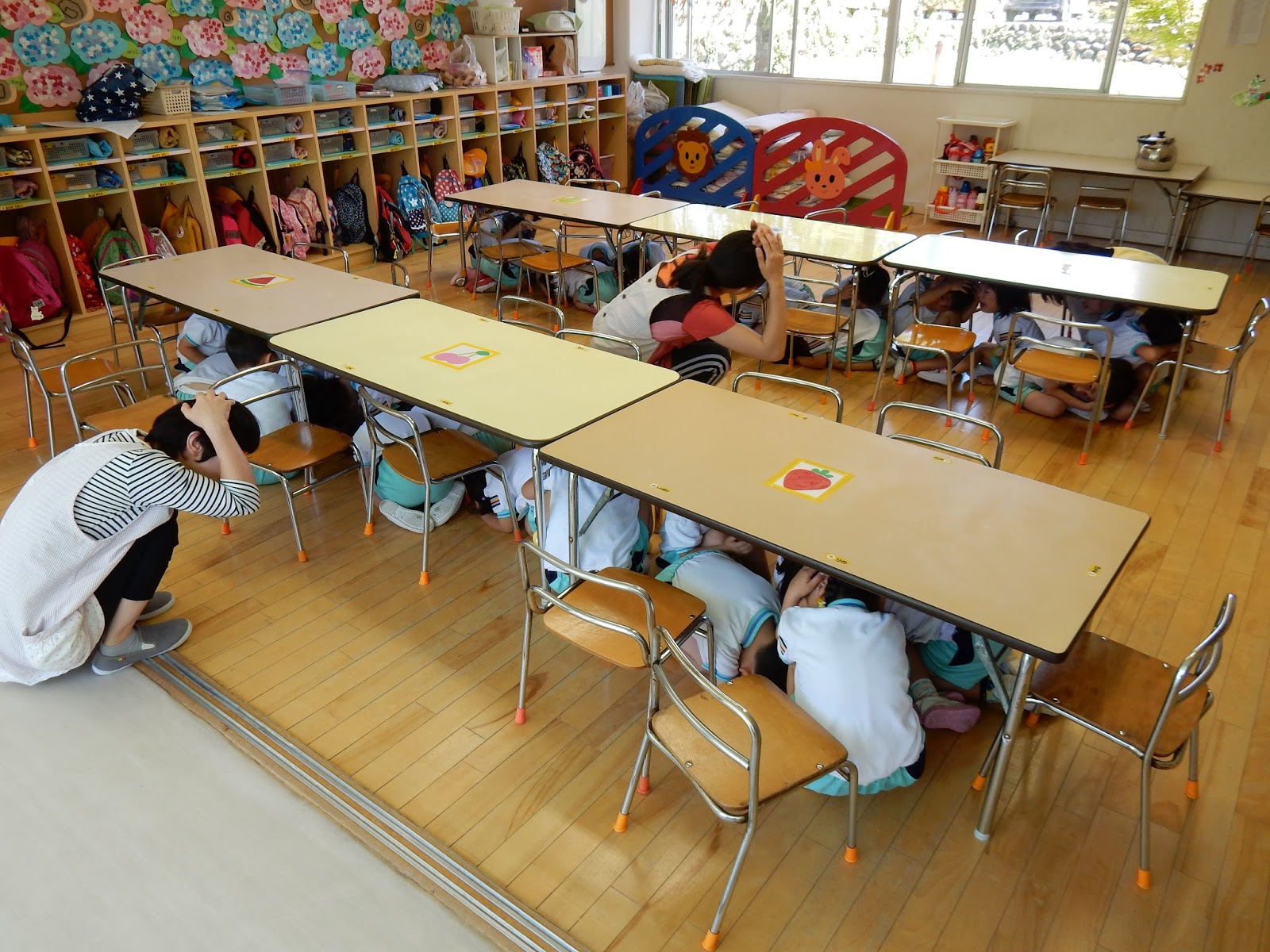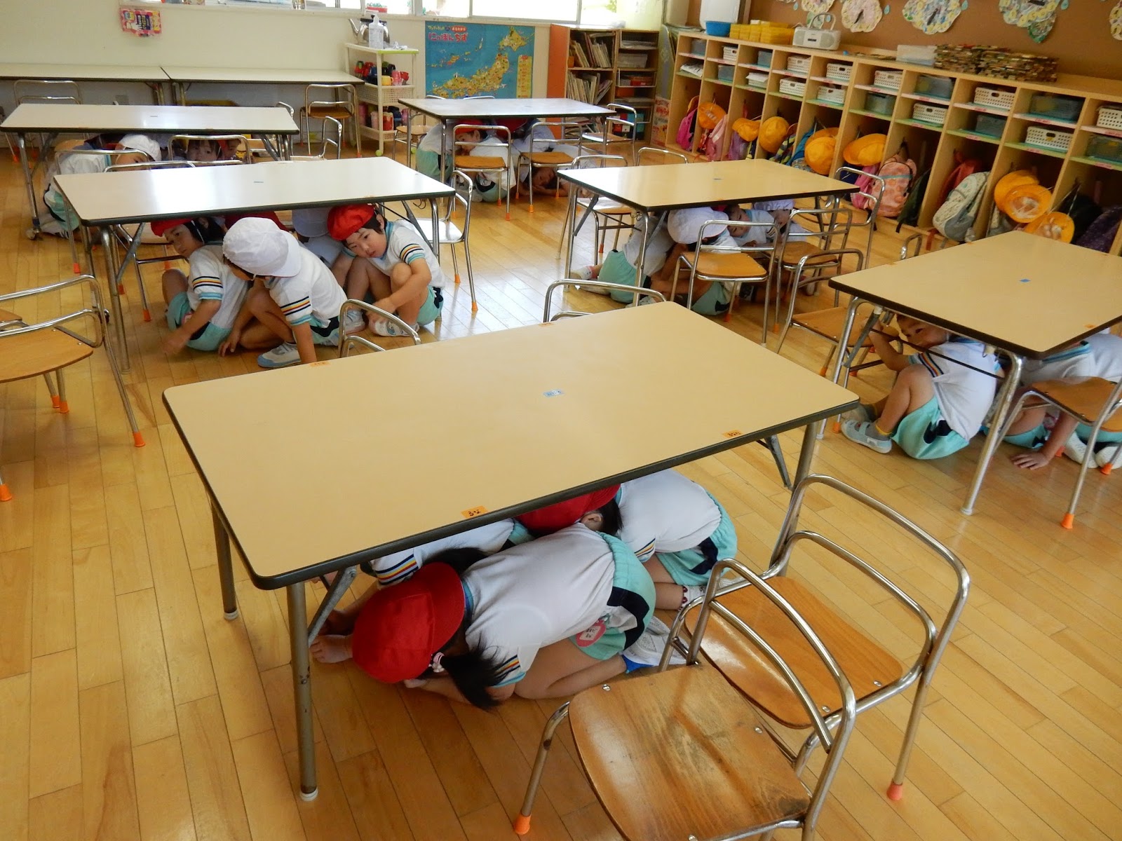 みんな先生のお話を聞いて、素早く机の下に隠れました!