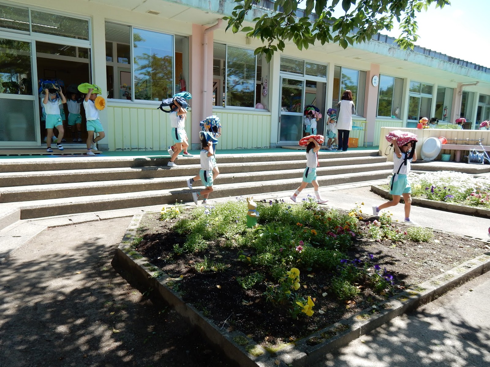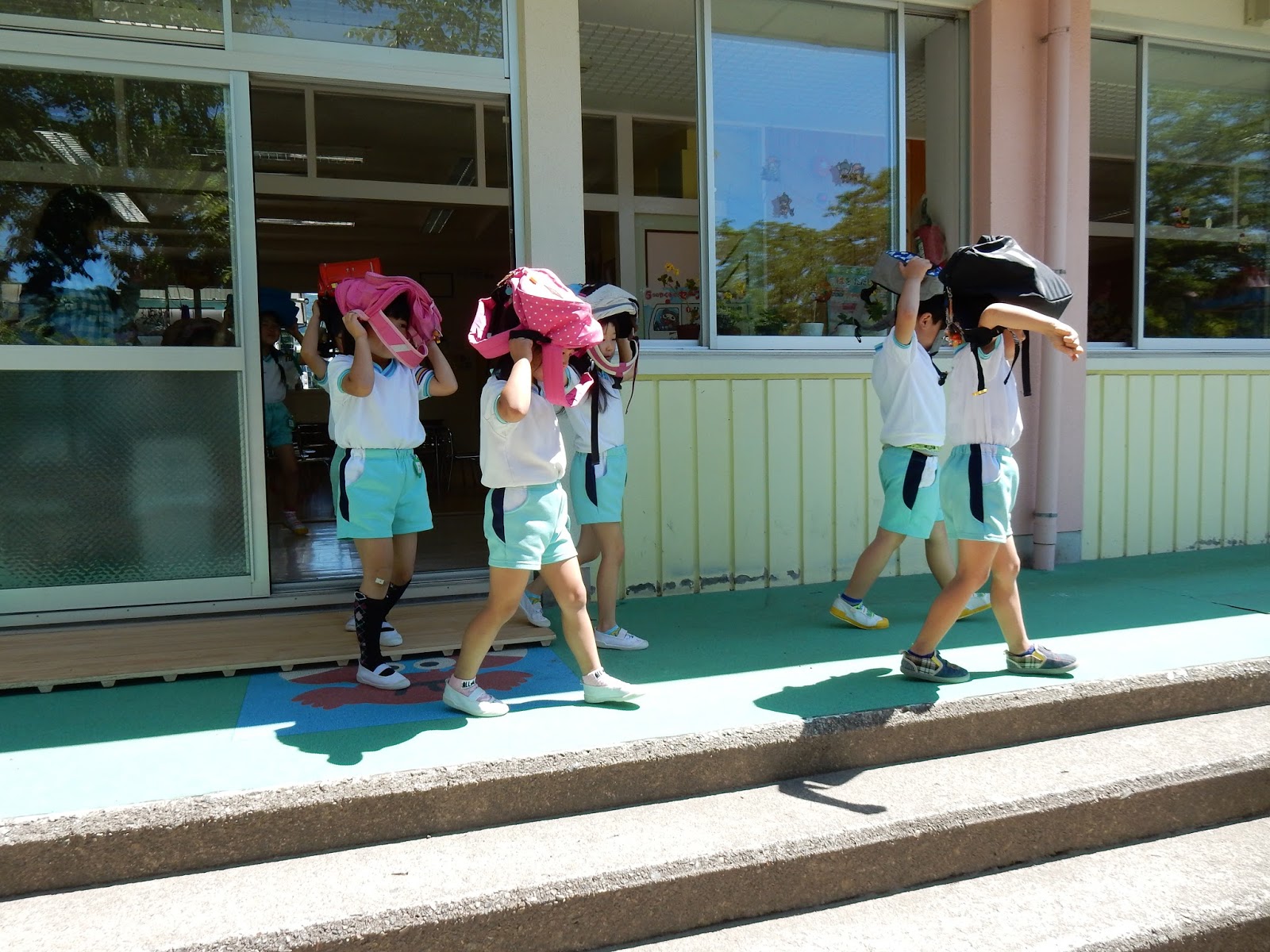 揺れがおさまって、外へ避難する時は、鞄を頭の上にのせて避難です。これも、第1に落下物から頭を守るため。すみれぐみのお友達も、上手に逃げだすことができています。