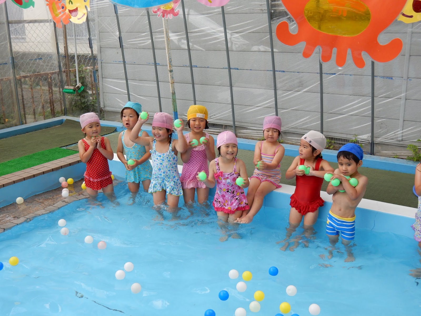 プールにはおもちゃもたくさん♪みんな目がキラキラしてました!カラーボールを使ってのゲームや、浮き沈みするキラキラの宝石、ビート板で泳ぐ練習をする子もいました!