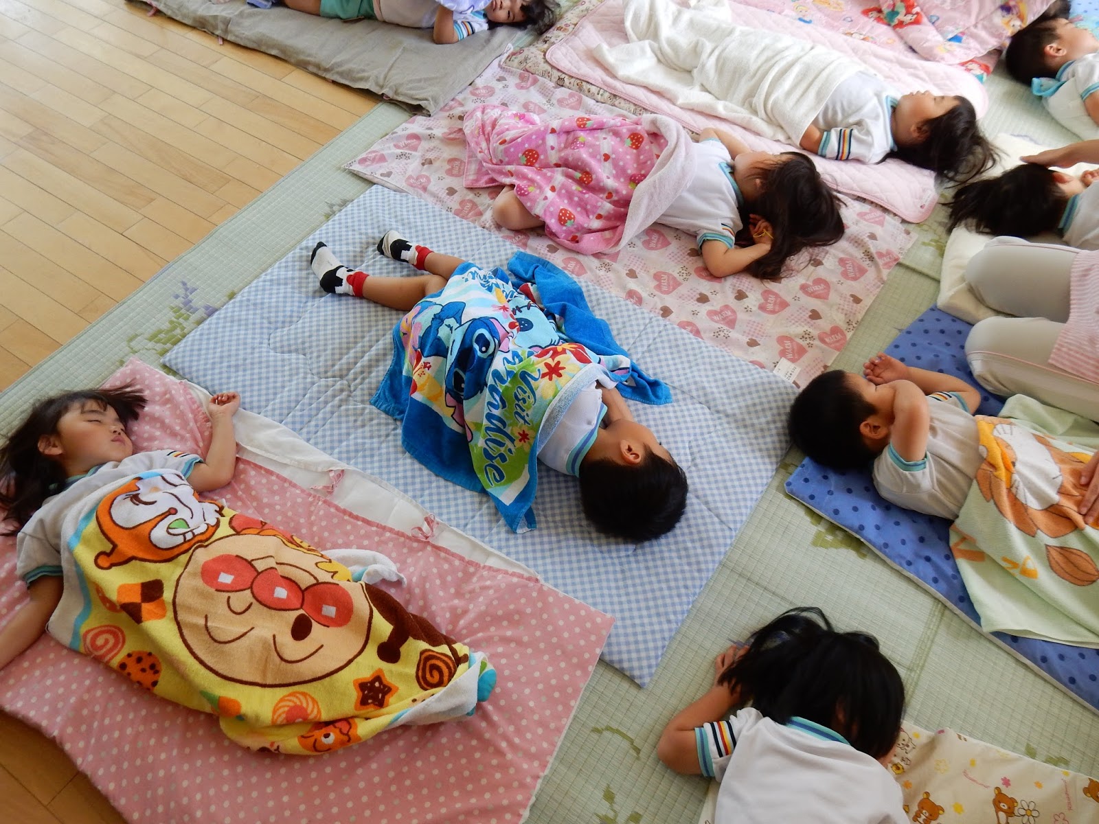 プール開始とともに、ゆりさん、ひまわりさんでもお昼寝始めました♡たんぽぽさんは、半数以上の子がぐっすり!ゆりさんは、短時間ですが、ゴザの上でゴロゴロ体を休めます。暑い夏、遊ぶときは思い切り遊んで、ゆっくり休むことでまた元気いっぱい!健康的に夏を乗り切っていきたいですね!