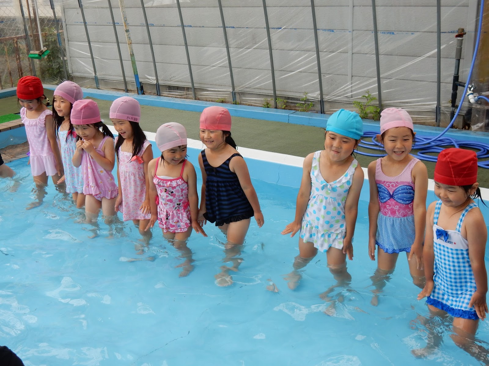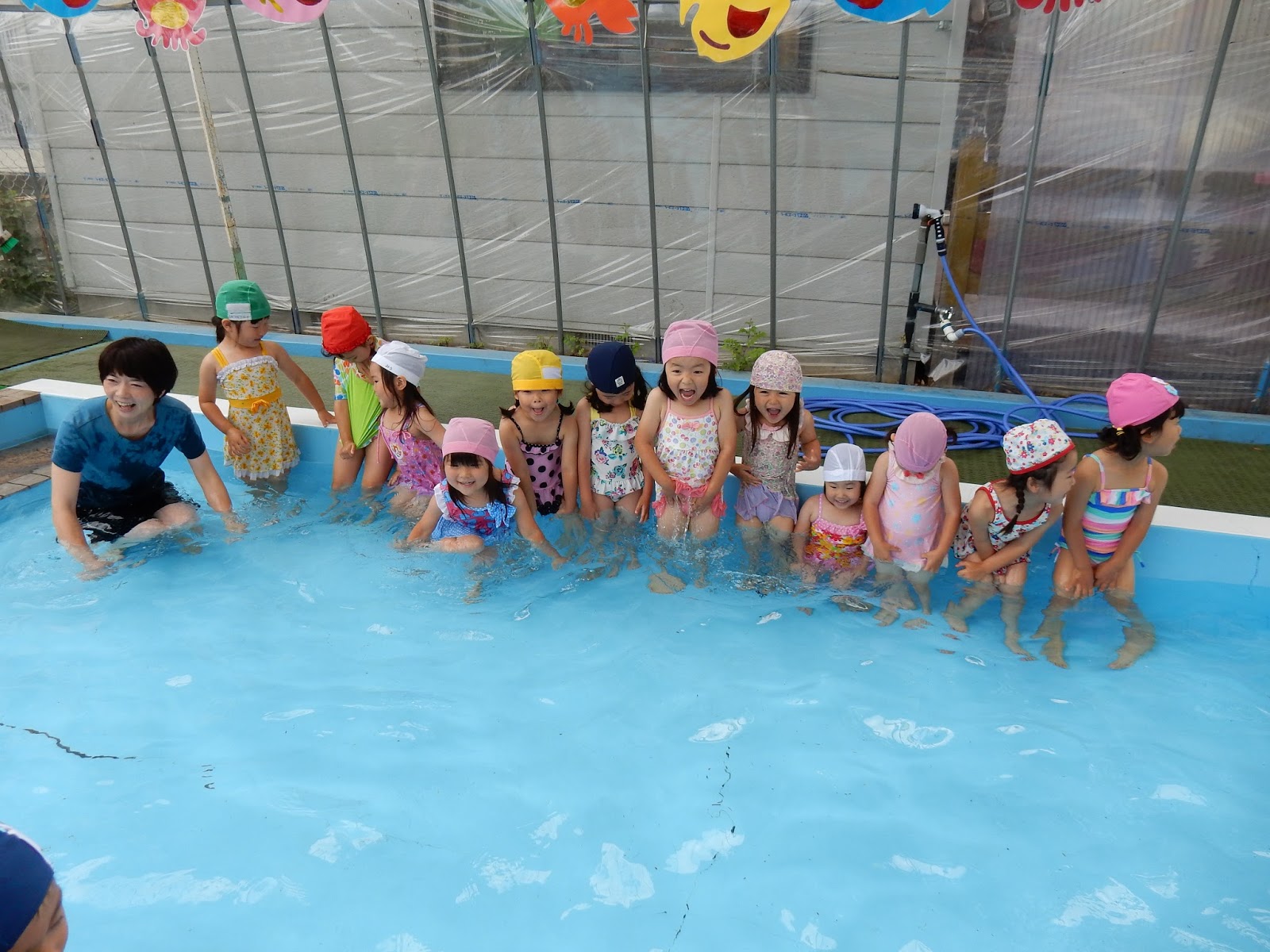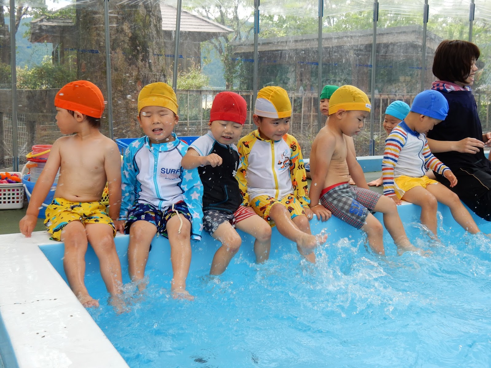 みんなで集まってお話を聞きます。楽しいプールあそびですが、事故が起きては大変!お約束を確認します。プールサイドは走らないようにしようね、おトイレには必ず行こうね!爪は切ってもらおうね!病気やケガは早く治そうね!…いろんなお約束がありましたが、楽しい、楽しい水遊びの始まりです、みんなとっても真剣に聞いてくれました。