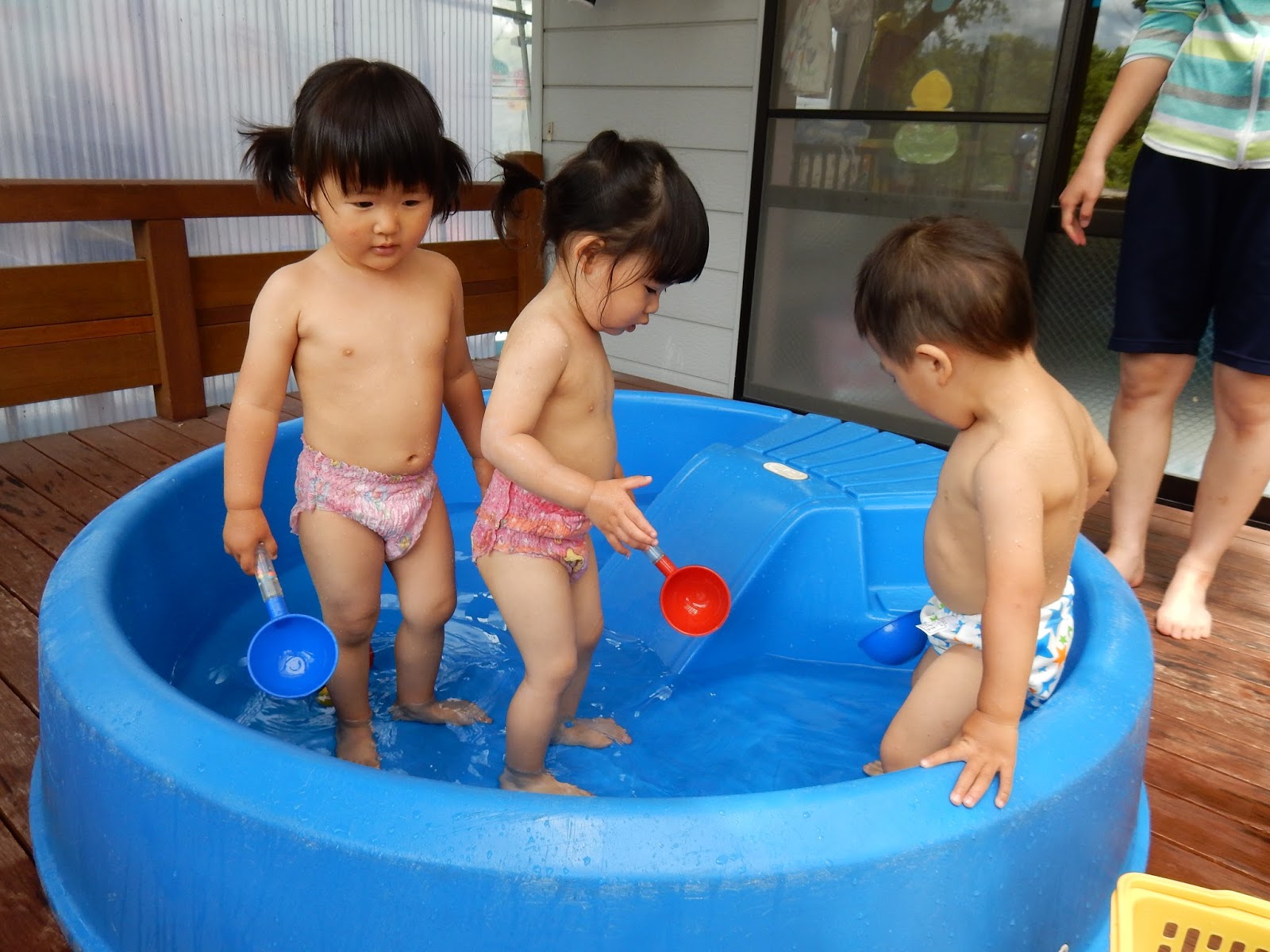 ひよこさんや、すみれさんはテラスのプールで遊びます。最初は恐々…様子を覗っている様子でしたが、それでもお水の感触を確かめながらみんな順番に入っていきます。冷たい水にビックリ!な表情を見せたり、とってもダイナミックに水をかぶったり。初日からとっても楽しそう!