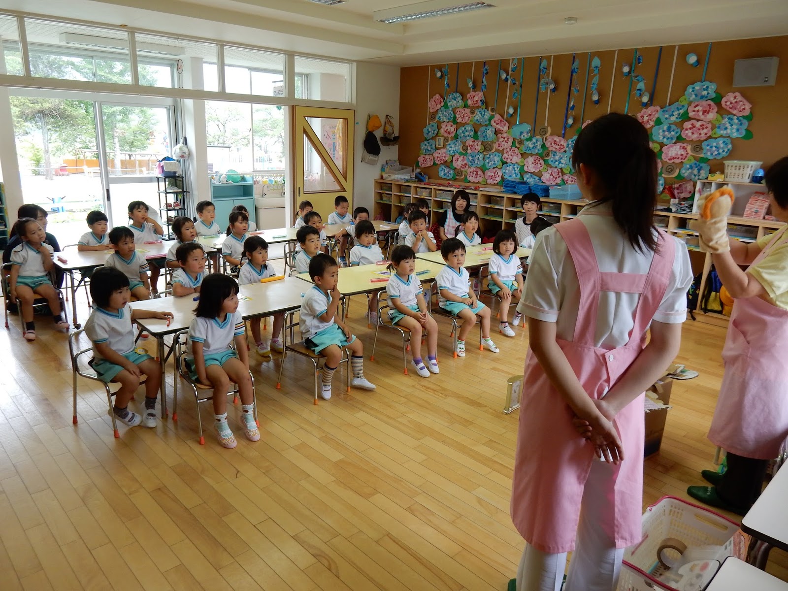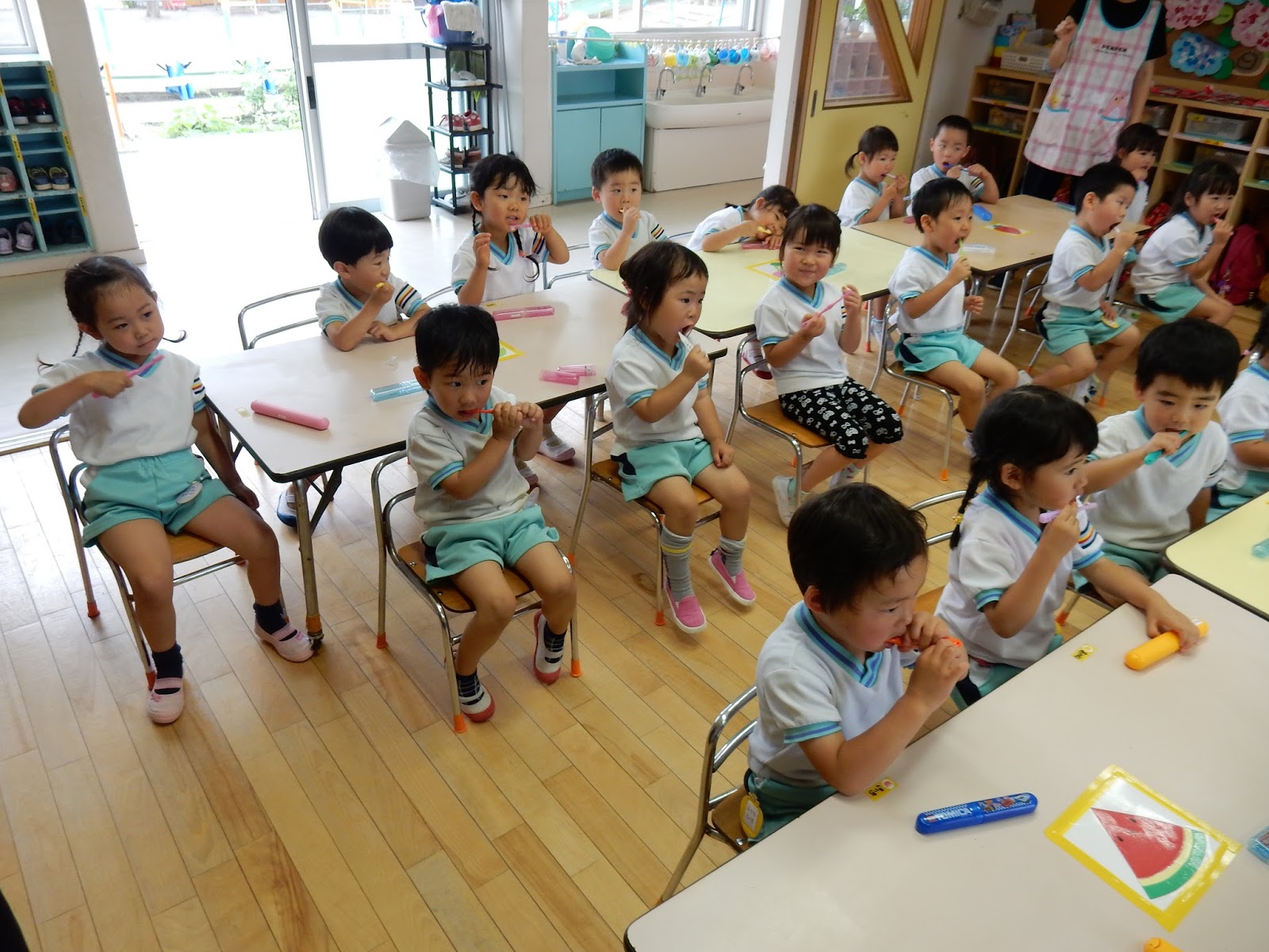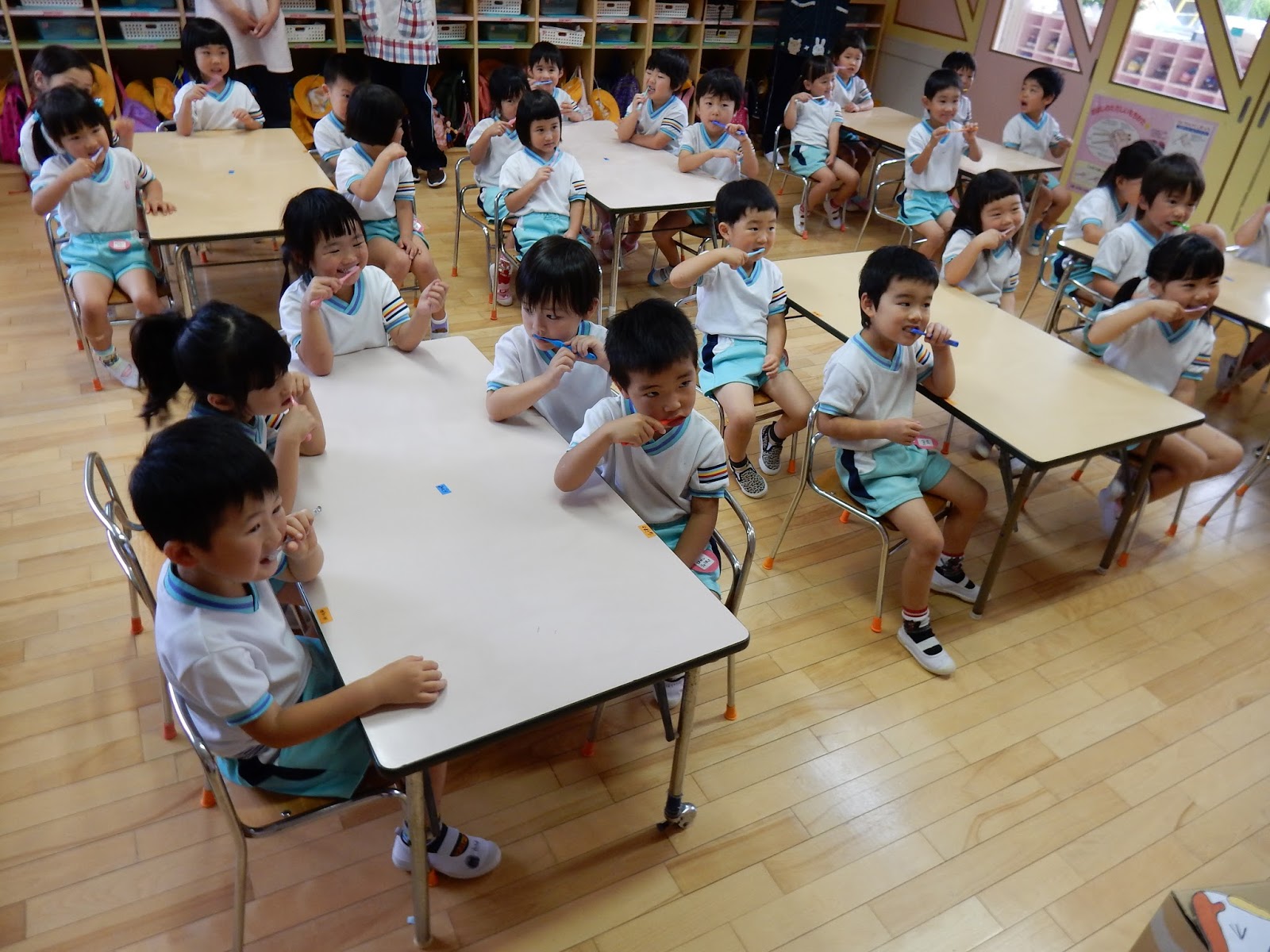 今日は、衛生士さんが来て下さって、子どもたちの前で、歯磨きのお約束や、どうして歯磨きをするのか、そして、歯ブラシの持ち方や、磨き方をとても丁寧に教えて下さいました。歯の模型や、大きな歯ブラシなどあまり見たことのない物に子どもたちも興味津々です。