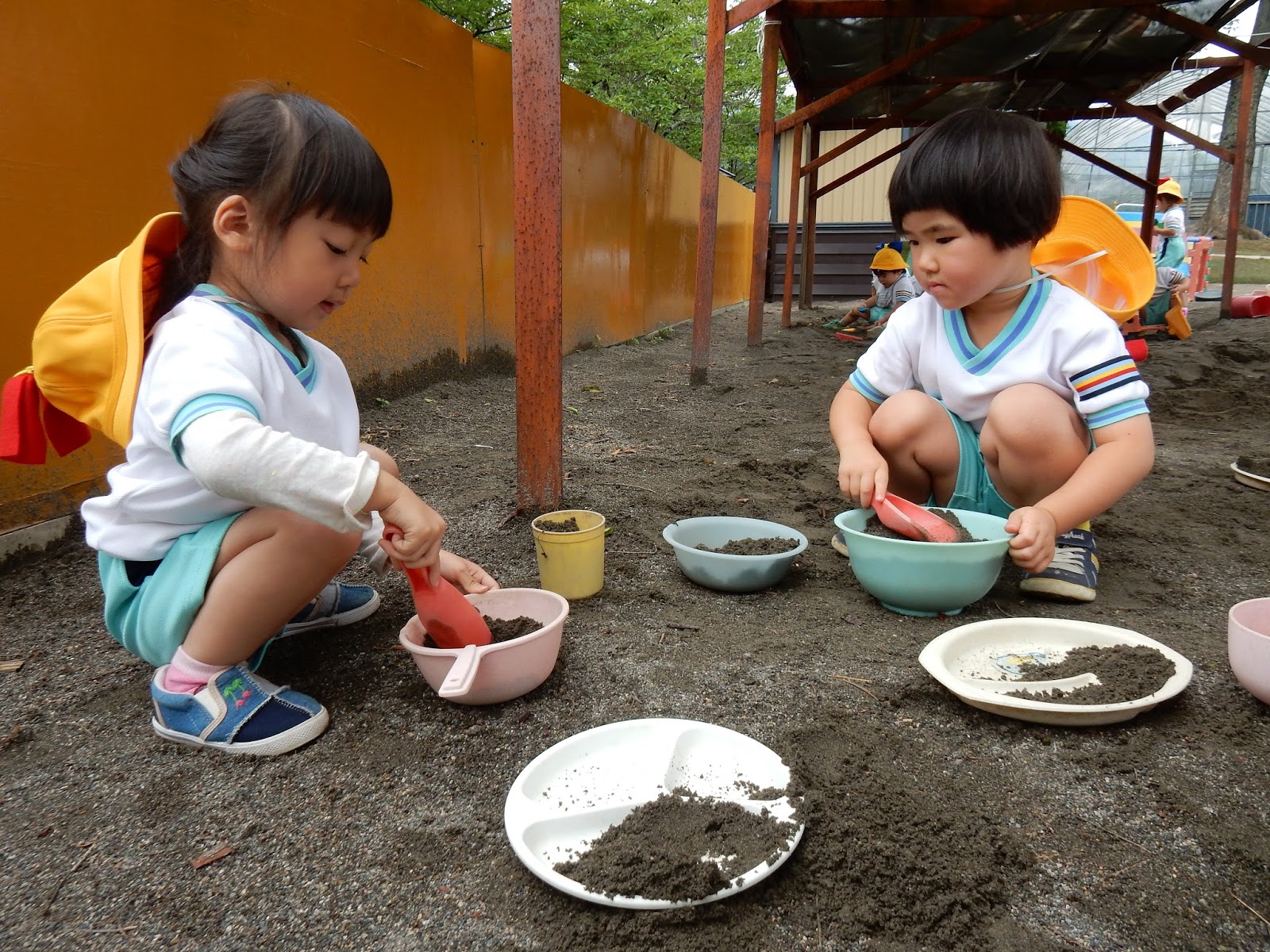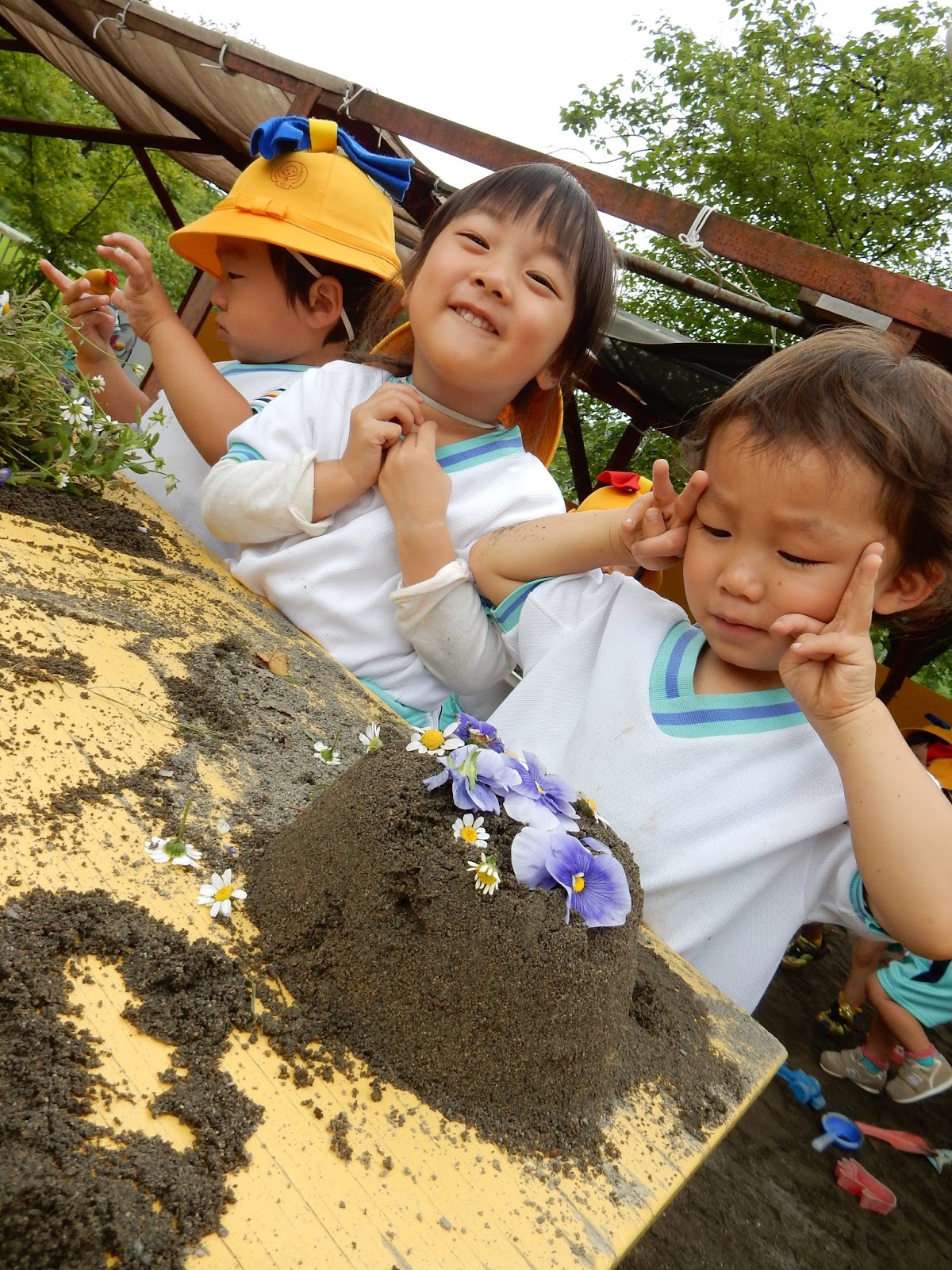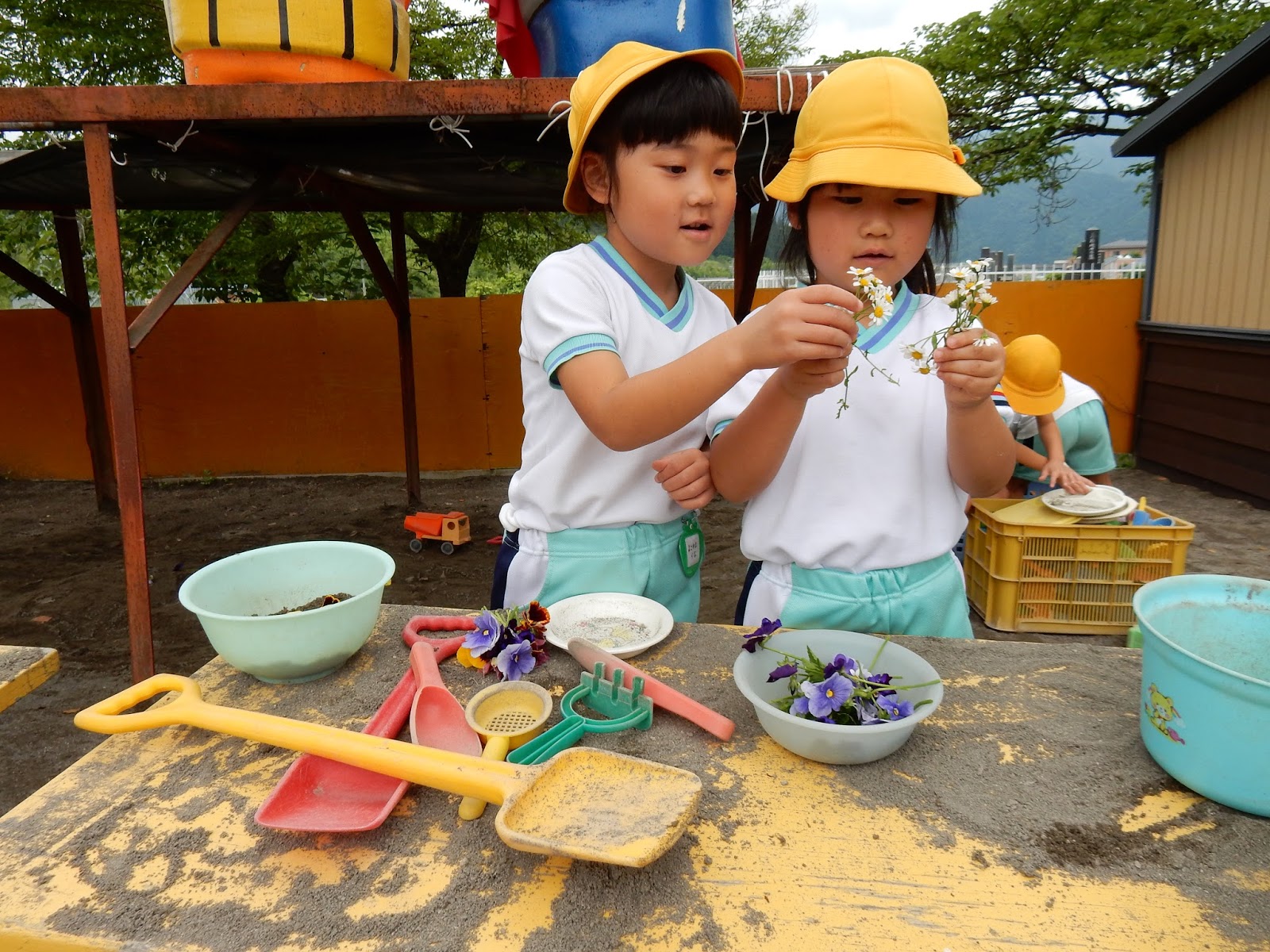 お砂場へ持って行って遊ぶんです。ちぎったお花を上手に並べていくと、とっても素敵なケーキが完成!ボウルに入れて混ぜれば、混ぜご飯の出来上がり!子どもたちの素敵な発想に感動です♪