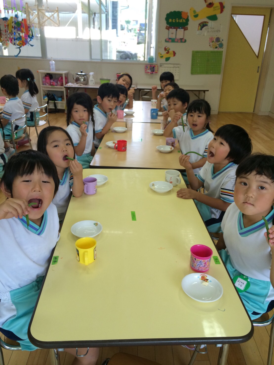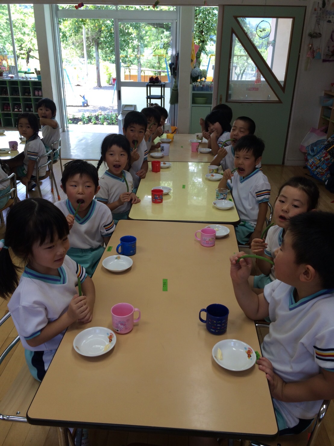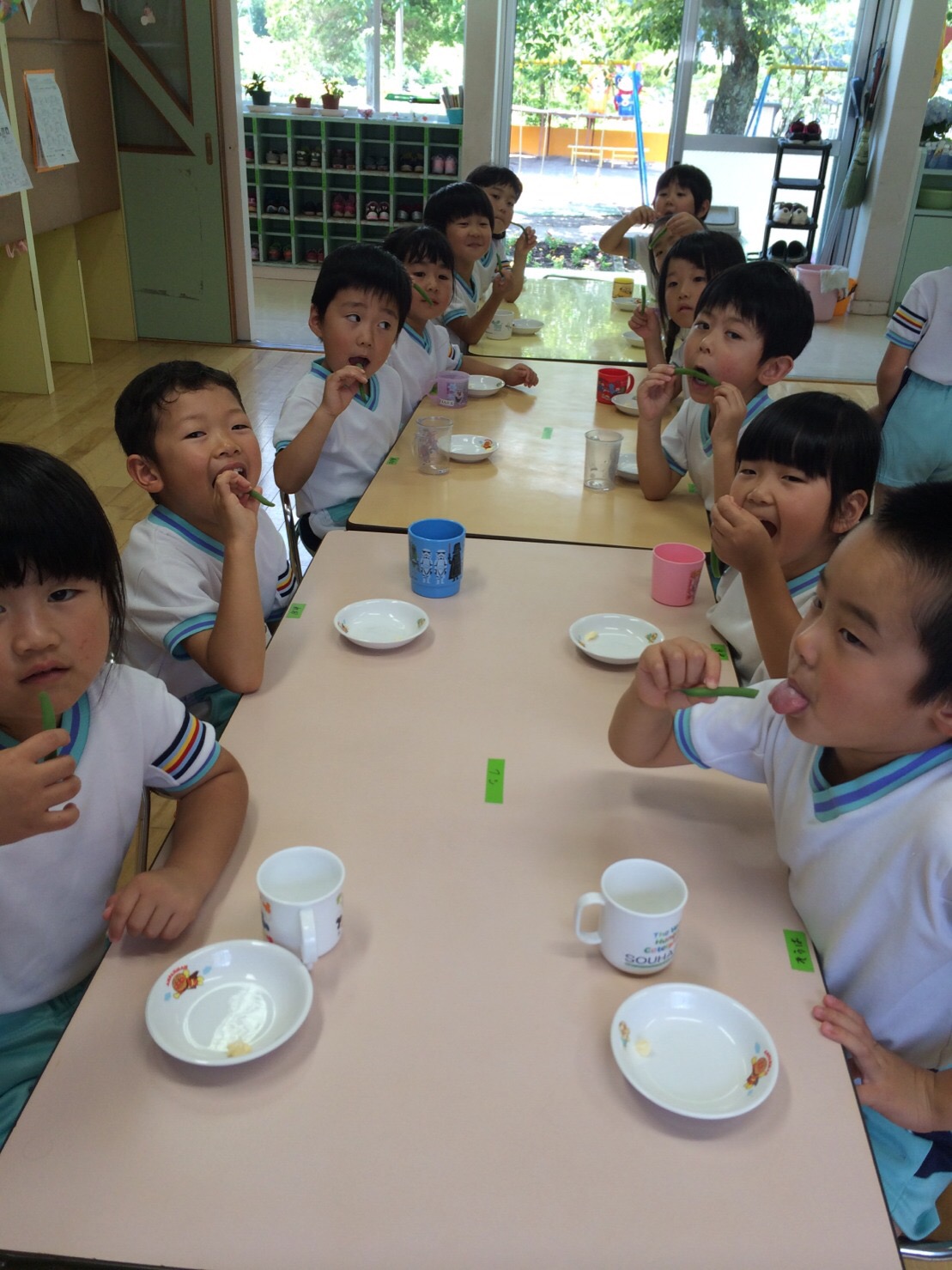 初収穫だったので、お部屋で茹でて、そのままの味を楽しみ、おかわりは、マヨネーズをつけて食べたんですって!なかなか素材そのままで食べる事って少ないと思いますが、小さな種から芽が出た!!と大喜びし、立派な苗になり、草取りなどをしながら愛情たっぷり育ててきたインゲン豆、『ちょっと苦い!』 『おいしい!』と感想も様々。まだまだこれから収穫できた分はスープなどにして食べる計画をしているみたいです!楽しみですね!