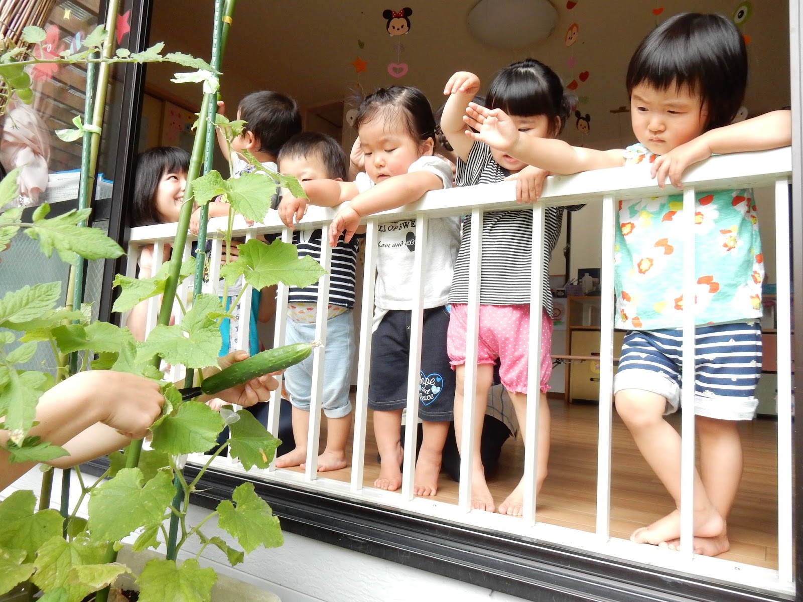 ひよこさんでも、大きなきゅうりが2本収穫できました。先生がはさみでチョキン!と切ってくれる様子を真剣な表情で観察し、とれたてのきゅうりを手にしたひよこさん。『チクチク』と、きゅうりのイボにちょっとビックリしていました!