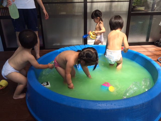 普段やっている手遊びや、真似っこ遊びも、水の中でやるといつもとは違う雰囲気になりますね♪顔に水がかかってもへっちゃら!!って子もいますが、まだまだたんぽぽさん、慌てて顔をふく姿も可愛らしいです!