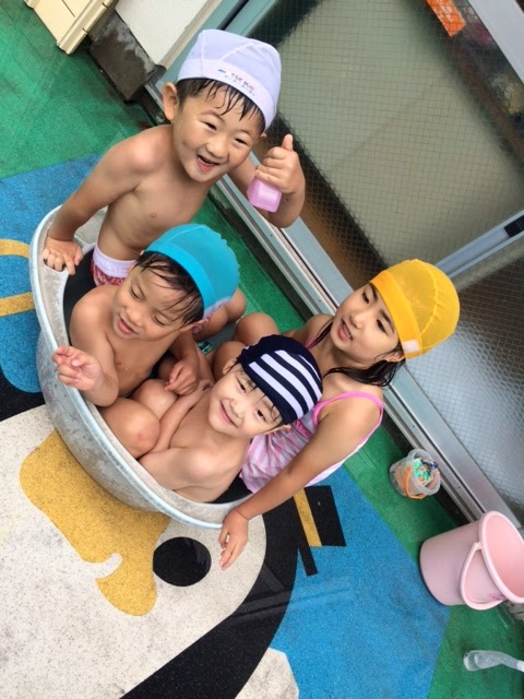 おまけ♡先週の土曜日、希望保育でプールに入ったんですが、曇り空で途中寒くなっちゃいました…プールから出る前に、ベビーバスにお湯をためてあったまることにしたんですが、年長さんと年中さん。みんないっぺんに入ったらこうなりますよね(笑)でも、なんとも可愛らしくて、楽しそうな1枚です♪