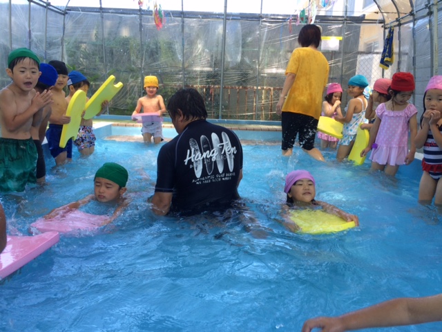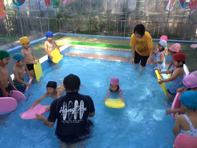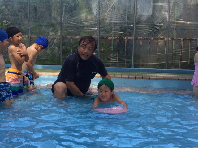 ひまわりさんは、泳いでますよ~!!ビート板を使ったり、中には顔をつけて泳げる子もいるんですよ~。お友達が頑張っている姿を見ながら刺激を受け、水が苦手な子も少しずつ挑戦しています。
