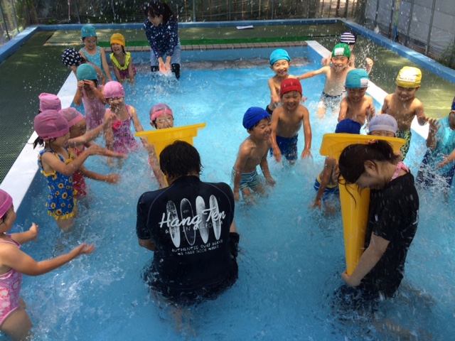 先生いじめ!?いえいえ、男の子、女の子に分かれてのゲーム中です。どっちがコーンにいっぱい水をためられるかな??これも、一生懸命水を入れようとしている間、子どもたちにも水がかかっているので、自然と水に慣れる事ができるんです♪流れるプールもみんなで走って、走って...意外と流れるんです、これ!