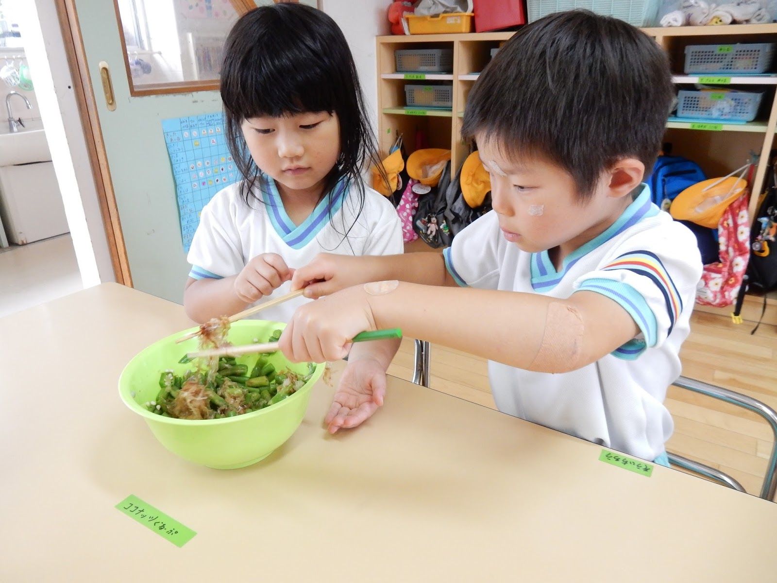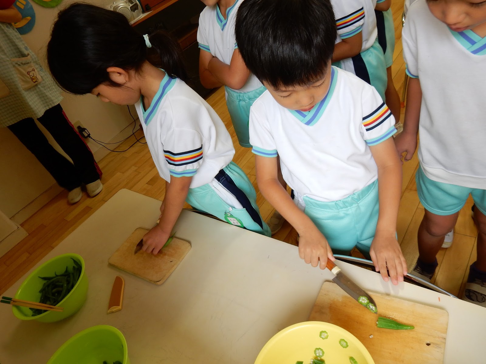 たくさん採れたひまわりさんのインゲン豆、最後の収穫、最後のクッキングでした。オクラと混ぜておかか和えにしていただきました。この夏、たくさん包丁を持つ機会があったひまわりさん。最初の頃に比べて、何だか手つきが良くなったような!何事も経験ですねっ!小さな種からできたたくさんのインゲン豆。苗から育てた時以上に、愛情を持って生長を見てくることができました!