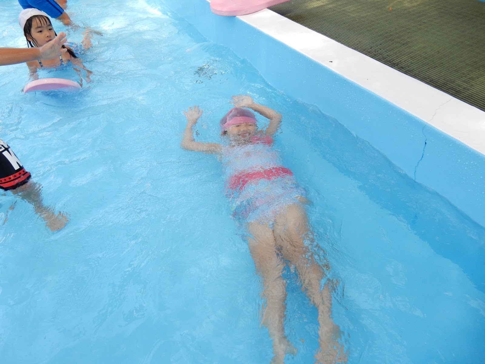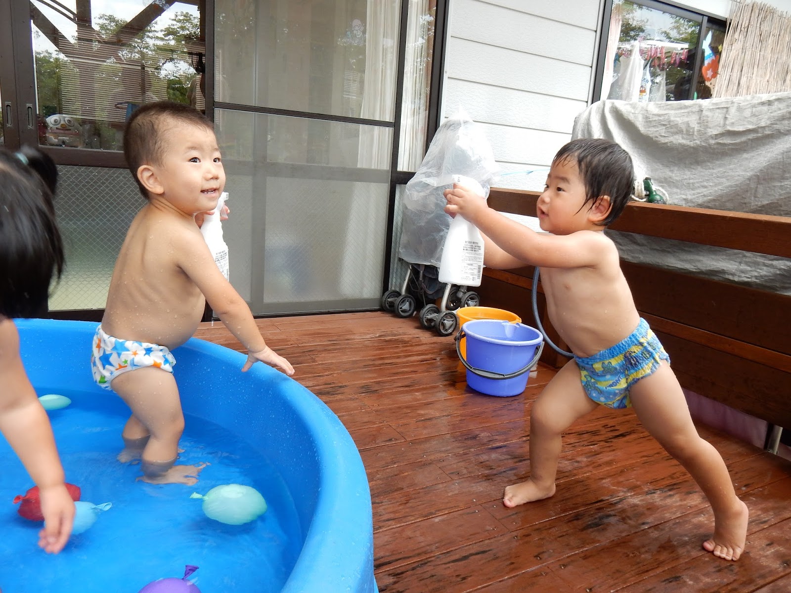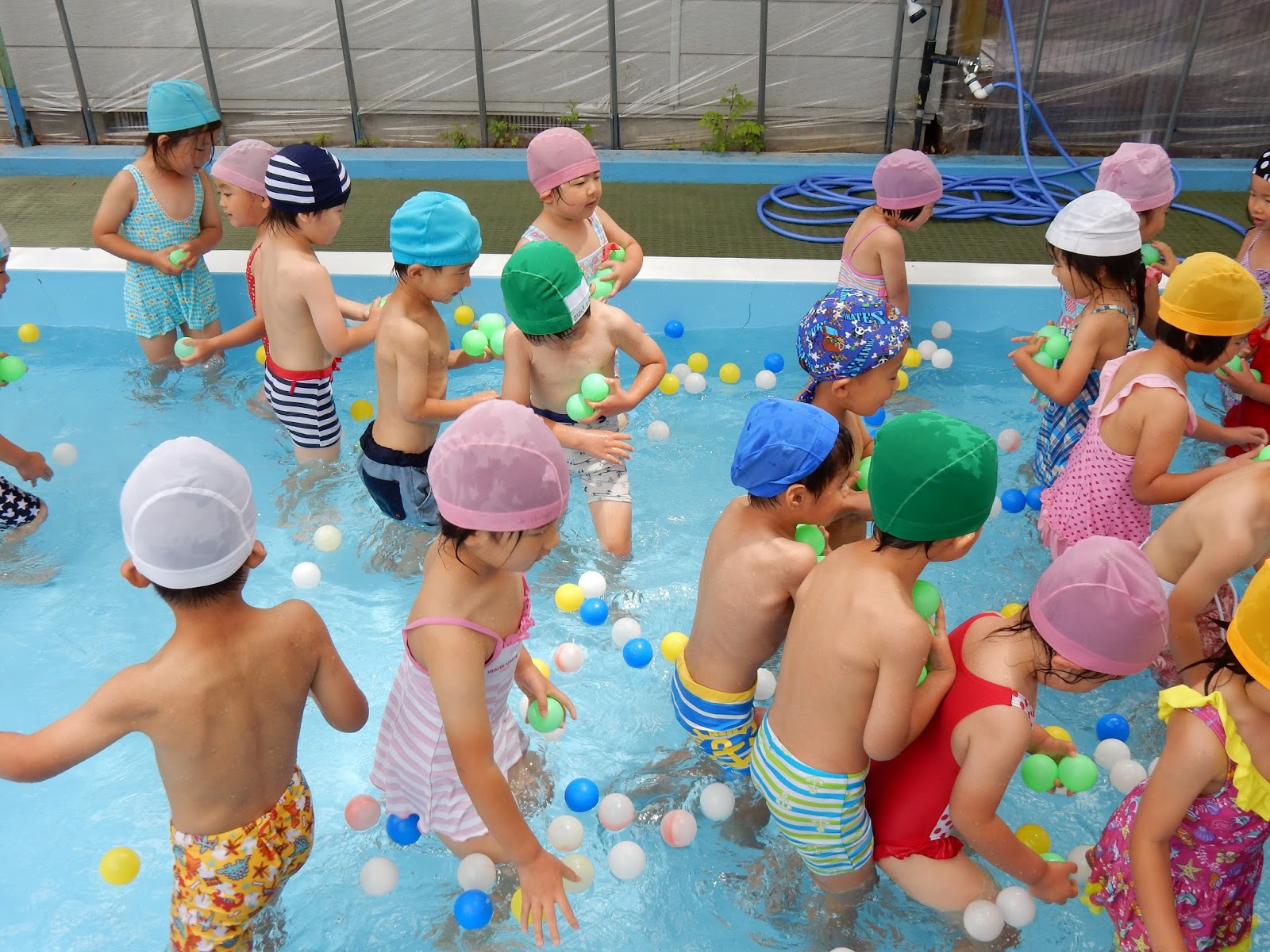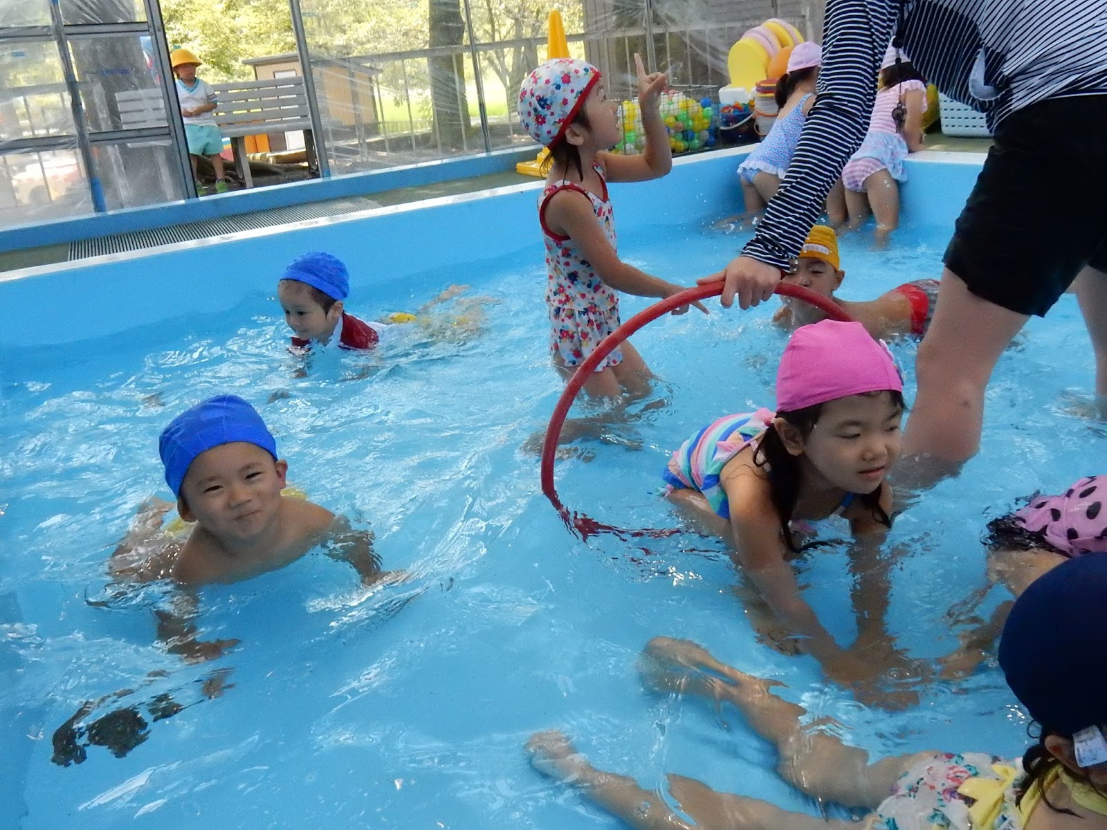気がつけば、プールあそびができるのもあとわずかな日数になってしまいました。日に日にダイナミックになっていく子どもたちです。泳げるようになったり、顔が付けられるようになったり。おもちゃもいろいろで、工夫して遊んでいます。