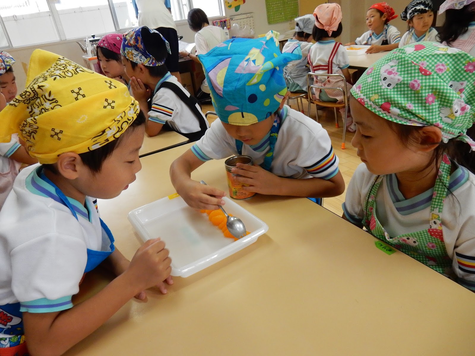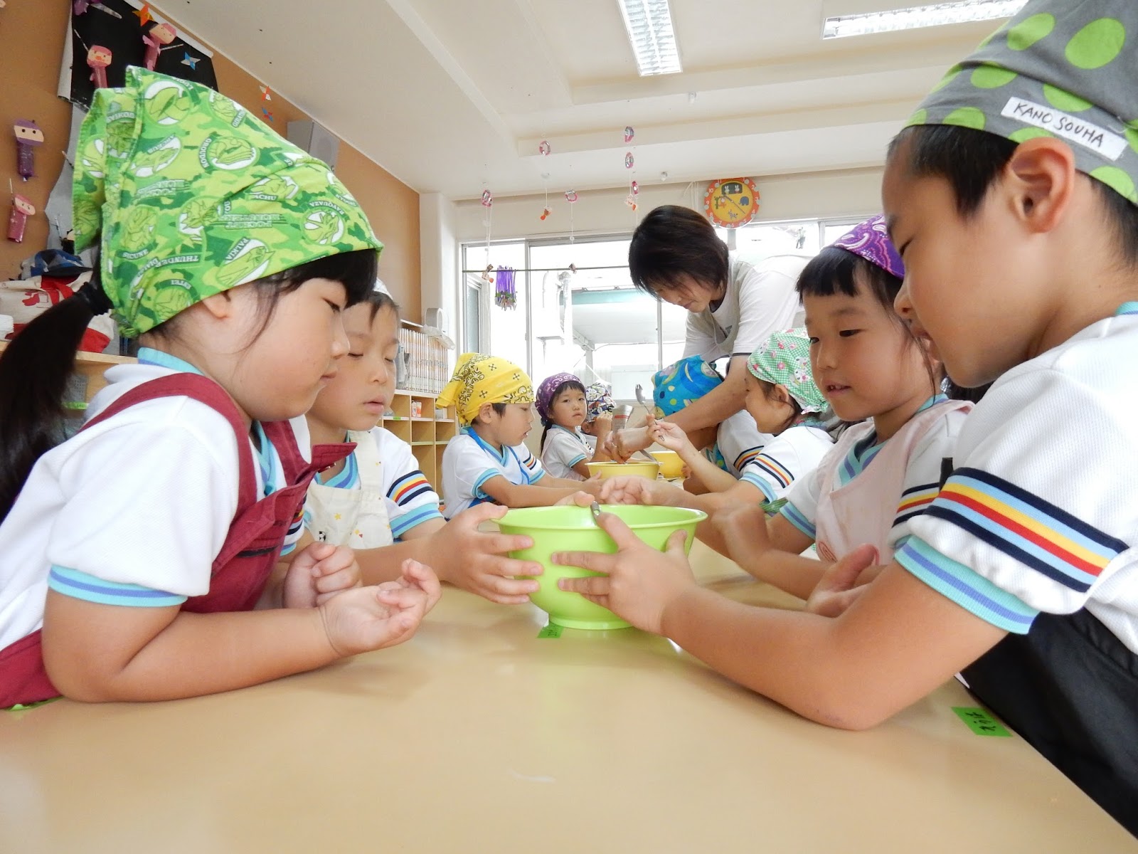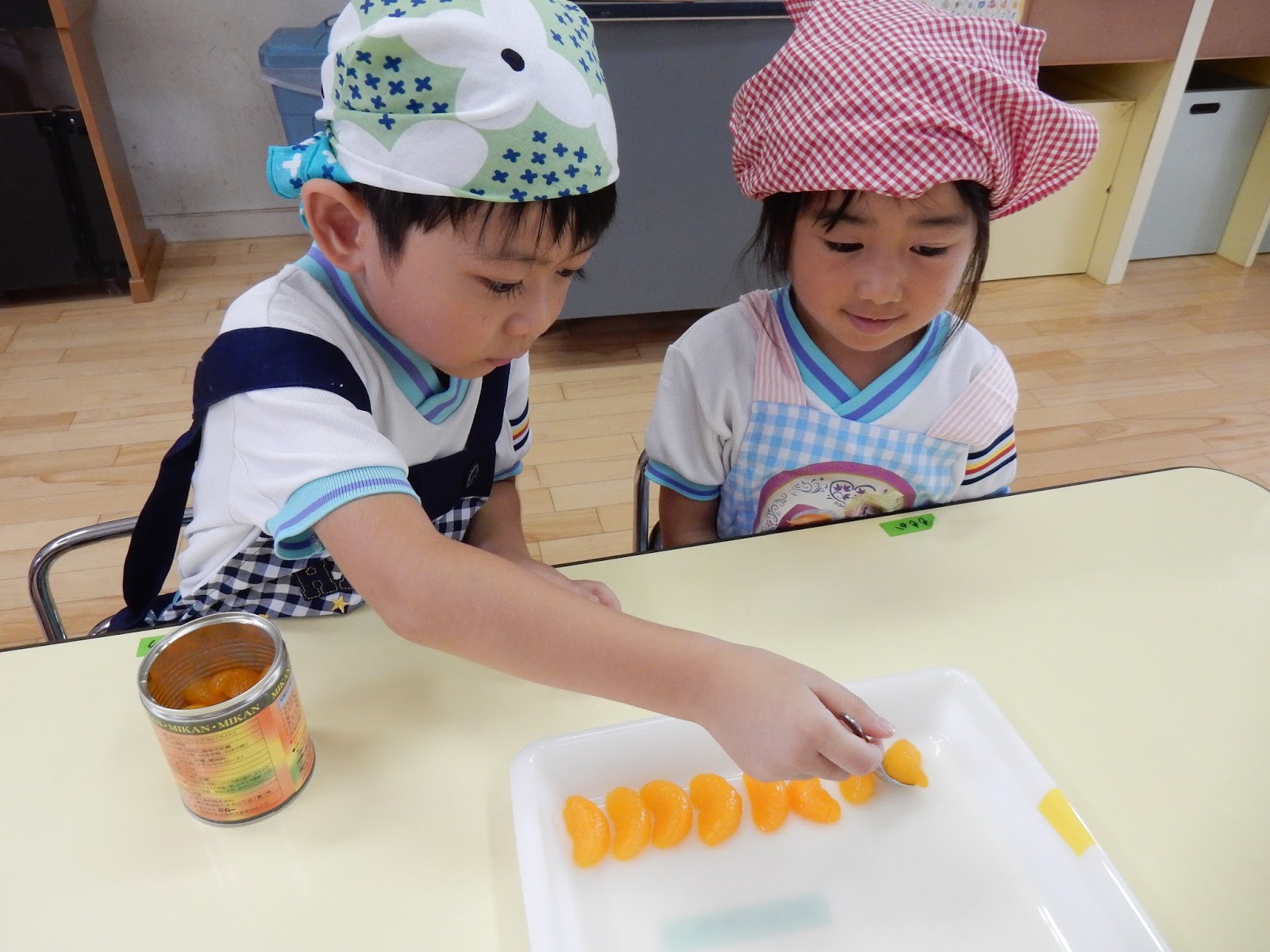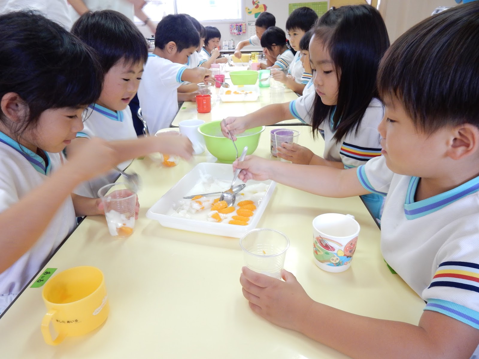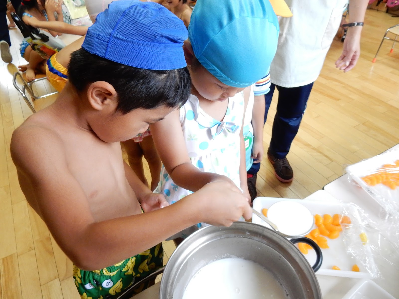 “いただきま~す”の後も、フルーチェだけ食べてみたり、牛乳寒天だけ味見したり、2つを混ぜて食べてみたり。午前中から楽しみにしていたみんな。おかわりまであっという間!でした♪