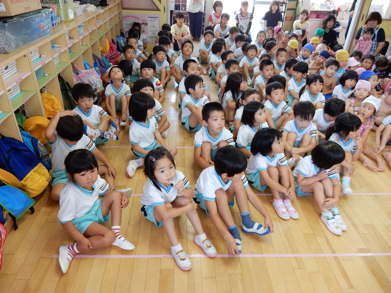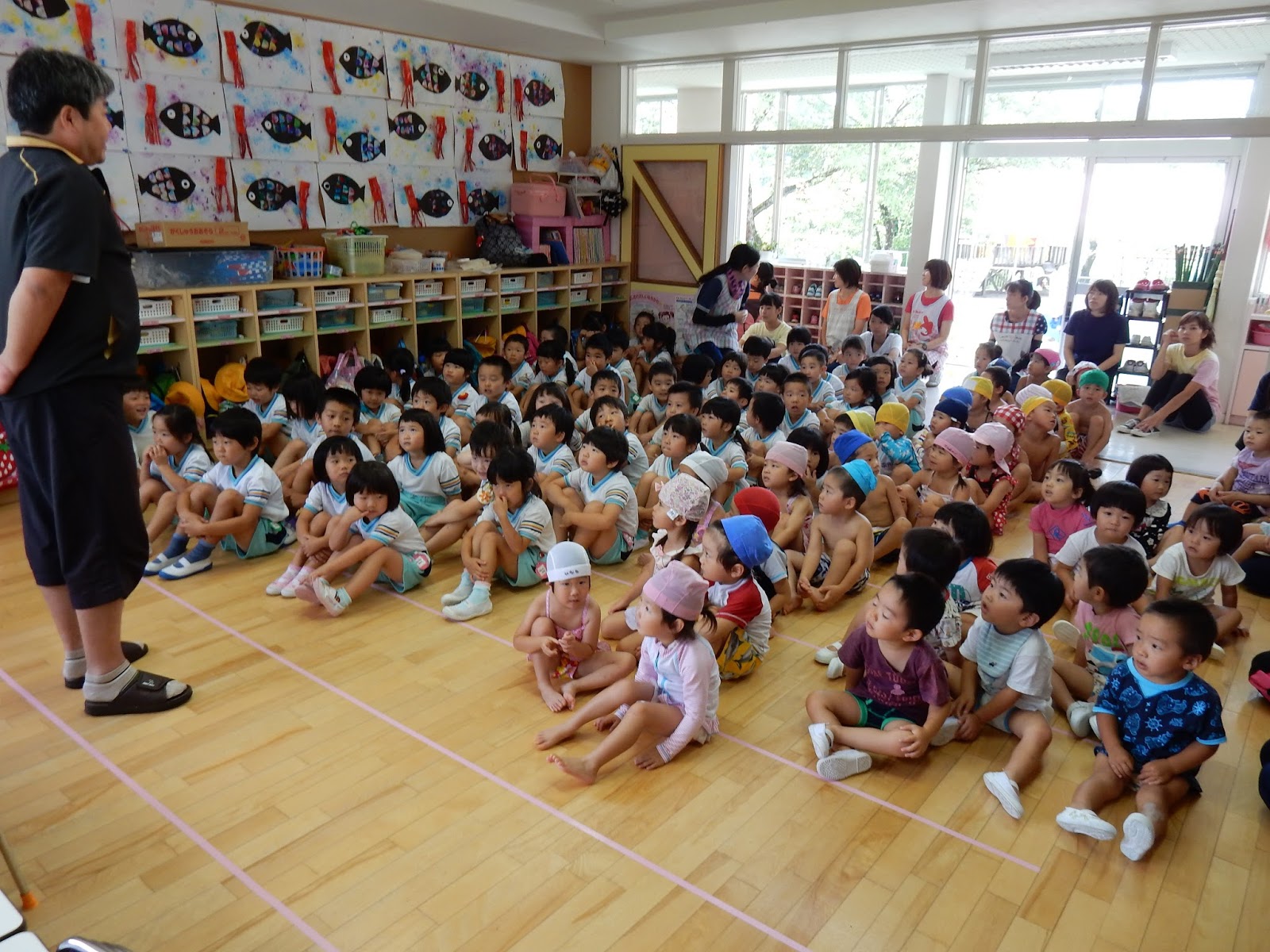 今日で1学期が終了です。今朝は、みんなで集まって、園長先生のお話を聞きました。『1学期には、どんな楽しい事があったかな??』という問いかけに対して、“ゆうすずみかい!” “えんそく!” “ハロウィン!!!”…???(笑)去年の思い出まで混ざっていましたが、4月からの生活の中で、たくさんの行事を経験し、初めての体験も多かったことと思います。
