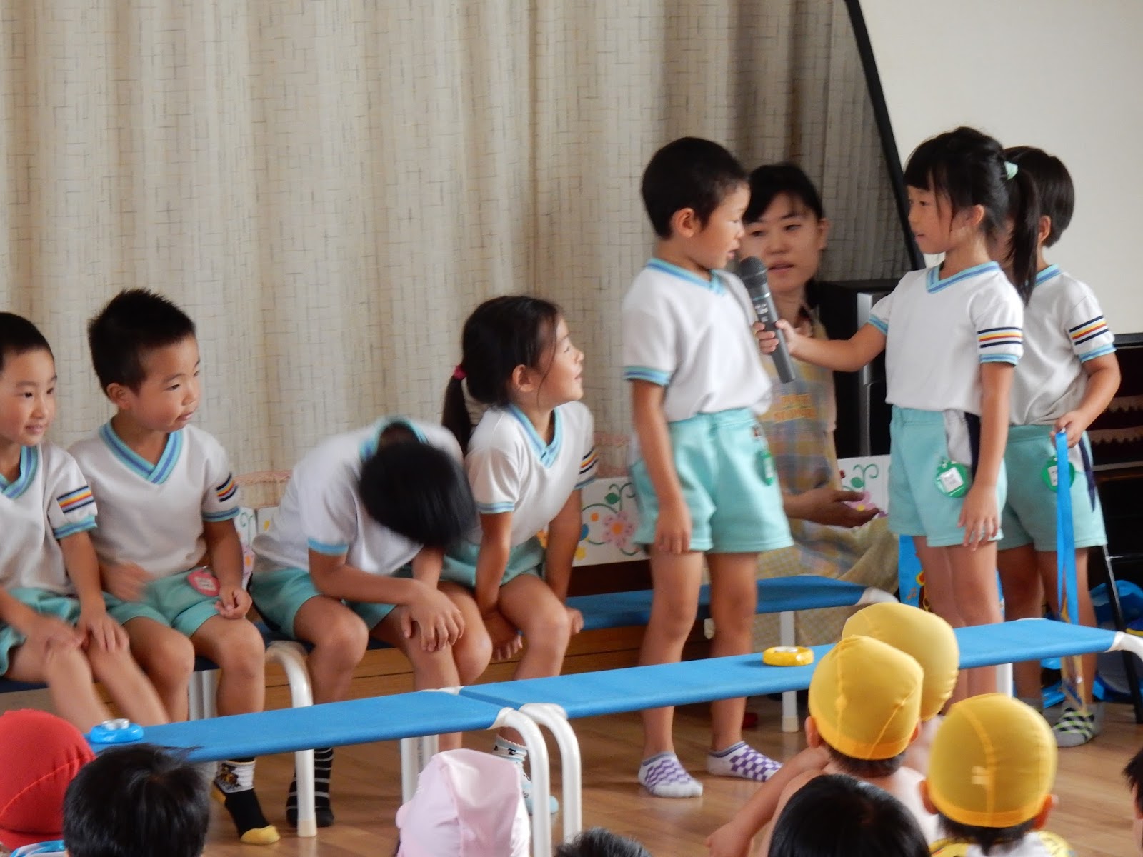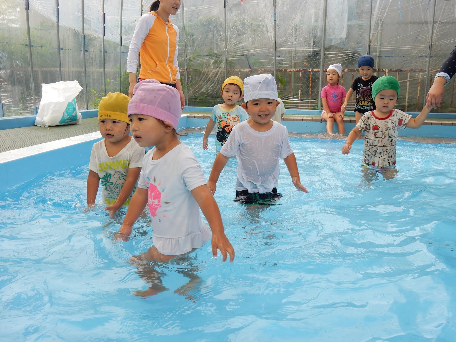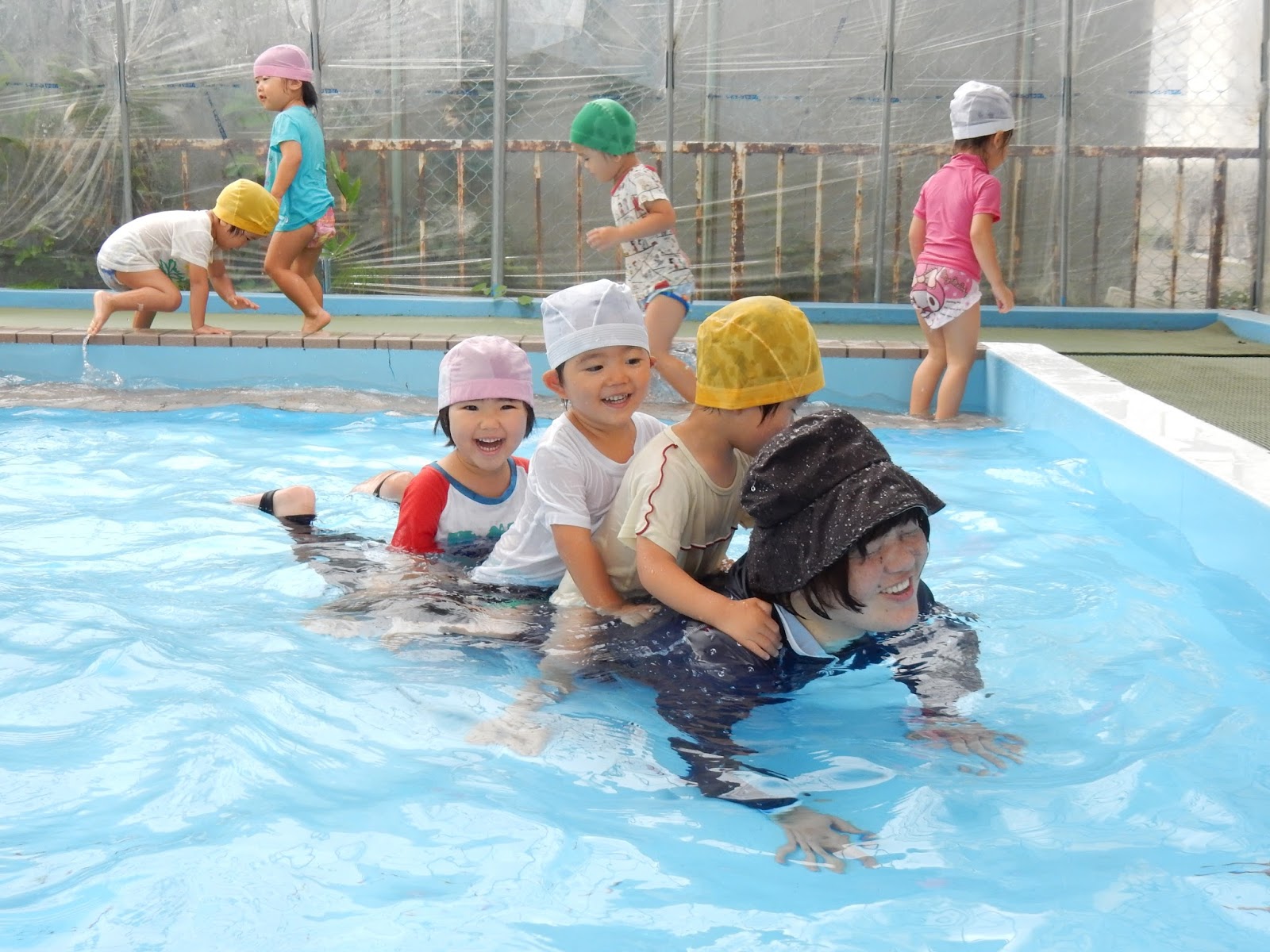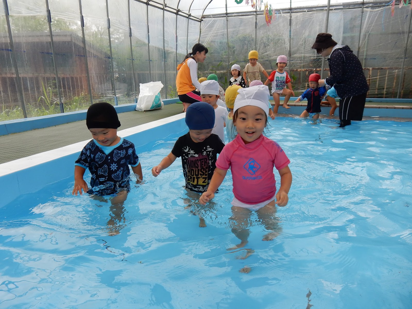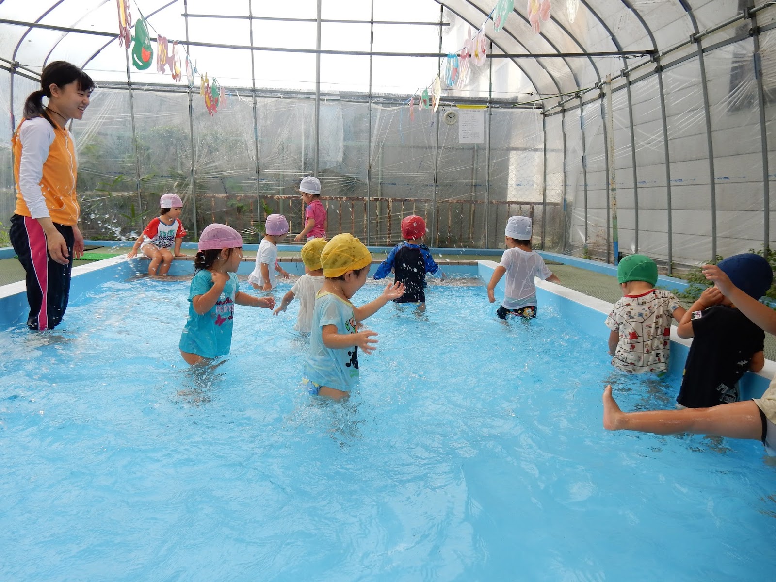 6月に始まったプール遊びを通して、最初は水が怖くて、顔にかかると泣いていた子や、ぷーるサイドで遊んでいた子が、ダイナミックに遊べるようになったり、友達が頑張る姿、楽しそうに泳ぐ姿を見て刺激を受け、泳ぐ練習をしたり、顔がつけれるようになったり。水遊びの準備をする中で、着替えが一人でできるようになり、衣服をたたんだり、体を拭いたりという生活習慣においてもずいぶん成長が見られたようです。
