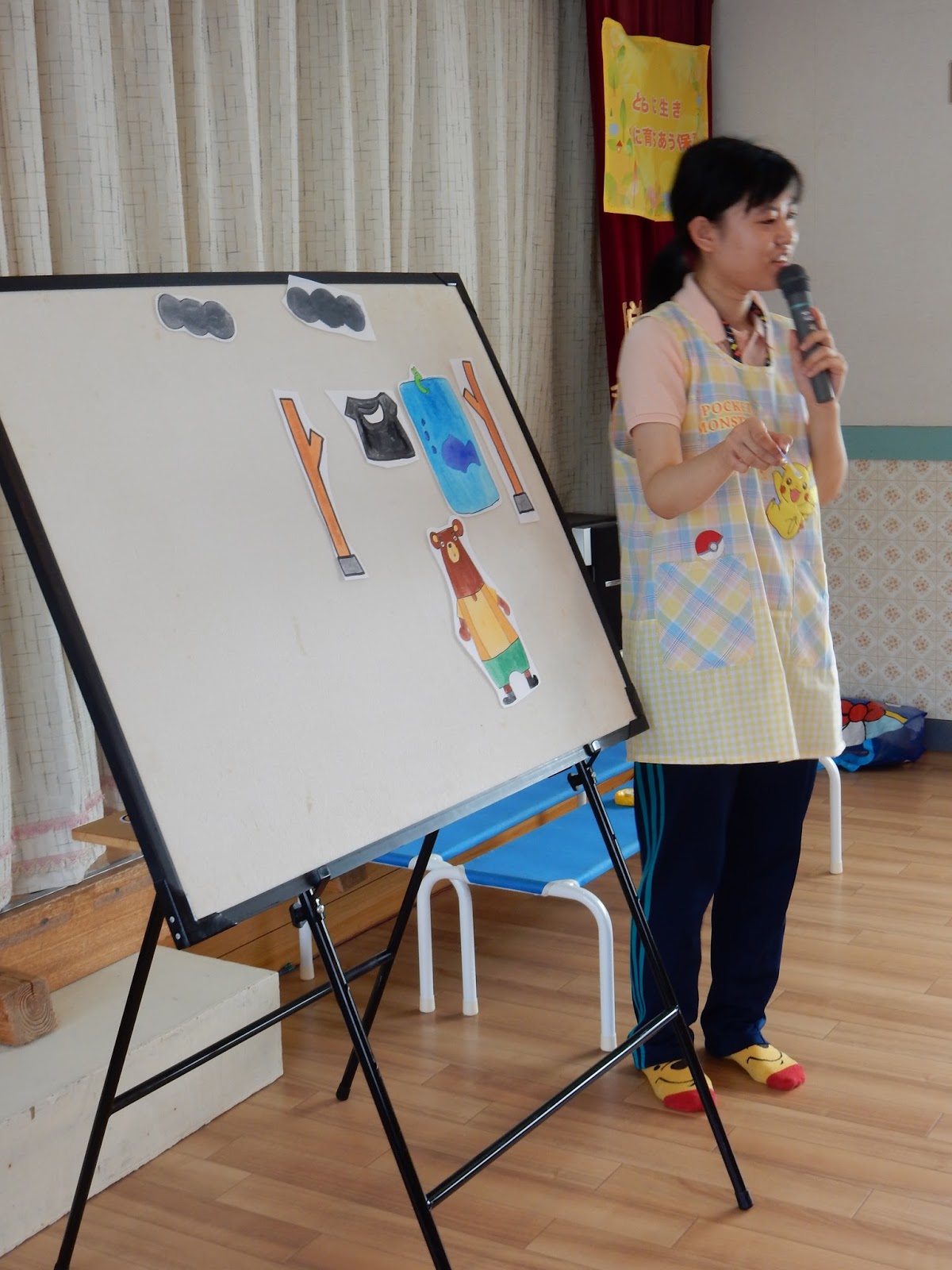 ローソクを吹き消して、お歌をうたってもらった後は、あやか先生がお話を1つ見せてくれました。動物森に干してあったお洗濯もの。最初はいいお天気だったけど、そのうち雲がモクモク…みんなで、『雨が降りそうだよ~!!』と大きな声で教えてあげました。お布団を干していたネコさんとは、内緒のお約束をしていたみんな…ちゃんと覚えていてくれたかな(笑)