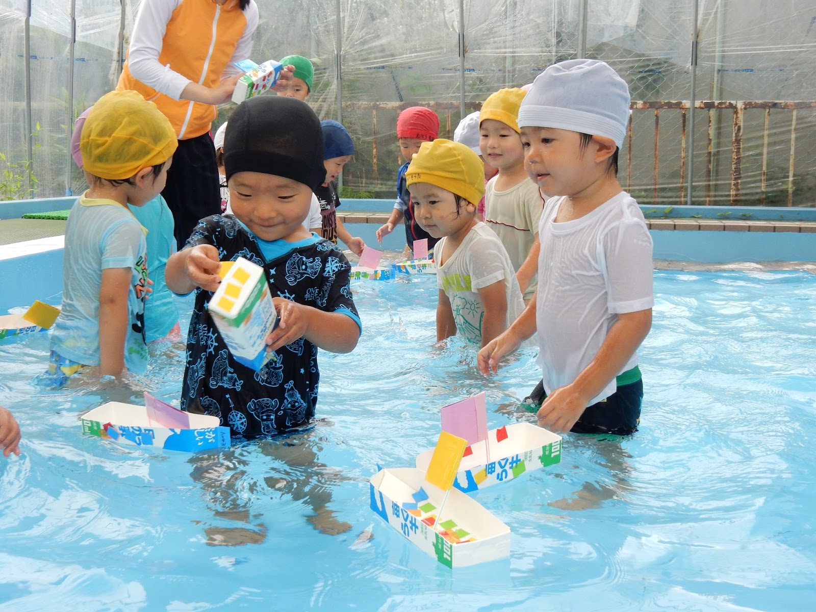 プールの中を歩き回ったり、思い切ってワニ歩きをしてみたり、手作りの船を浮かべて遊んだりと、満喫していました!