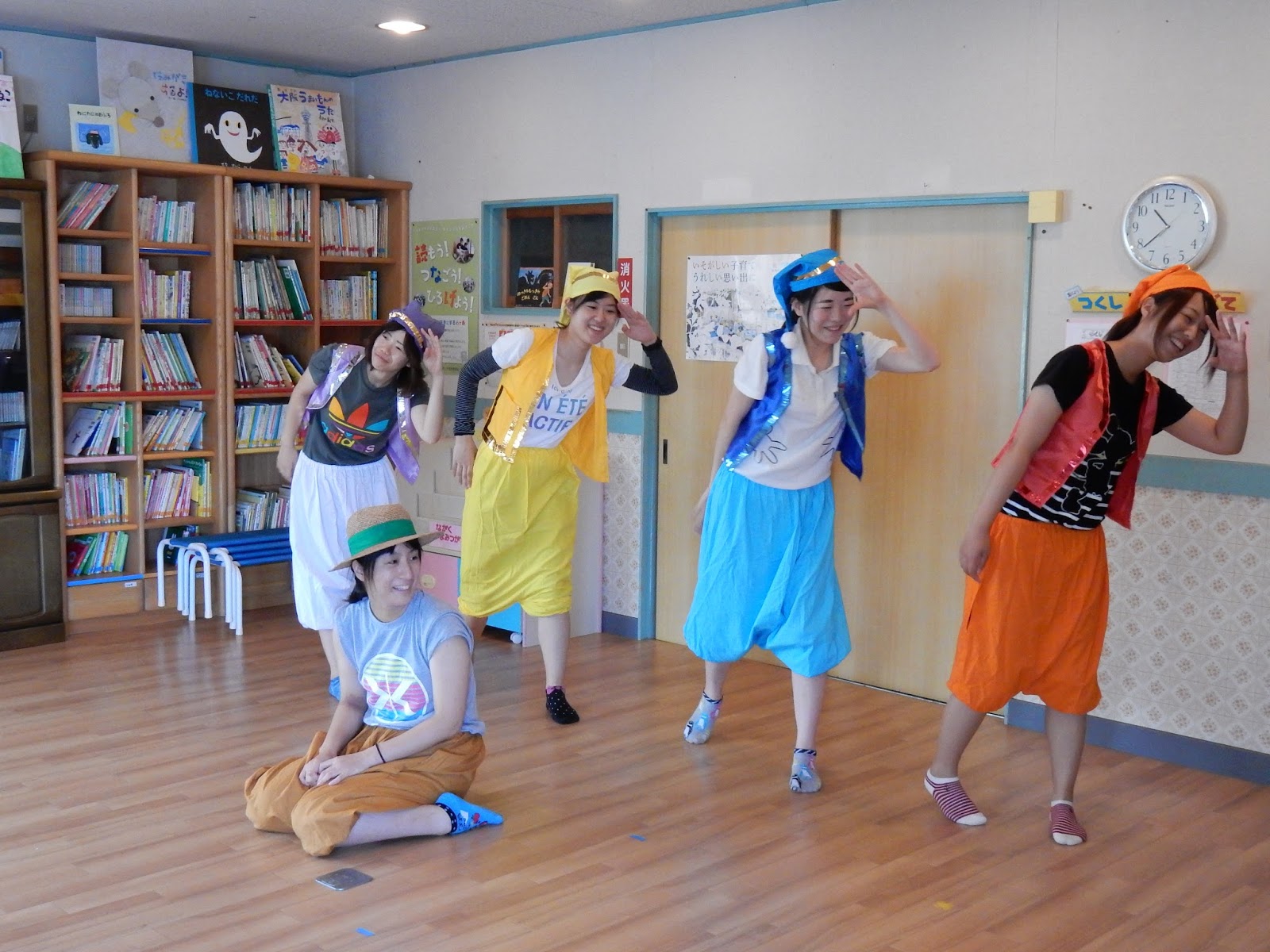 今月の先生たちからのプレゼントは、保育士劇。先生たちが着替えて準備をしている間に、手遊びをして待っていたみたいです。