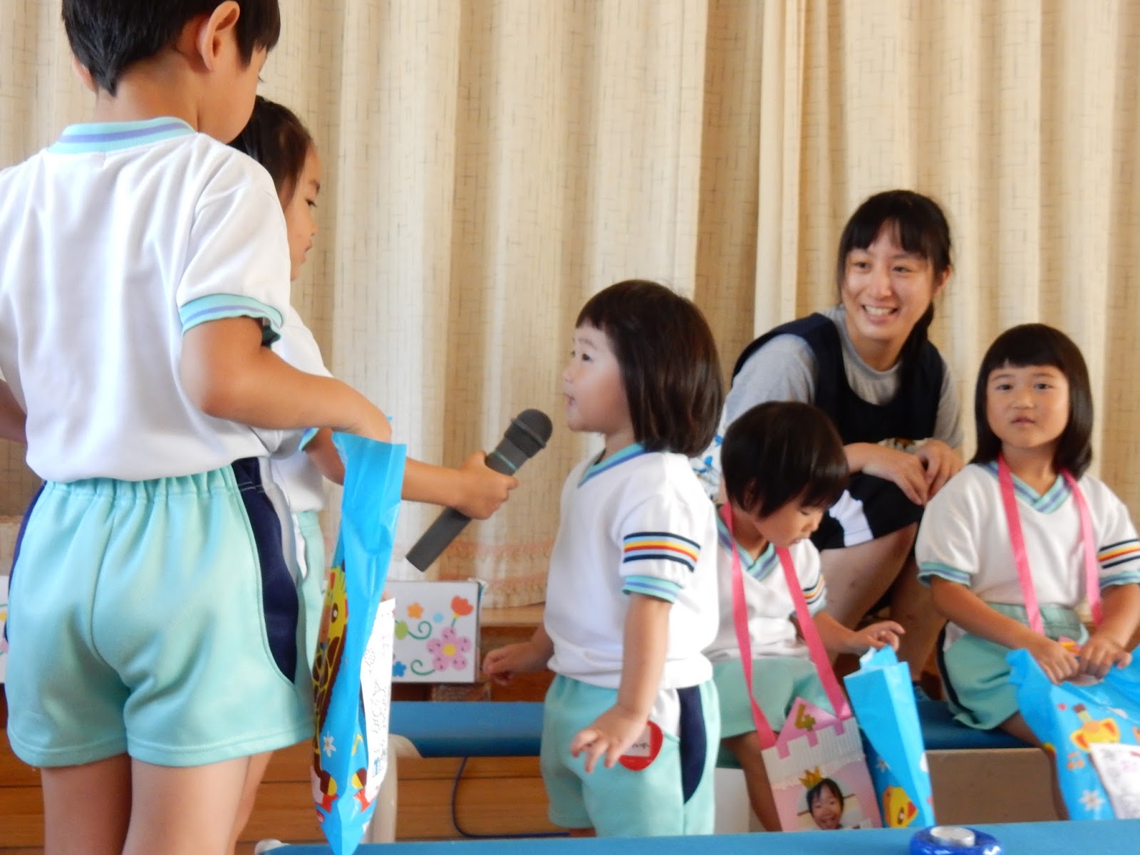 インタビューをしたり、プレゼントをもらったり、半年たつと、みんなもすっかり流れが分かってきたみたいですね!小さいお友達がお名前を言ったり、一生懸命指で年齢を伝えてくれる姿はかわいらしいですよね。大きいお友達は、堂々としていて、1つ大きくなってたくましい雰囲気です。