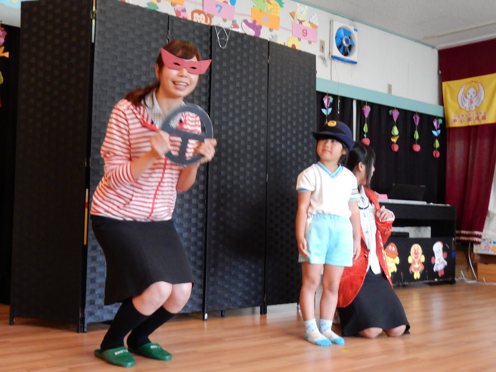 警察官に変身して、こんな時はどうする??という問いかけに答えます。『一緒に遊びに行かない??』 『いやだ!!!』 『いなくなった子犬を探してくれない??』 『いかない!!』