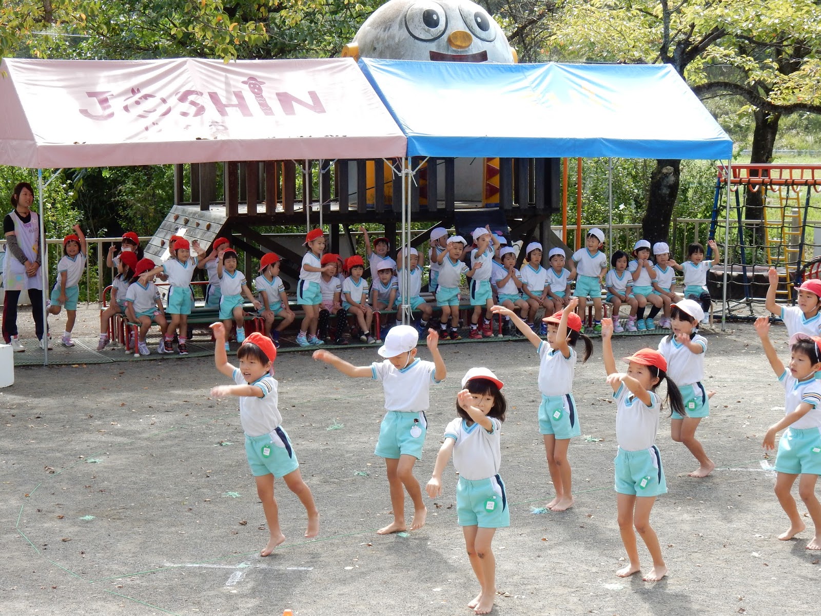 ひまわりさんが練習する奥では、ダンスの振りを覚えたゆりさんも張り切って踊っています。こんな風に、楽しく練習をしてきた成果を、お家の人に見てもらえることを、とっても楽しみにしています。今日はこれから明日に向けて準備です。午前保育への御協力、ありがとうございます。また、役員さんには、準備から当日の運営までお世話になりますが、よろしくお願いします。素敵な運動会が迎えられますように!