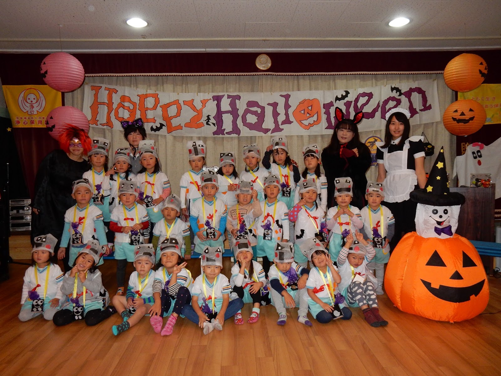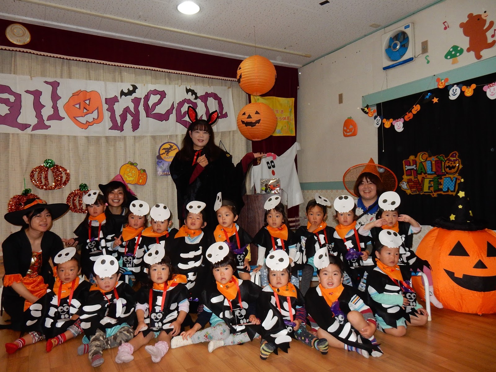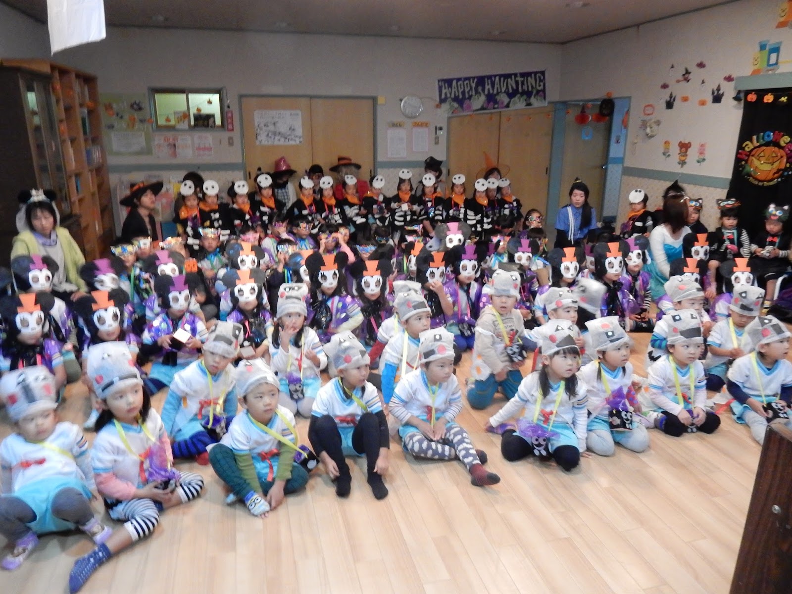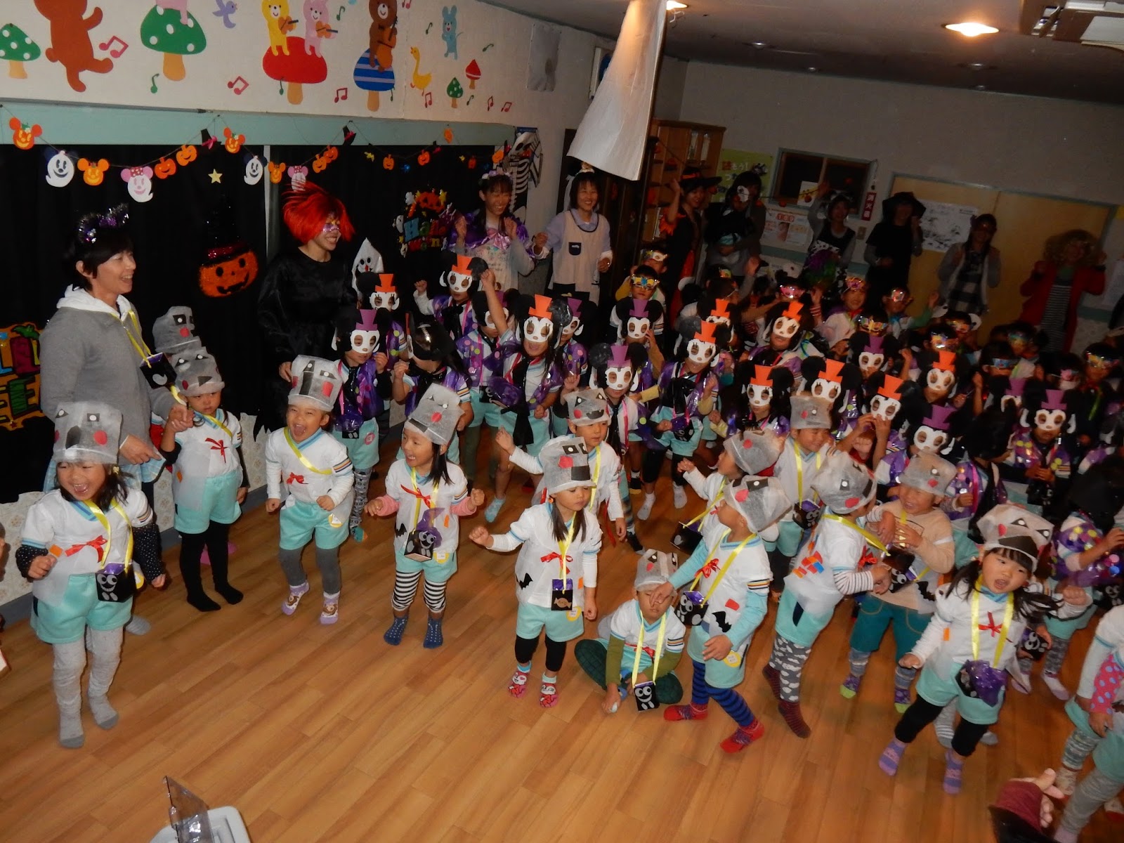 会館は、ハロウィン一色!!たくさんカボチャを飾って、オバケも飾って、ちょっぴり暗い雰囲気に、英語の音楽。いつもと違うのは、会場だけではありません!子ども達は、みんなかわいく変身してから集まりました!今年の仮装は、黒猫、ホラーマン、おばけ、ミッキー、魔法使いと様々!各クラス、いろんな工夫が見られました!子どもたちだけでなく、職員も、仮装バッチリで楽しみました!写真をよーく見ると、いつものエプロン姿とは全く違う姿が…♪