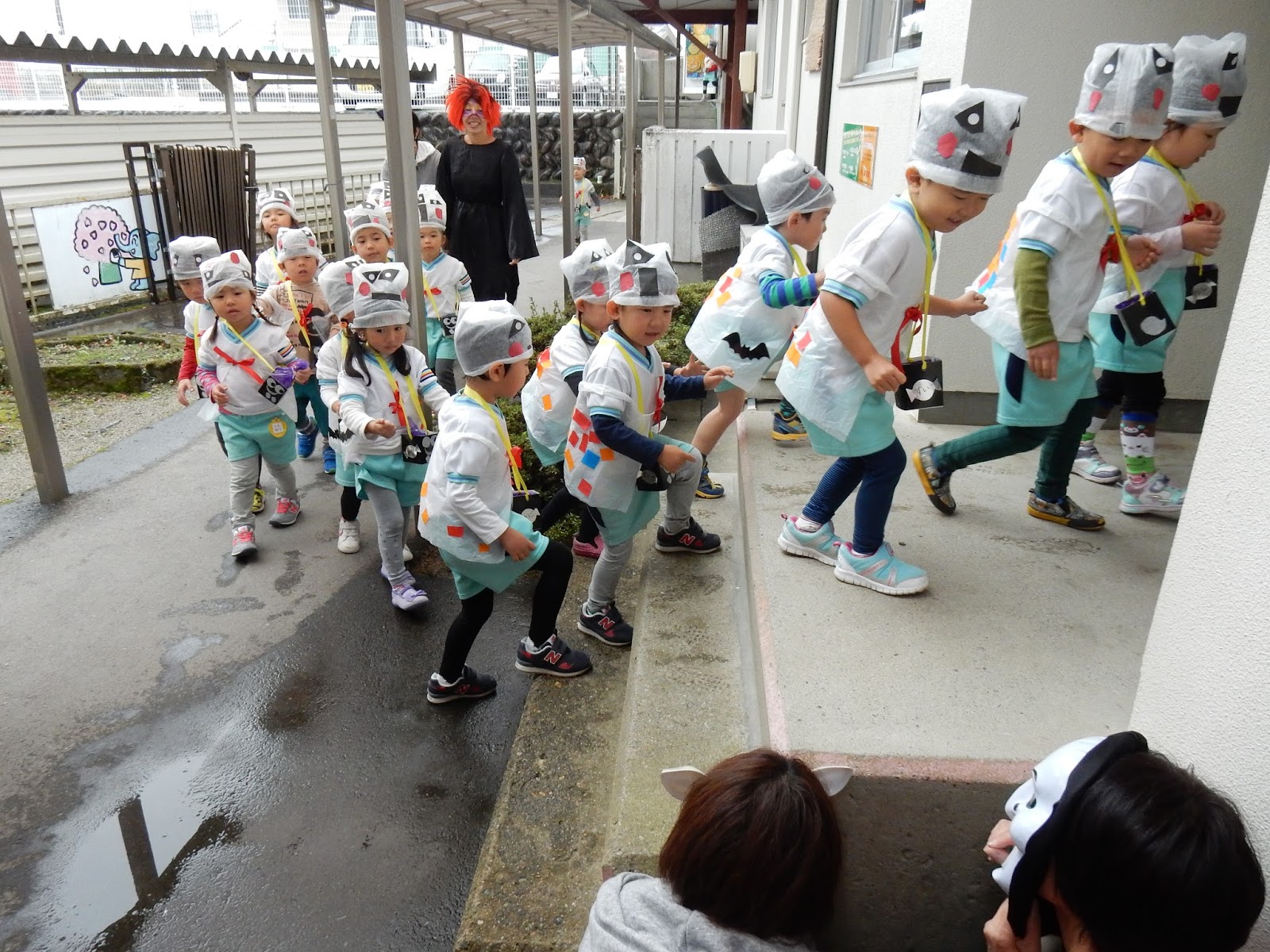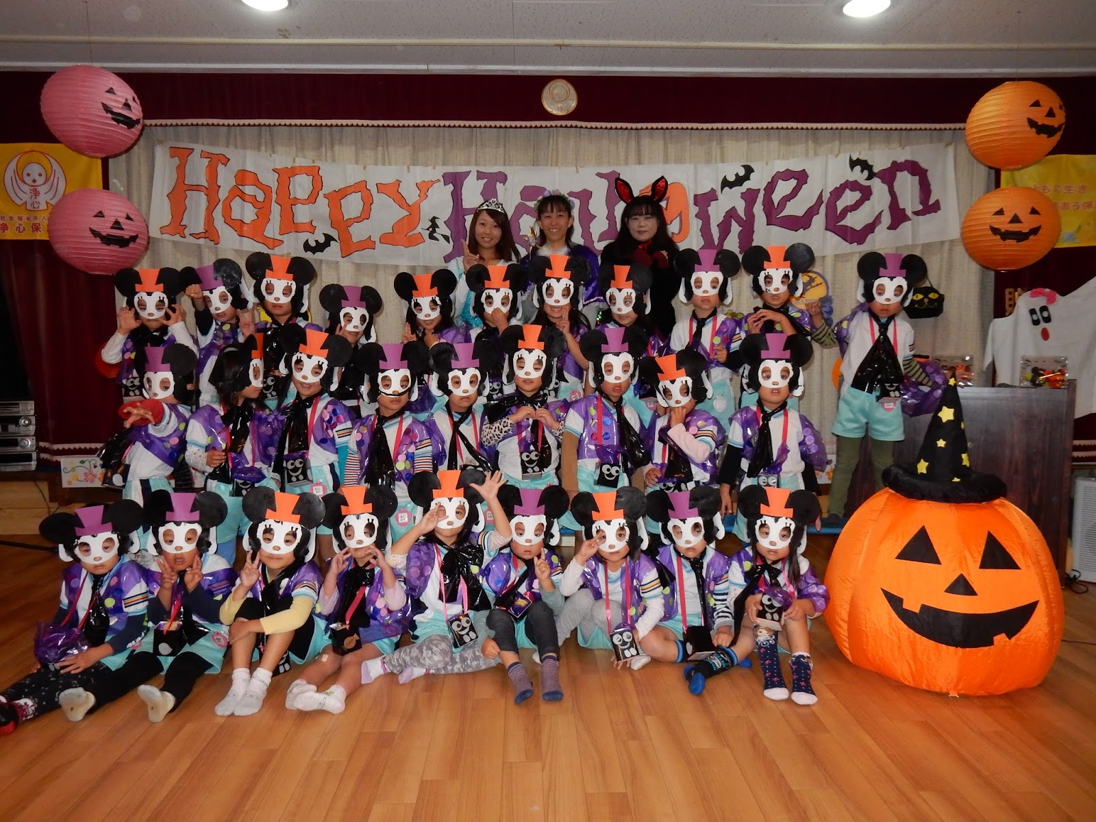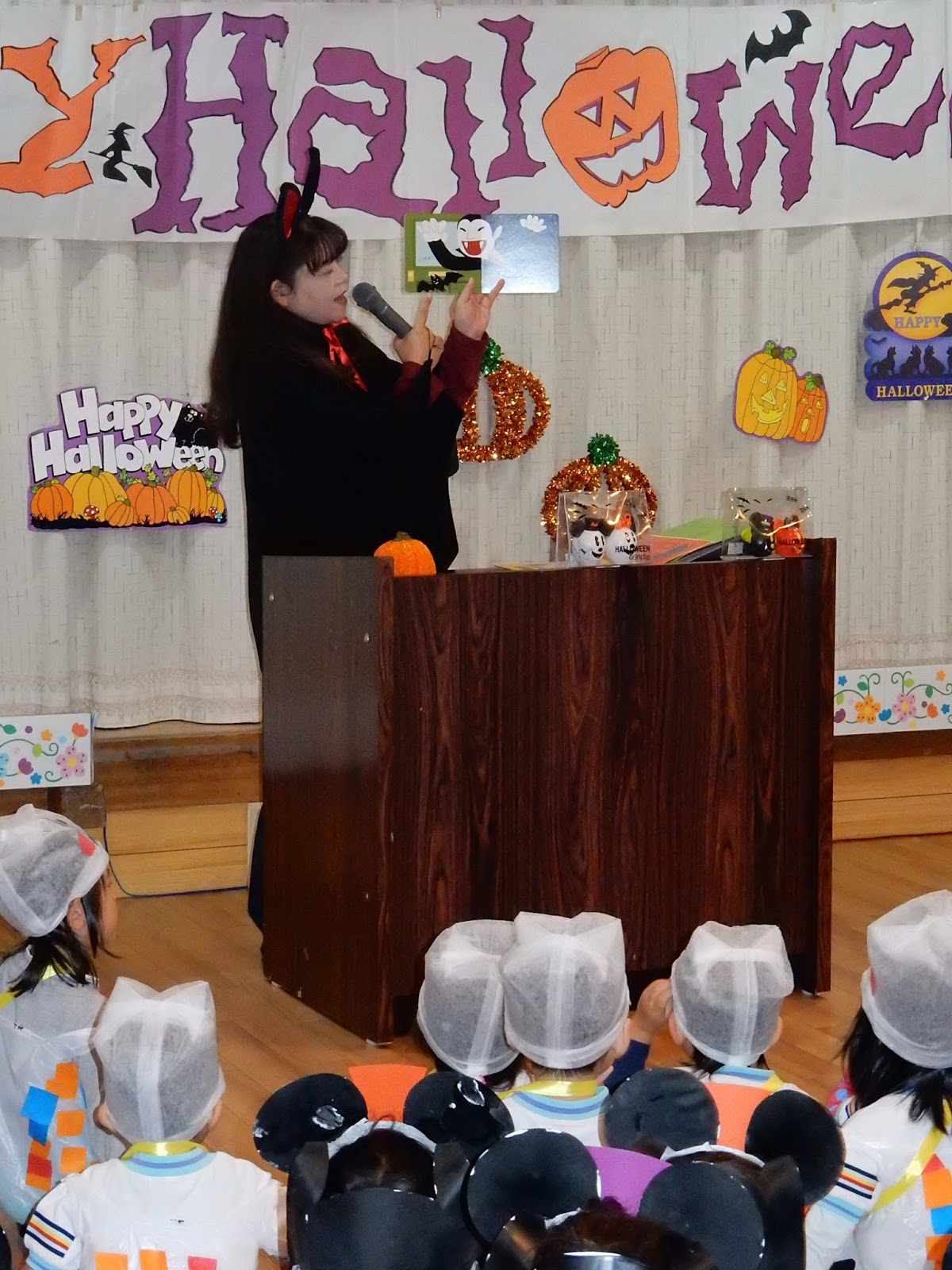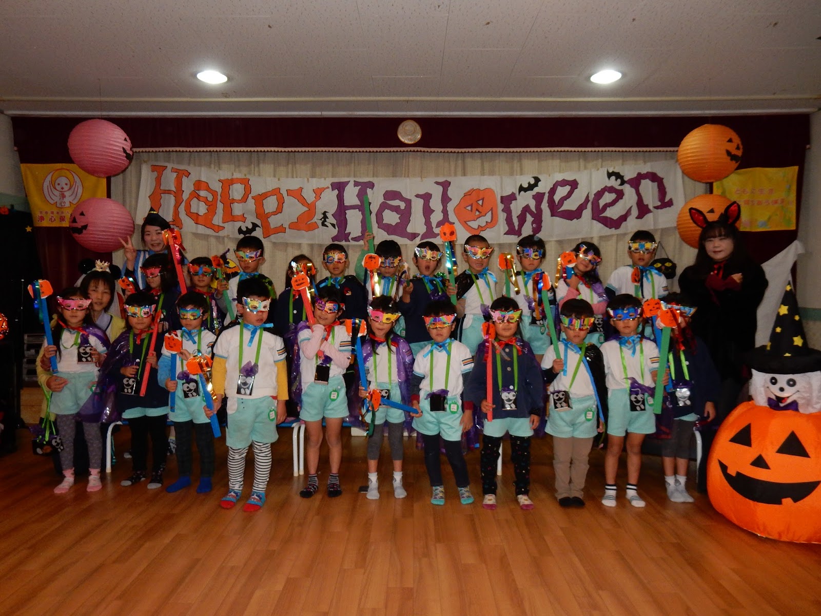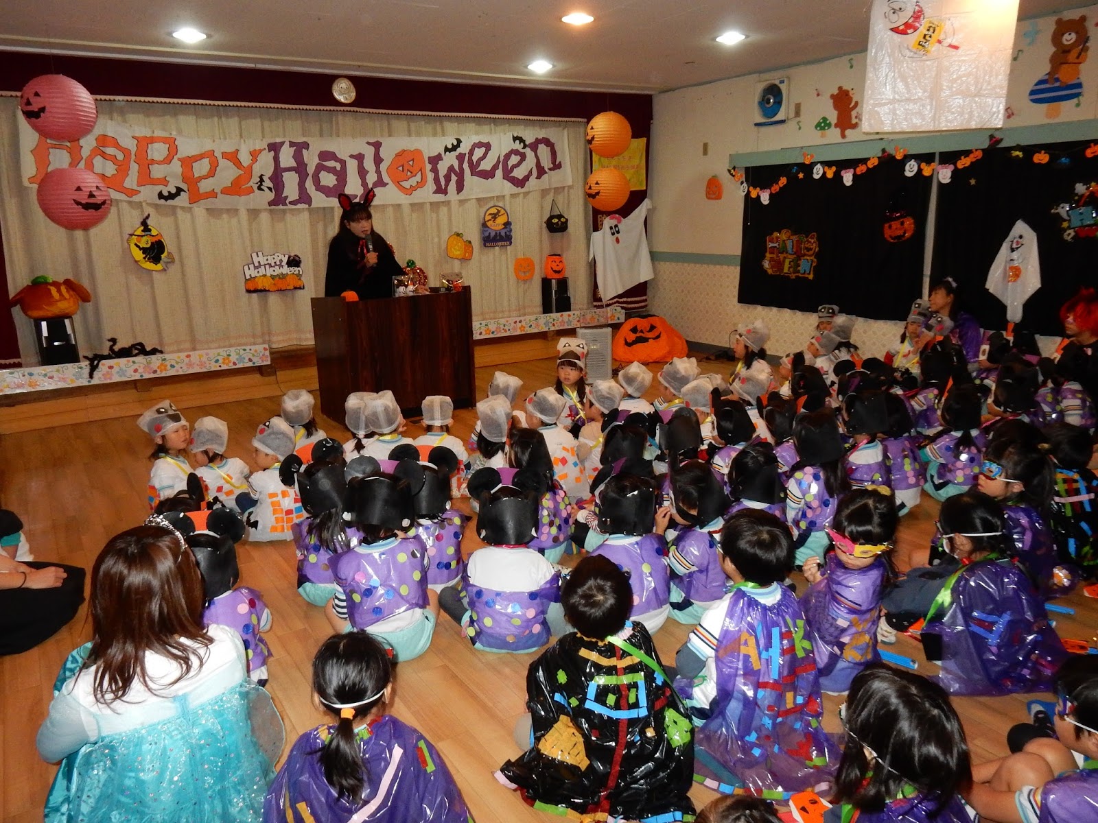 会館は、ハロウィン一色!!たくさんカボチャを飾って、オバケも飾って、ちょっぴり暗い雰囲気に、英語の音楽。いつもと違うのは、会場だけではありません!子ども達は、みんなかわいく変身してから集まりました!今年の仮装は、黒猫、ホラーマン、おばけ、ミッキー、魔法使いと様々!各クラス、いろんな工夫が見られました!子どもたちだけでなく、職員も、仮装バッチリで楽しみました!写真をよーく見ると、いつものエプロン姿とは全く違う姿が…♪