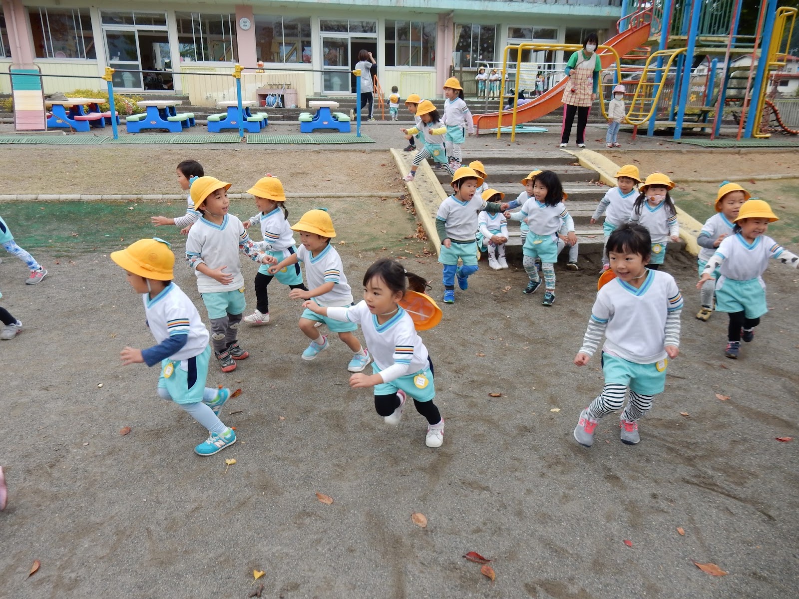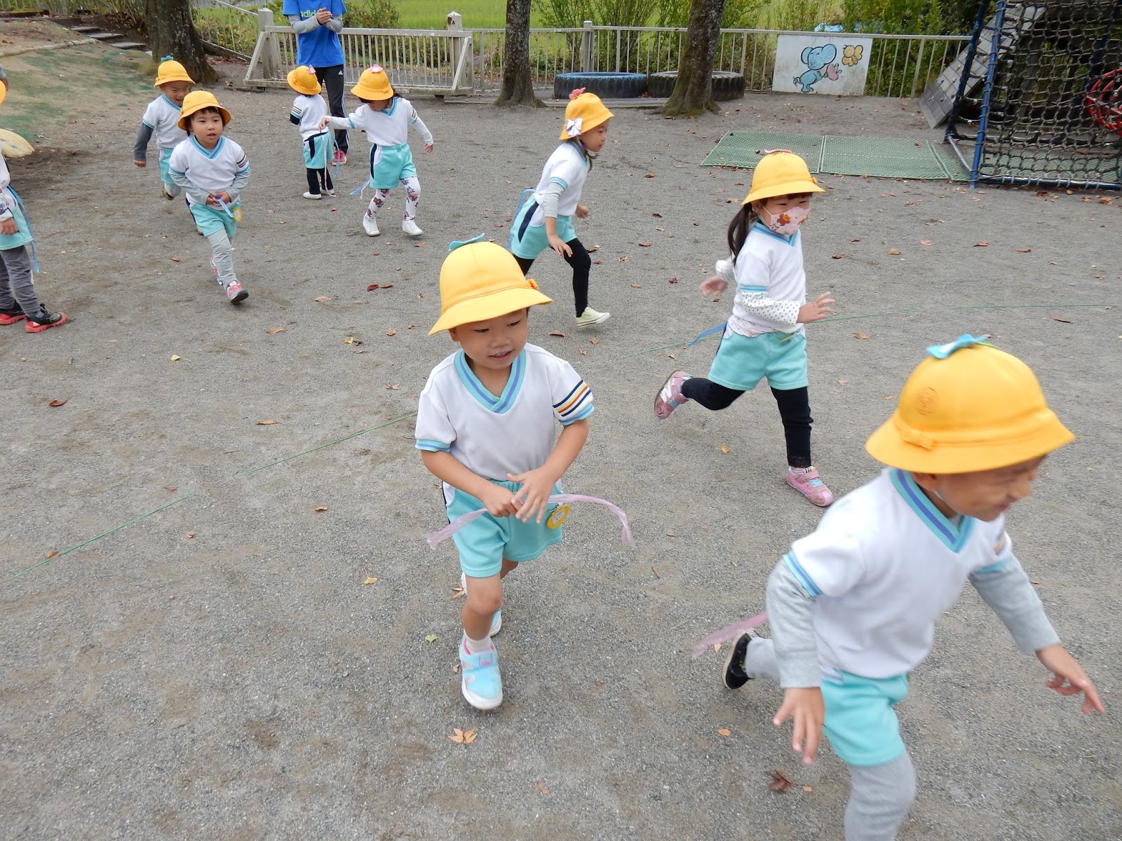 大好きなあそびを見つけてじっくり取り組む時間も大切です。また、こんな風に、クラスのみんなと一緒にルールのある遊びを行う中で、社会性が身に付いたり、お友達の良さに気がついたりもできるんです。運動会を終え、クラスのまとまりも深まってきたこの時期からは、こんな遊びも活発になります。力いっぱい走ることで、ちょい体作りにもつながりますね!