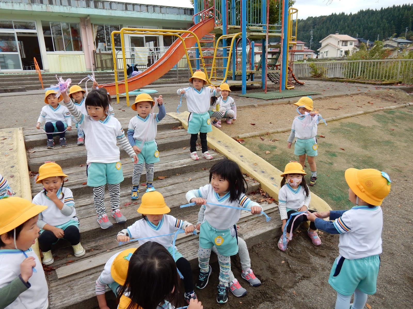 運動会の時に、ひまわりさんが親子で行ったおんぶ騎馬戦。普段保育園では、おんぶはしずに、逃げる人と、鬼に分かれてしっぽ取りゲームとして楽しんでいるんです。そうです、この紐は、しっぽだったんです!